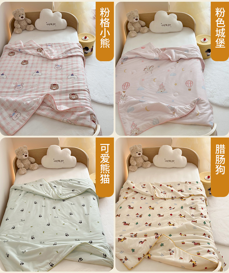 (总)嗨生活 2025新款全棉双层纱豆豆被 儿童被 春秋被 冬被 幼儿园被子,草莓兔兔,花丛小兔,米菲兔,汽车乐园,挖机恐龙,玩具屋,小海豚,熊猫盼盼