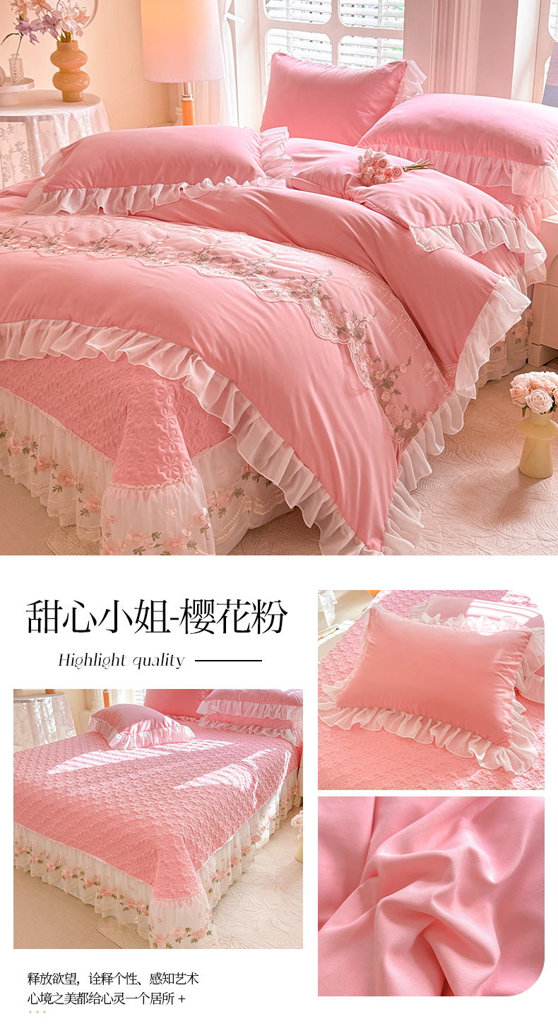 大麦家纺 2025新款亲肤花边款床盖四件套 甜心小姐-樱花粉