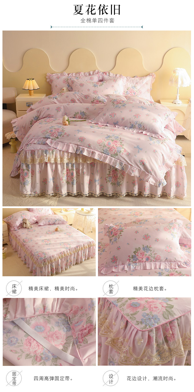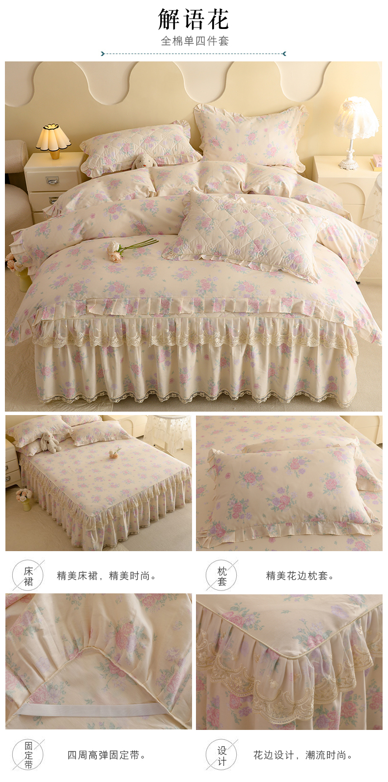 (总)美达家纺 2025新款全棉纯棉AB版蕾丝小花边单层床裙四件套,解语花,南湘,沁雨花叶,悦棠