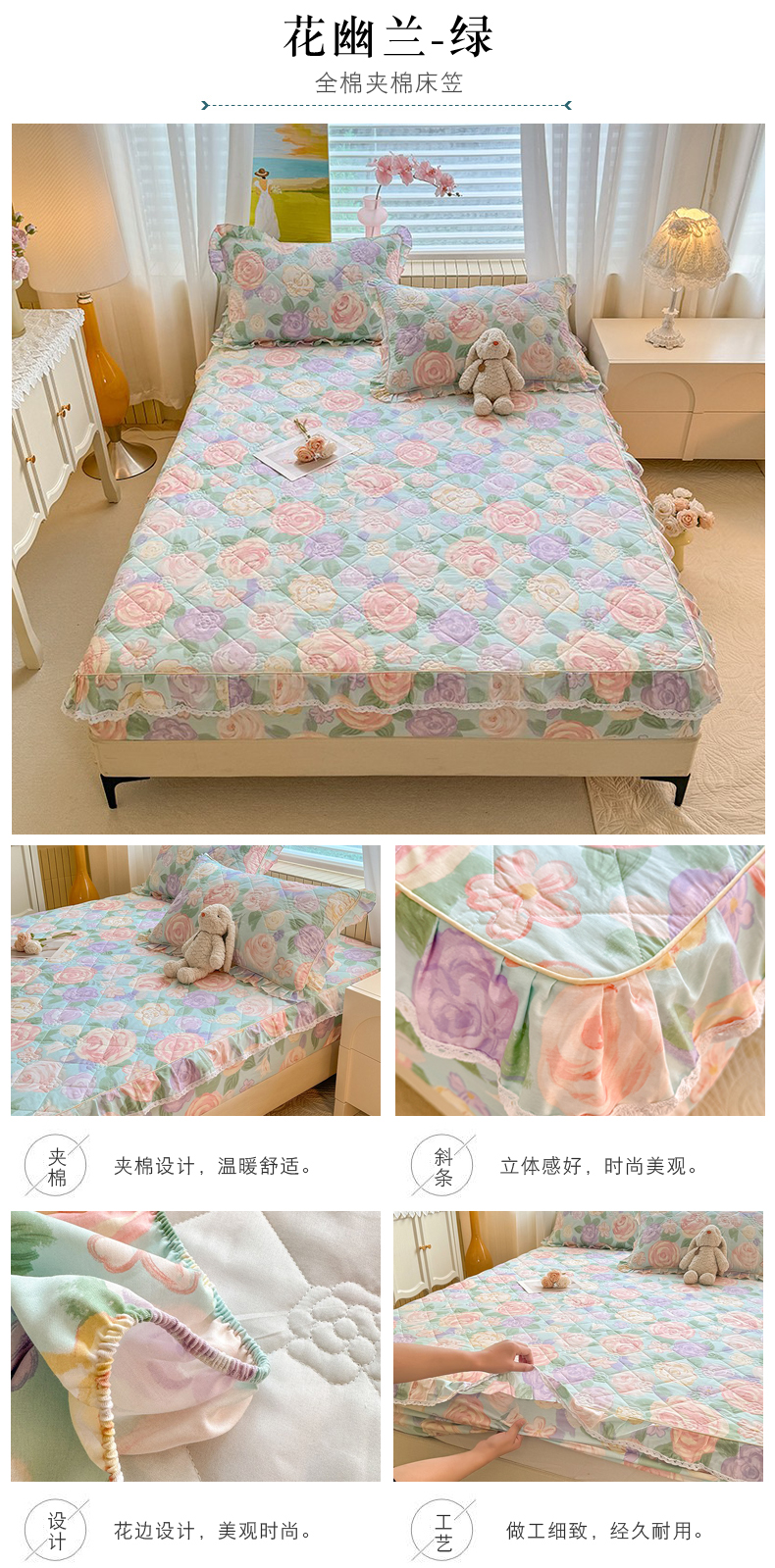 美达家纺 2025新款全棉印花夹棉床笠 花幽兰-绿