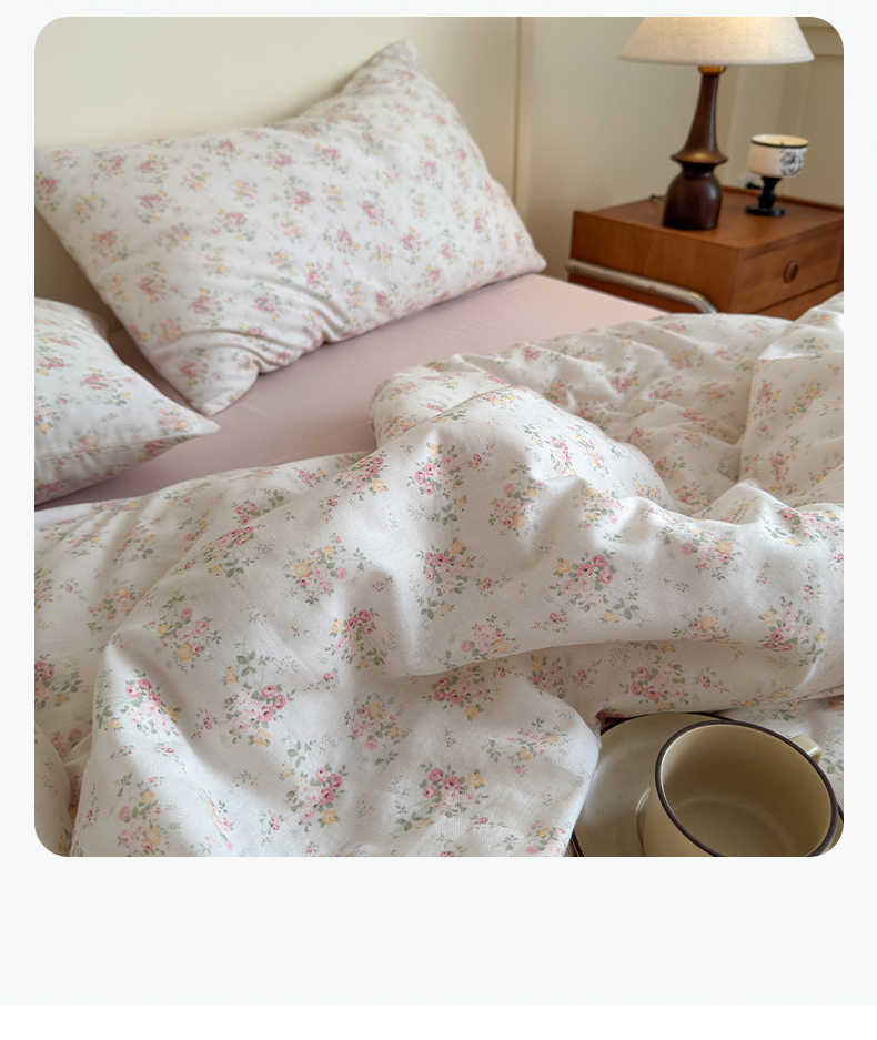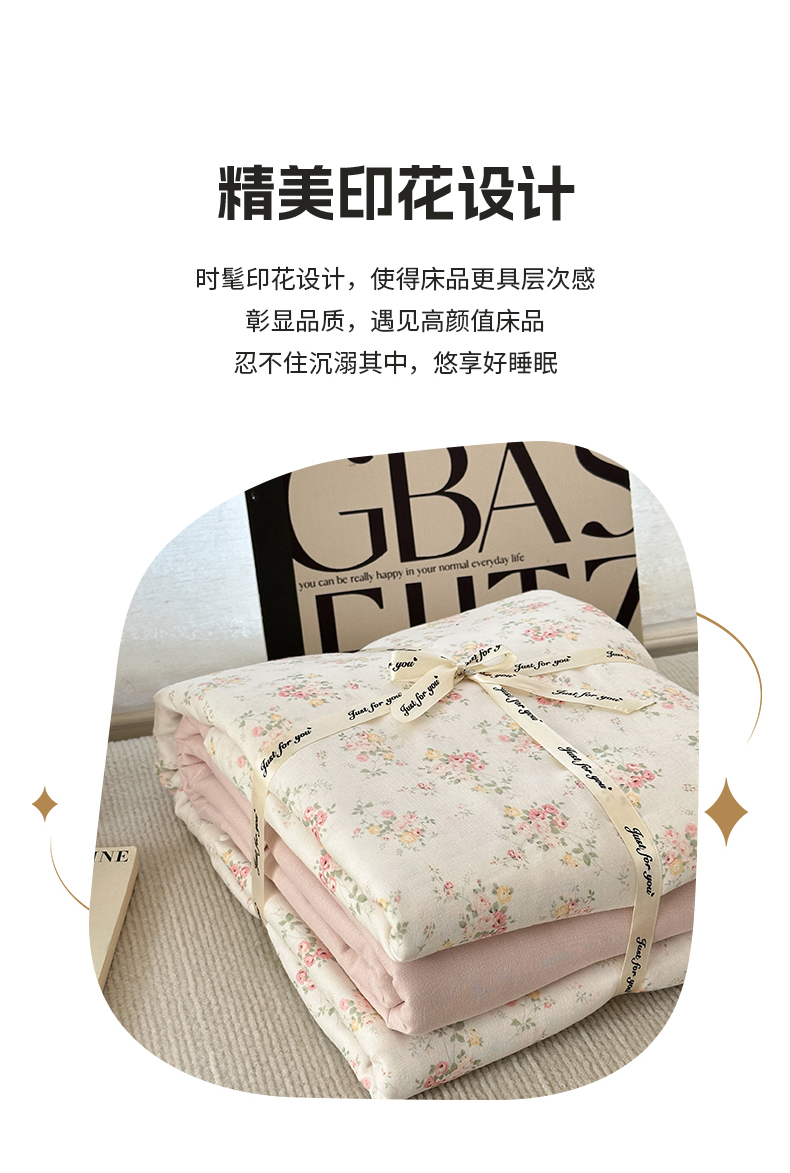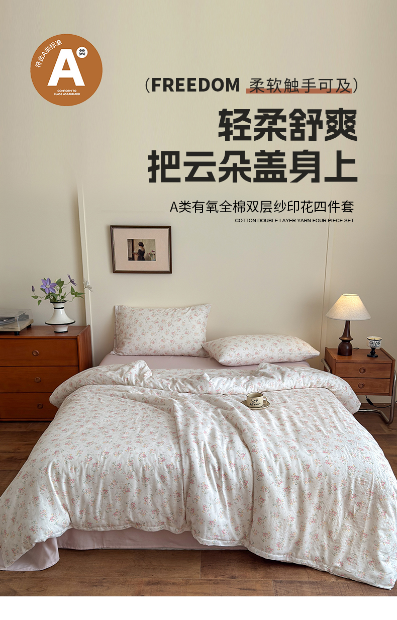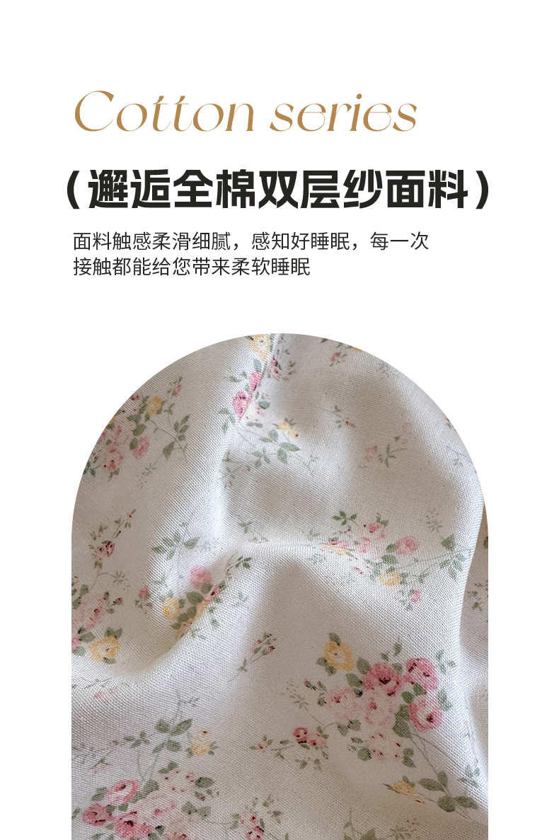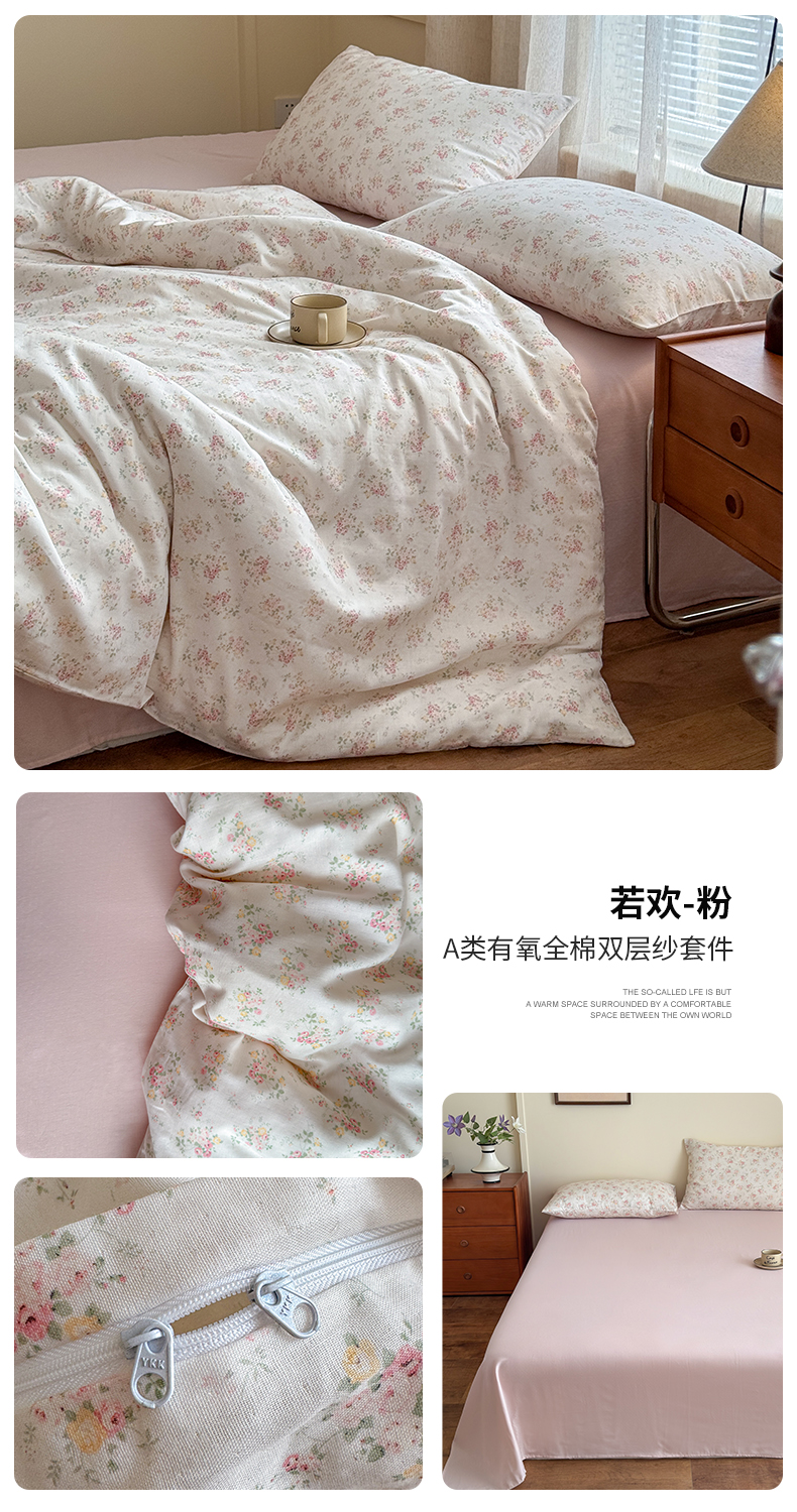 当前位置: 91家纺网 > 商品网购 > 床品套件 > 四件套 > 双层纱四件套 > 亿梵家居 2025新款A类母婴级有氧全棉纯棉双层纱纯棉印花四件套-床拍图 若欢-粉
