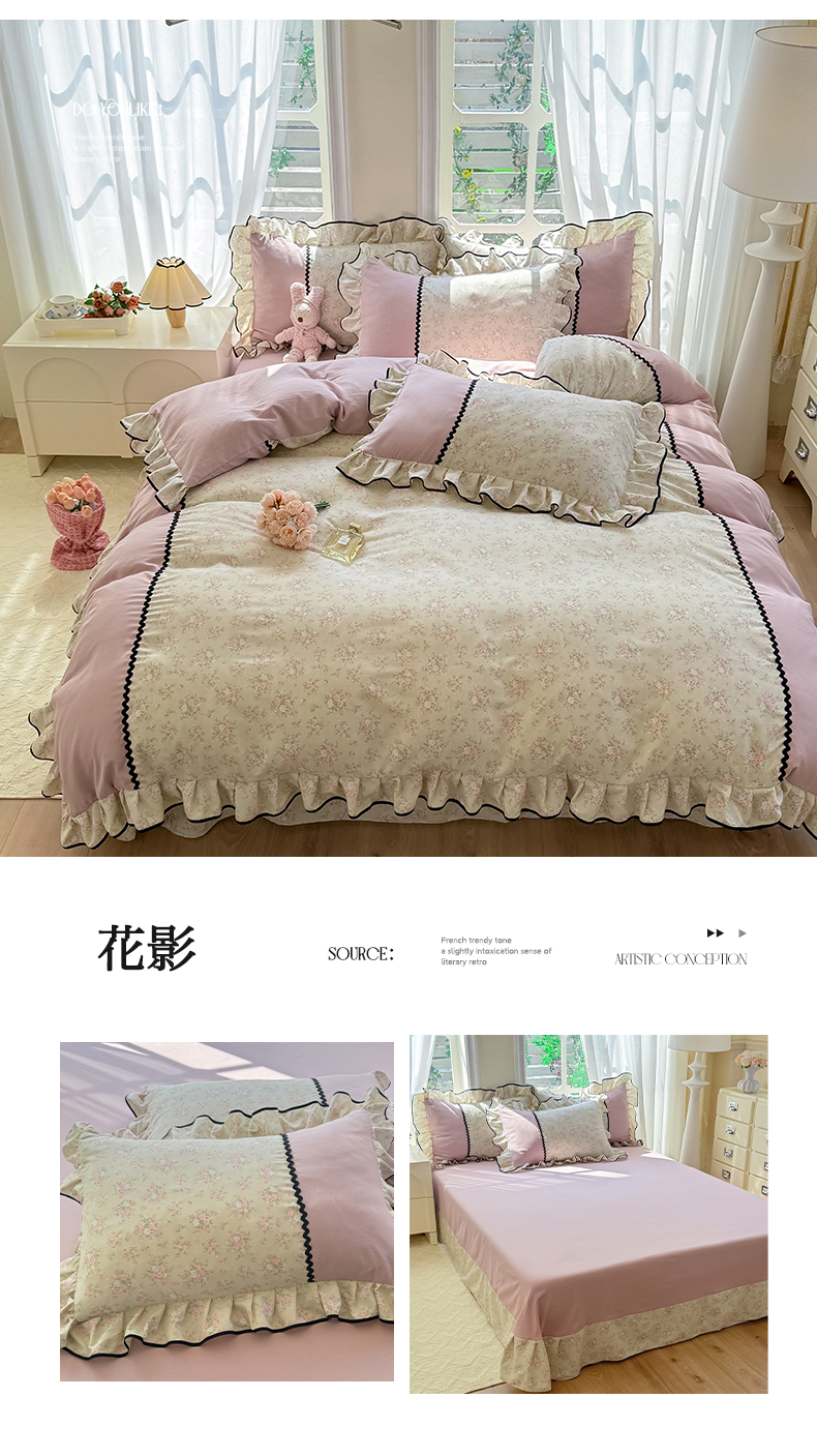 商品名称:大麦家纺 2025新款韩式花边亲肤棉四件套 花影