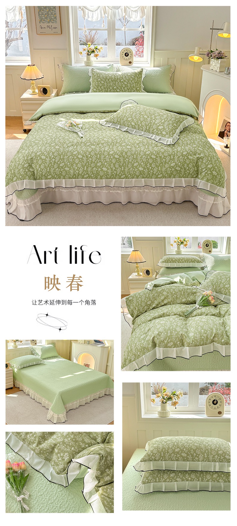 (总)金艾草 2024新款水洗全棉浮雕提花床盖四件套,圣罗纳-灰,片叶情-豆绿,罗曼-浅绿,蜀锦-茉莉白,轻颜-珊瑚粉