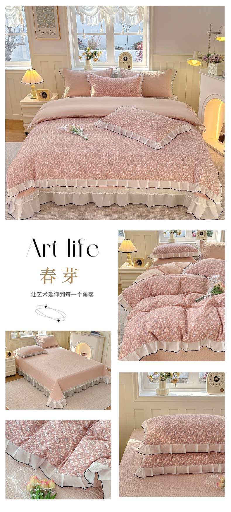 (总)金艾草2026新款针织棉印花花边床盖款四件套
