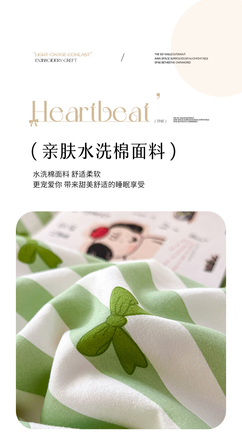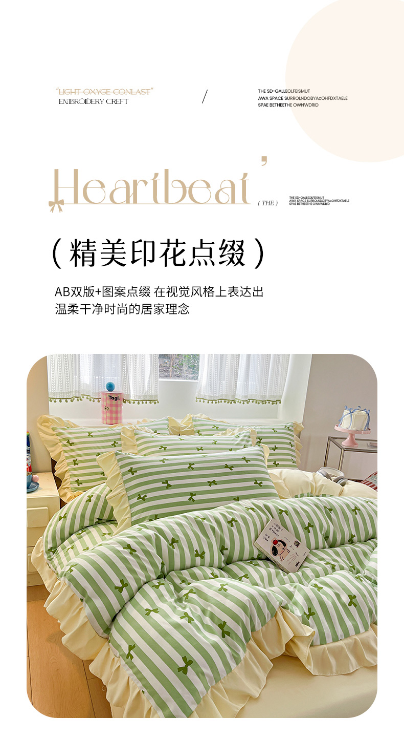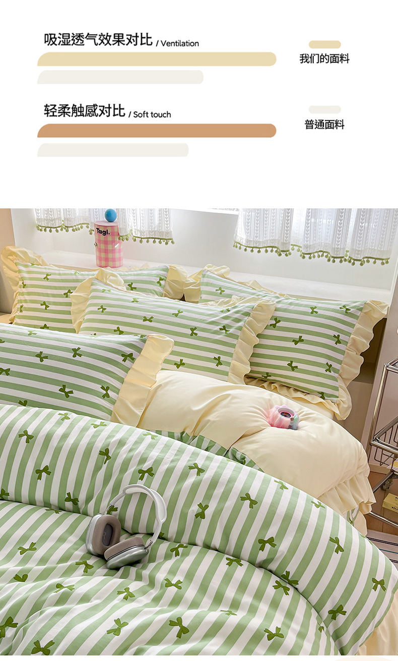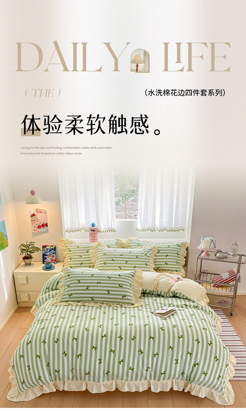 商品名称:2025水洗棉花边四件套_9067 蝴蝶结-条纹绿