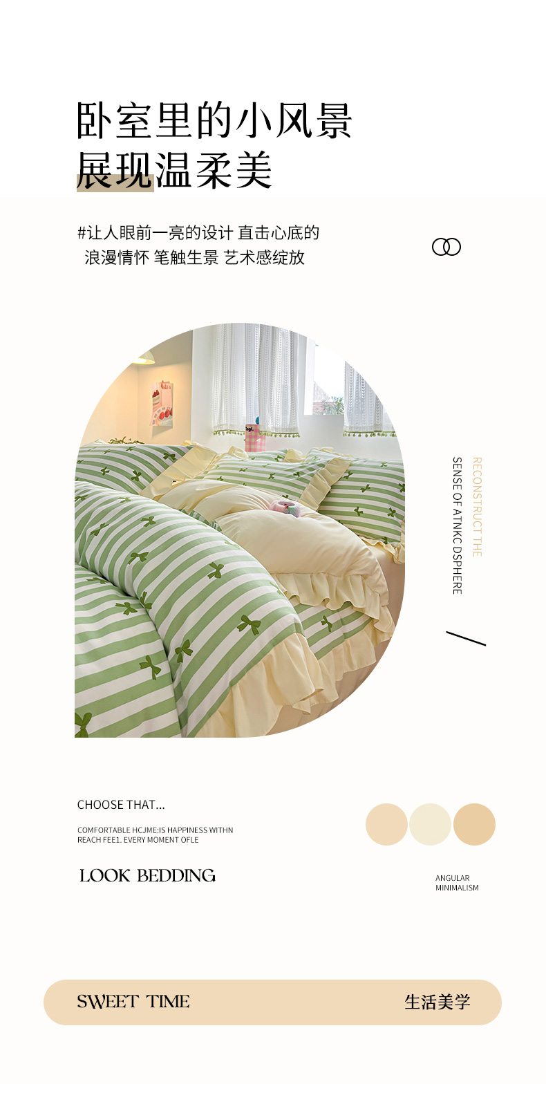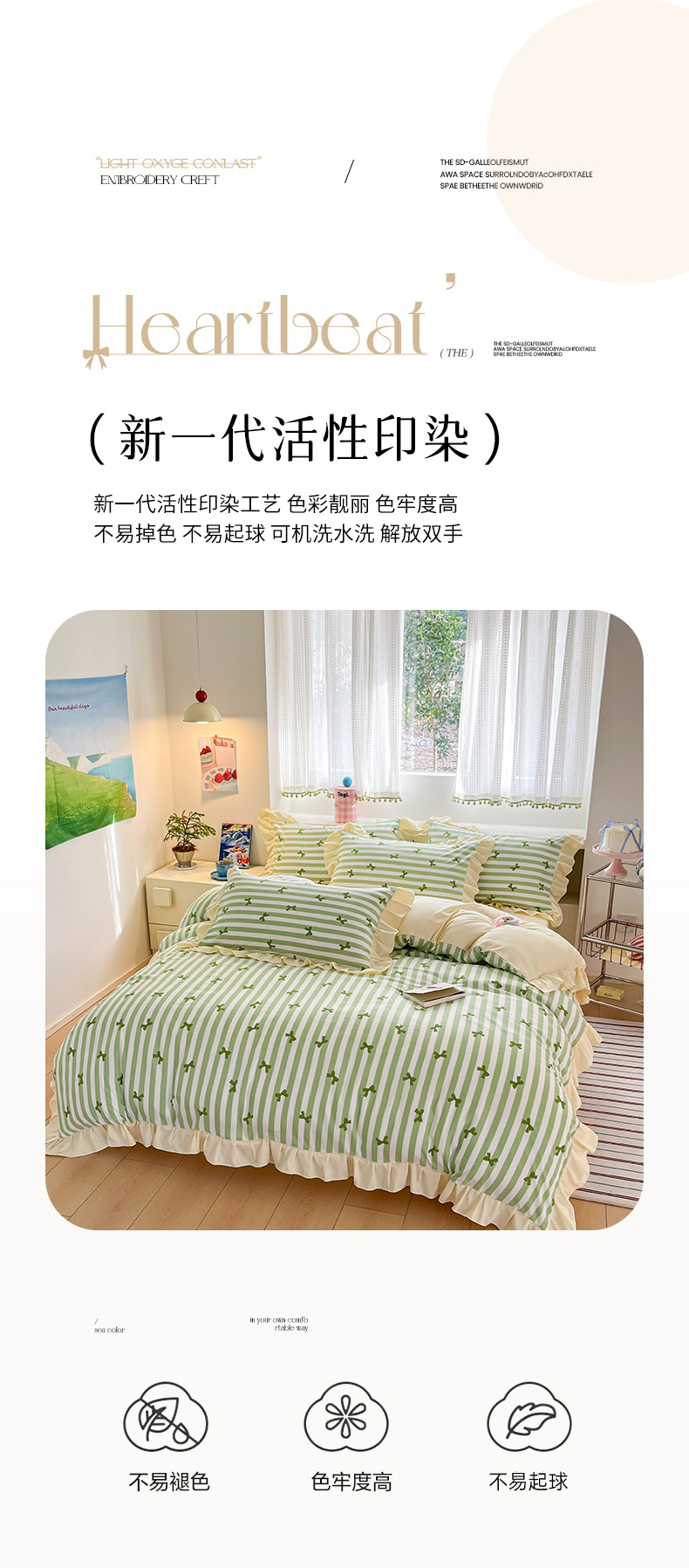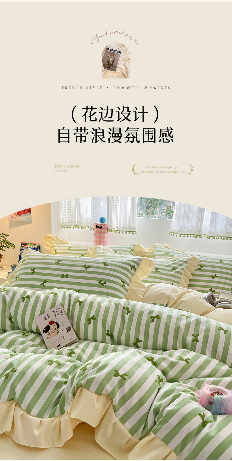 商品名称:2025水洗棉花边四件套_9067 蝴蝶结-条纹绿