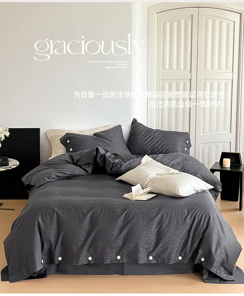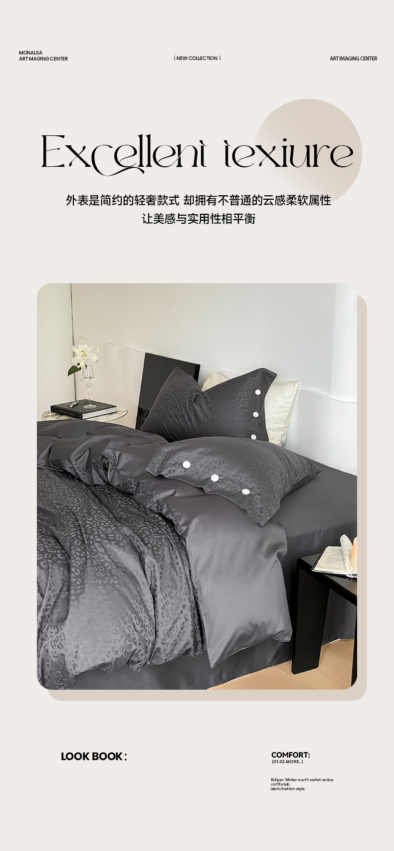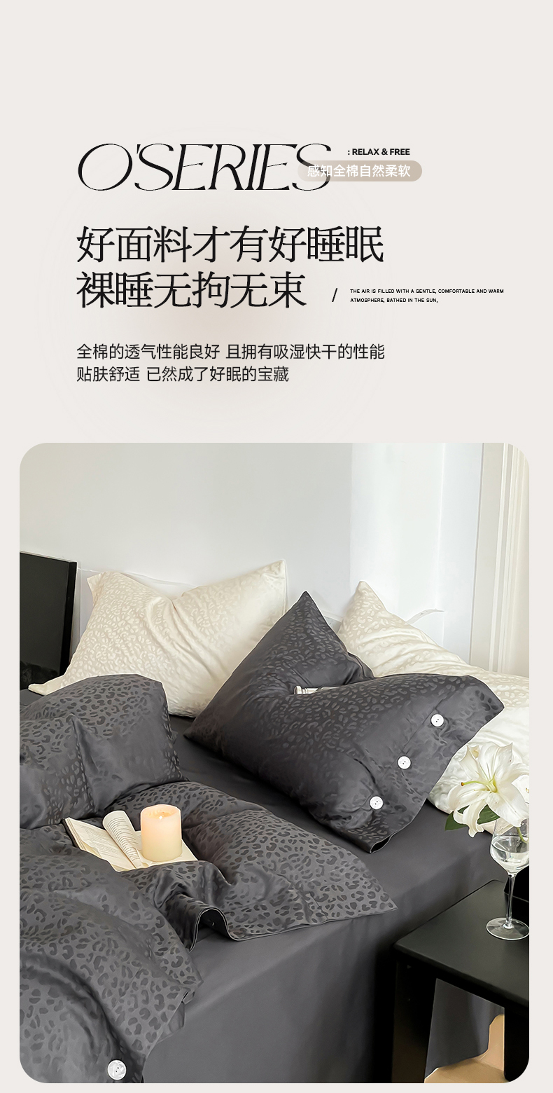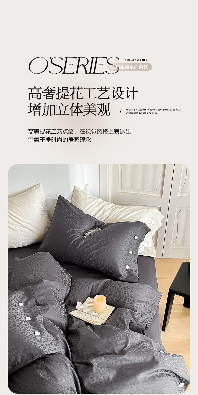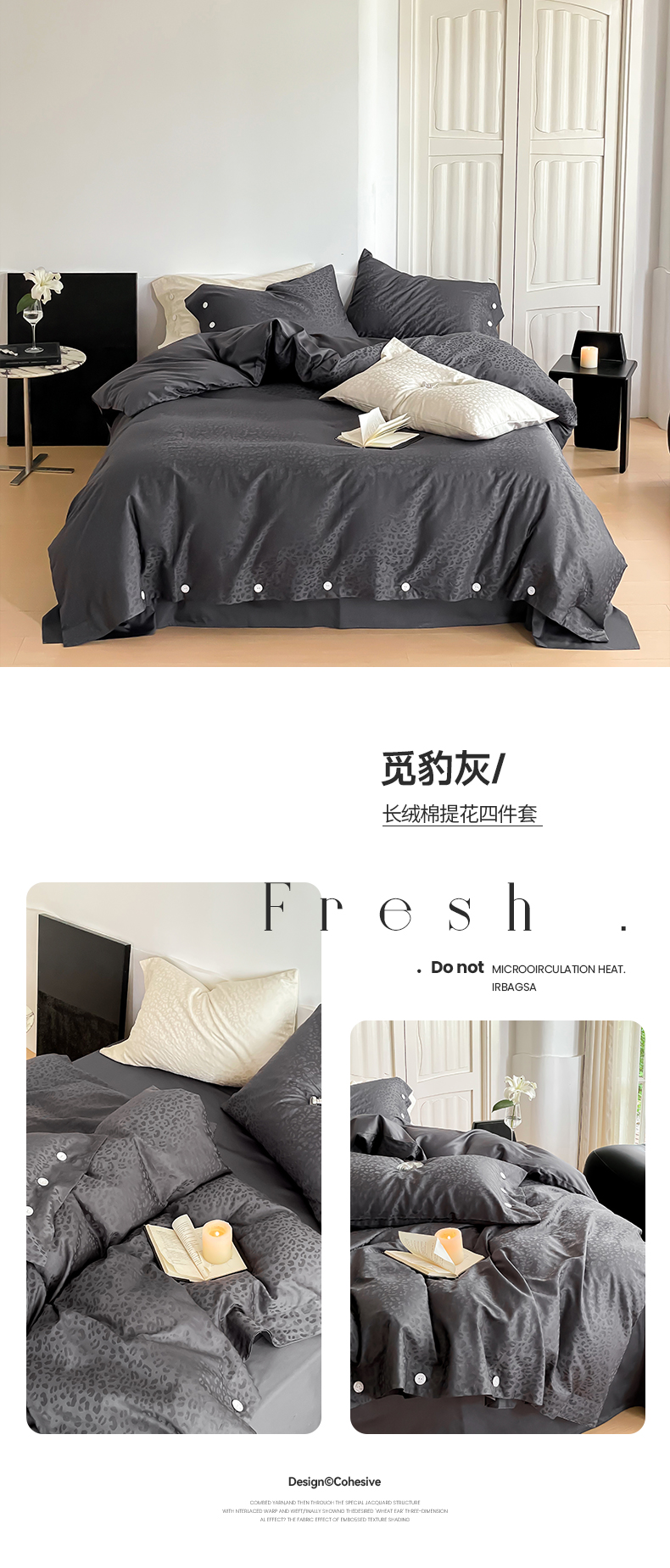当前位置: 91家纺网 > 商品网购 > 床品套件 > 四件套 > 全棉普通四件套 > 华超针织2025新款100支全棉长绒棉提花四件套-觅豹系列 觅豹灰