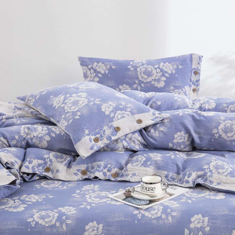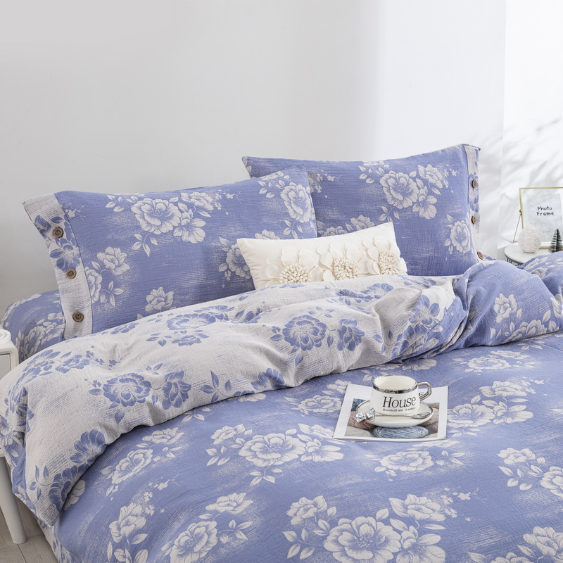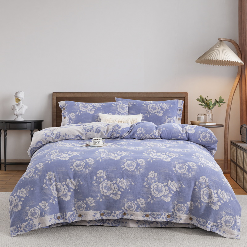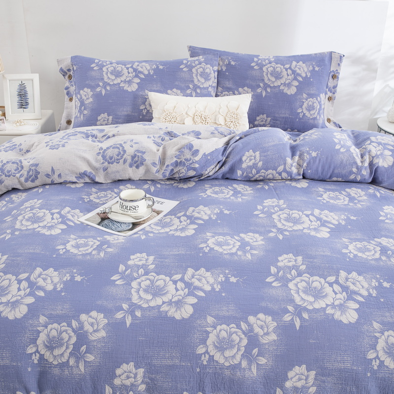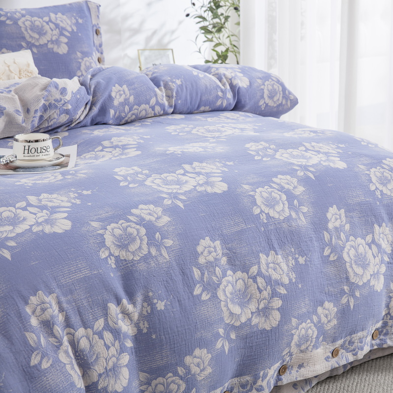 商品名称:2025新款全棉色织双层纱纽扣款四件套 云纱-浅兰