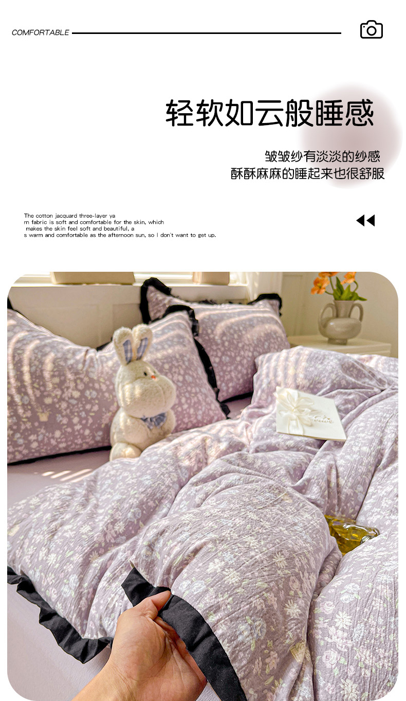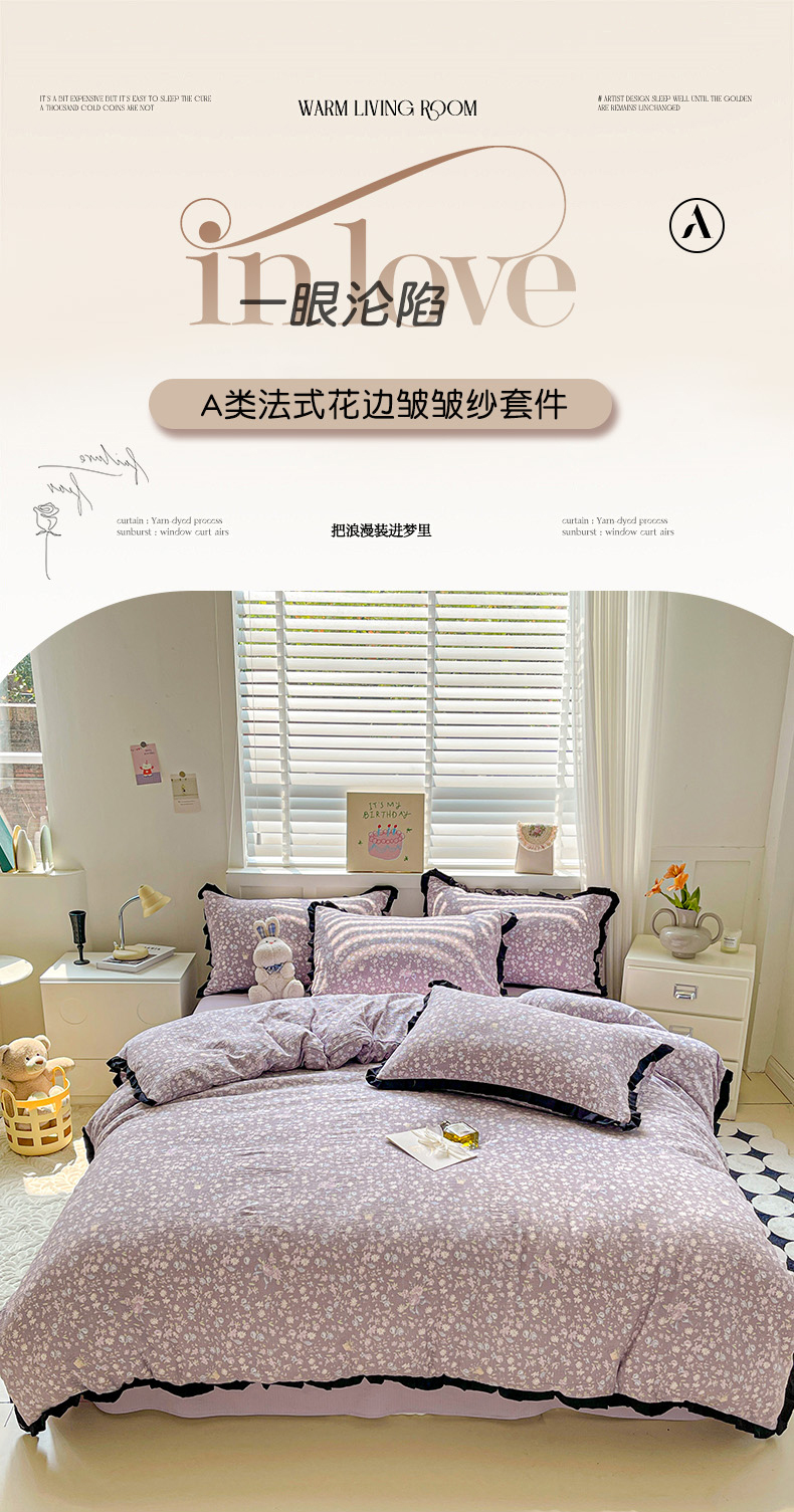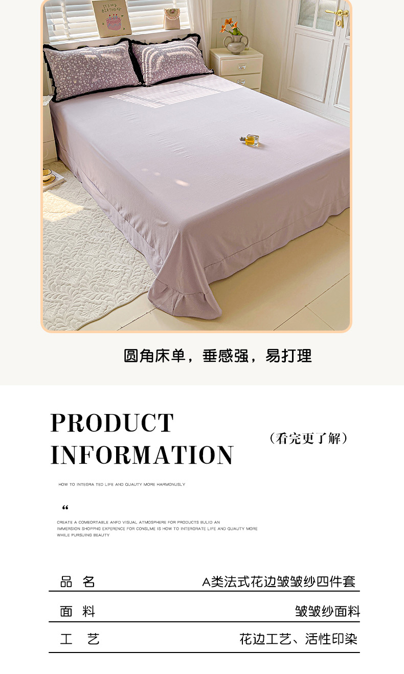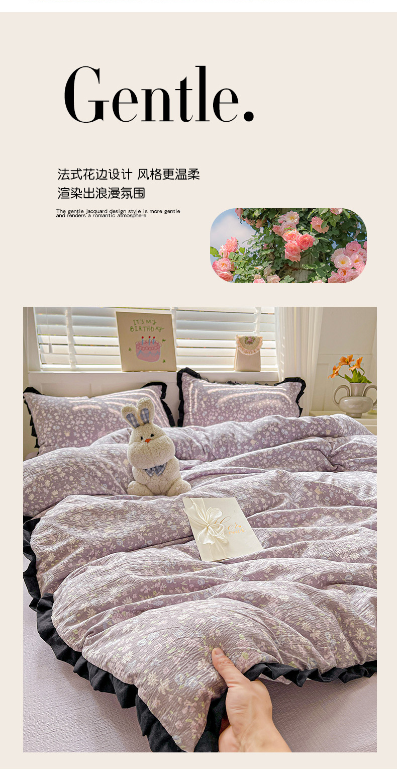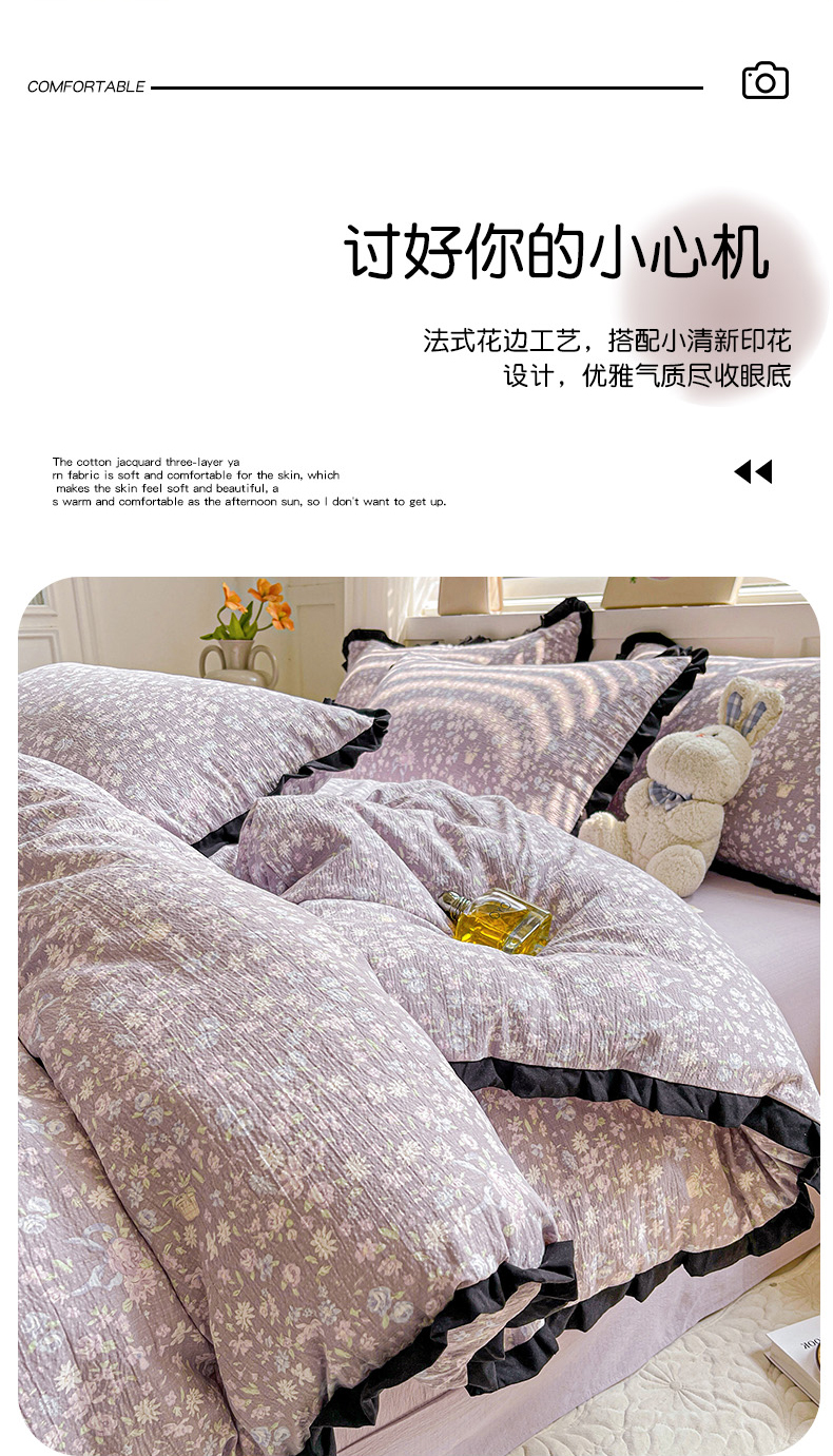 当前位置: 91家纺网 > 商品网购 > 床品套件 > 四件套 > 其它四件套 > 暖芯优选 2025新款直播热款赫本风花边款针织法式印花吊边床单三件套床笠四件套 紫萱