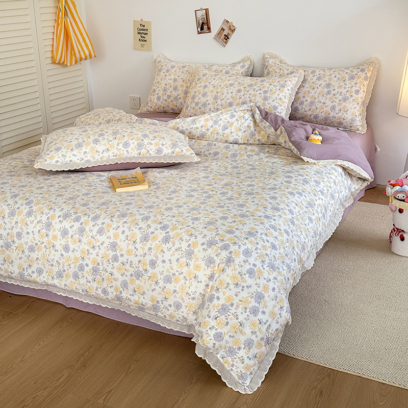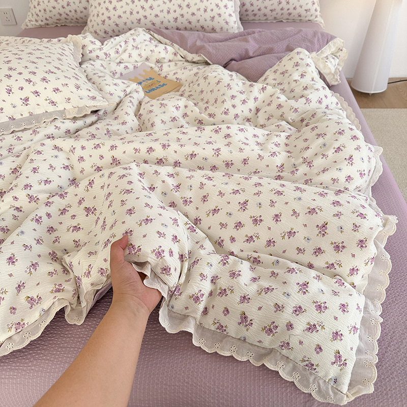 商品名称:斯卡诺家纺 2025新款纯棉花边双层纱夏被四件套水洗棉夏被四件套 蝶梦