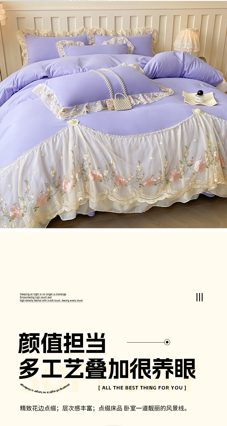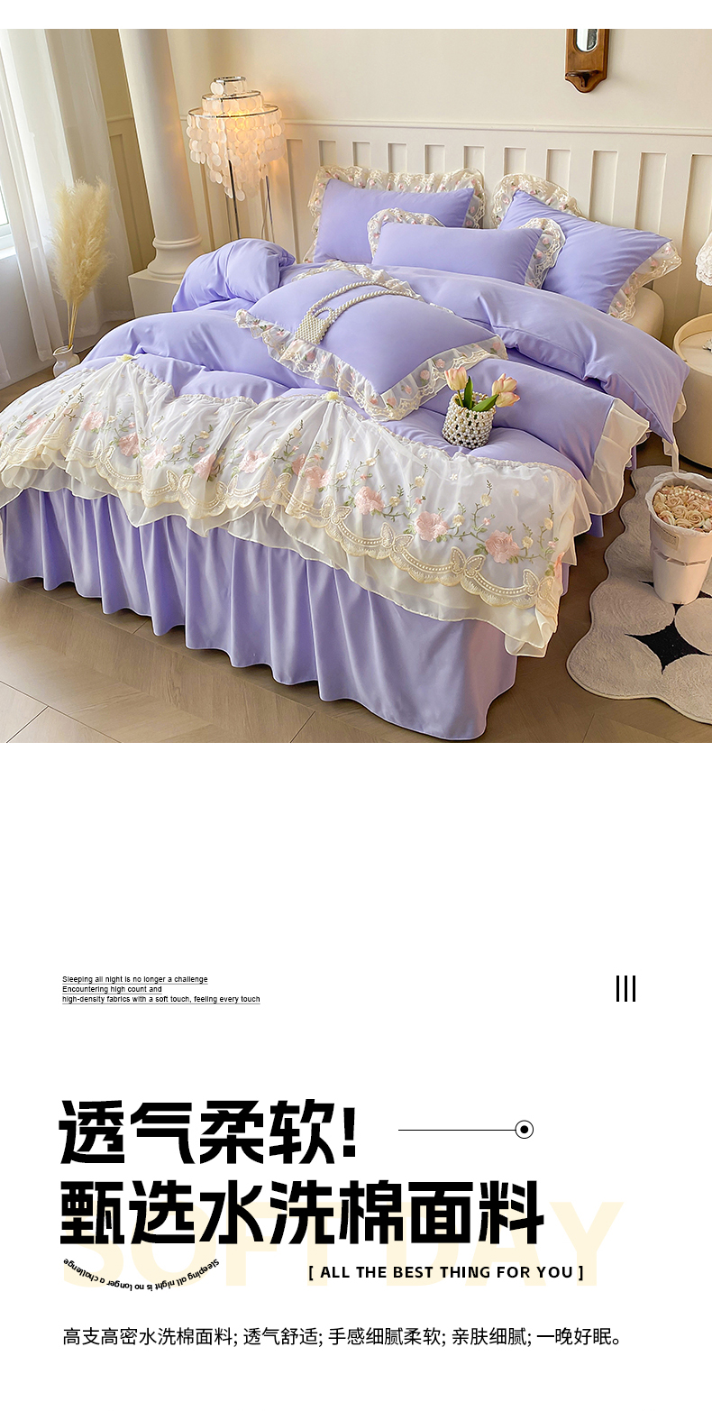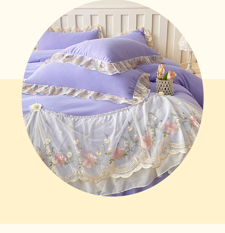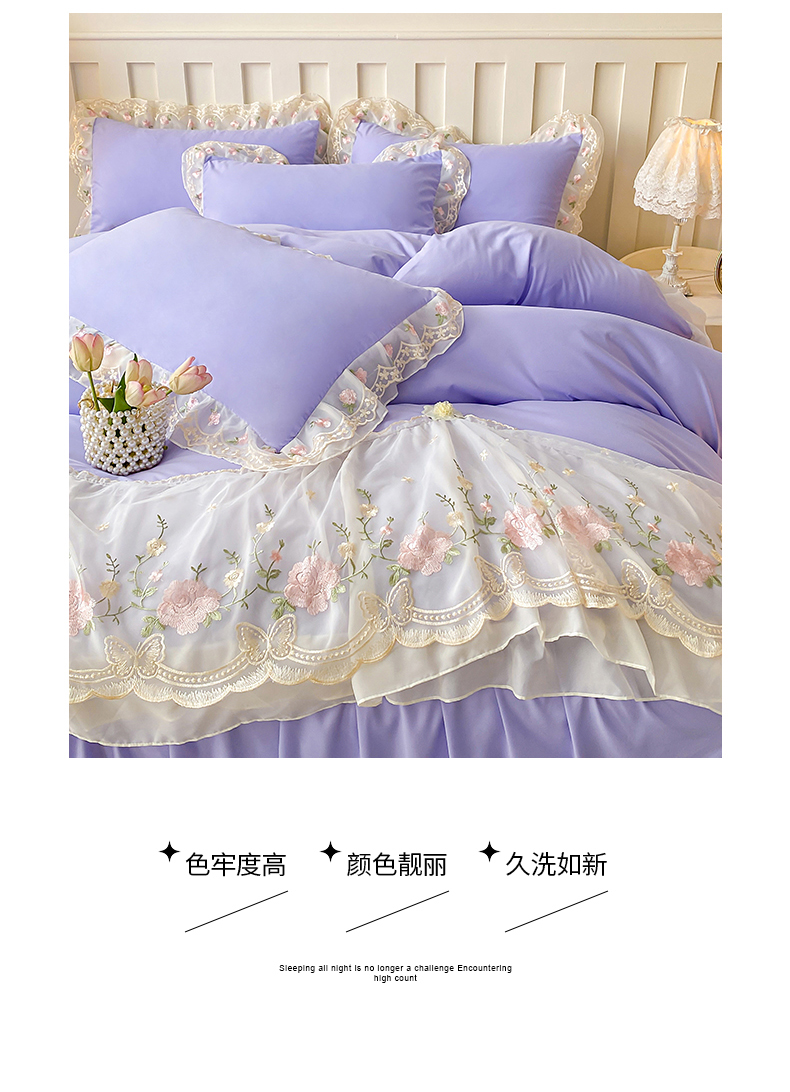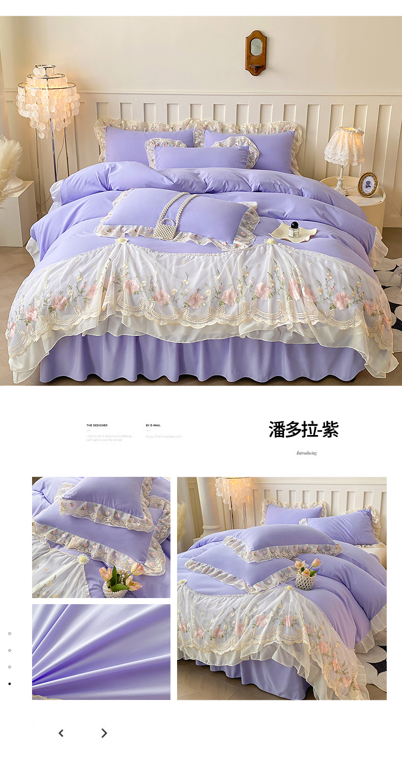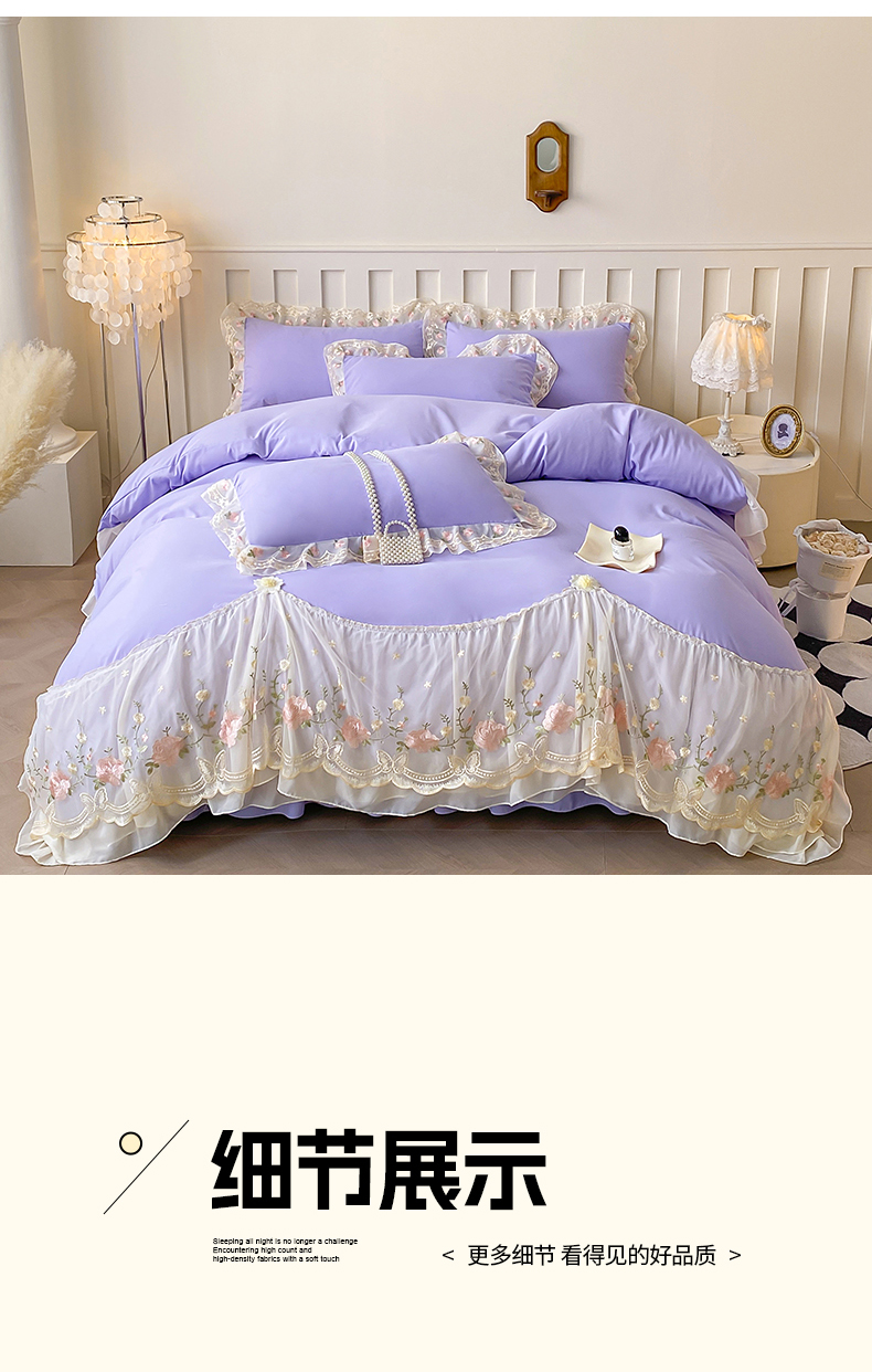 • 91家纺网 家纺一手货源 找家纺 富宁2025新款水洗亲肤棉雪纺蕾丝刺绣床裙床笠三件套四件套 潘多拉-紫
