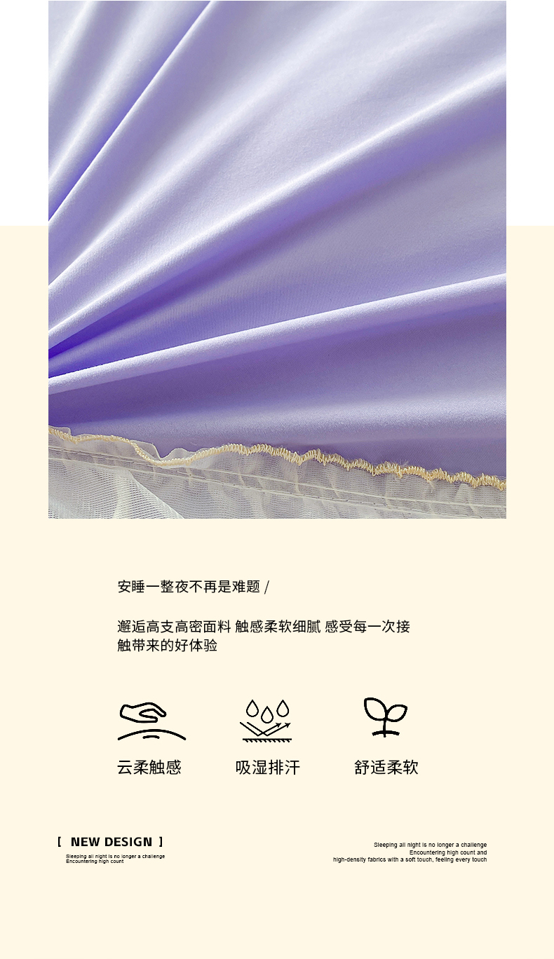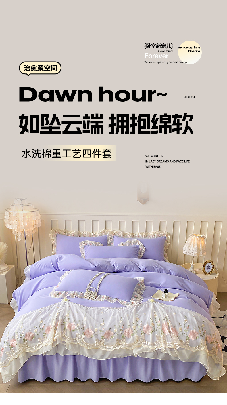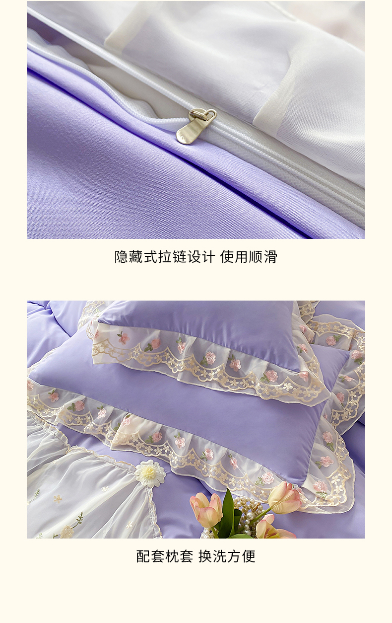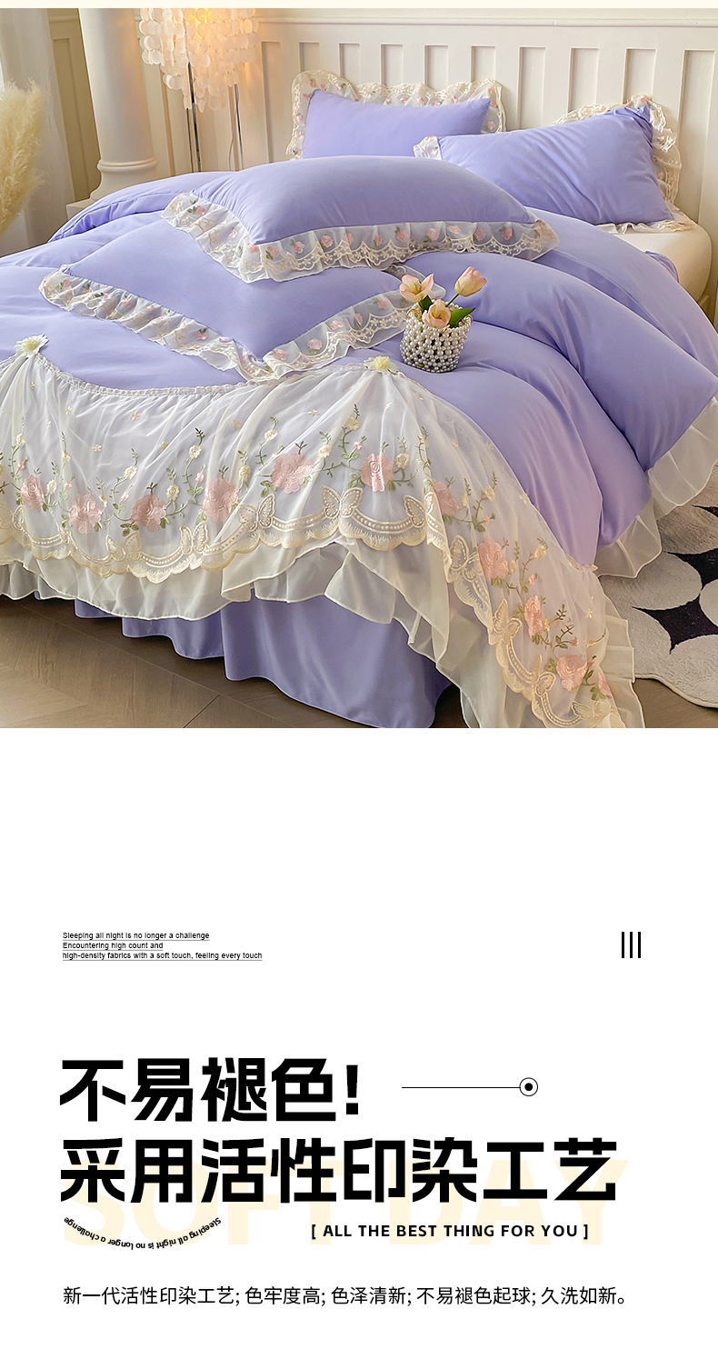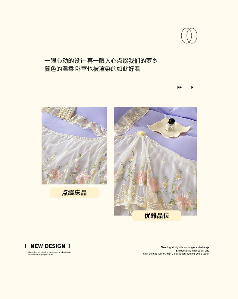 • 91家纺网 家纺一手货源 找家纺 富宁2025新款水洗亲肤棉雪纺蕾丝刺绣床裙床笠三件套四件套 潘多拉-紫