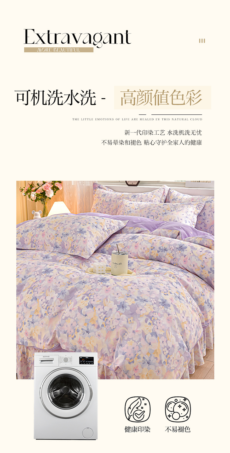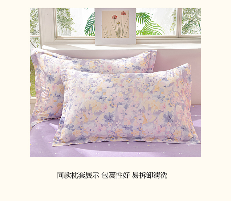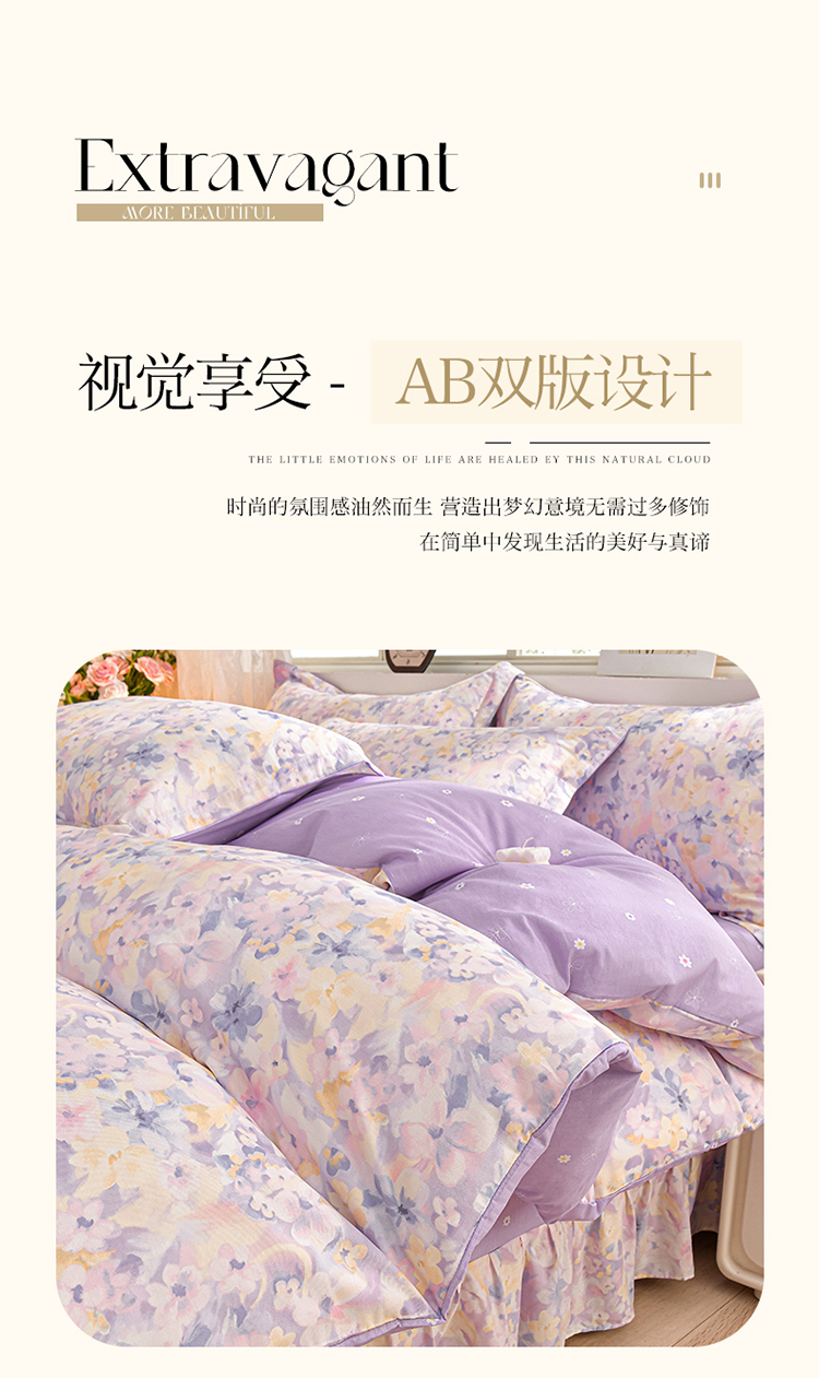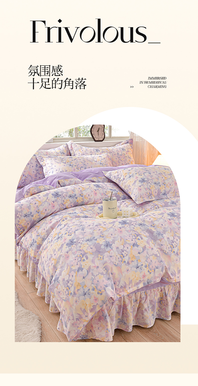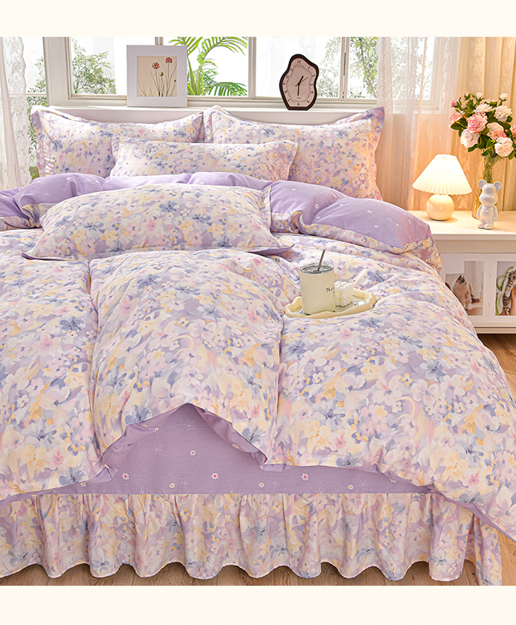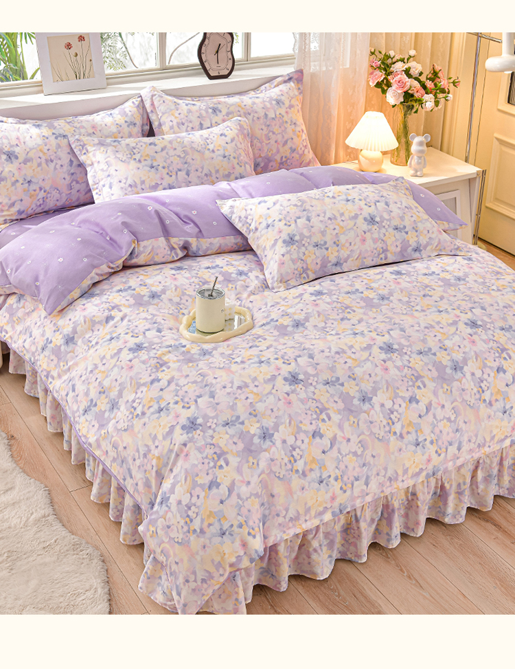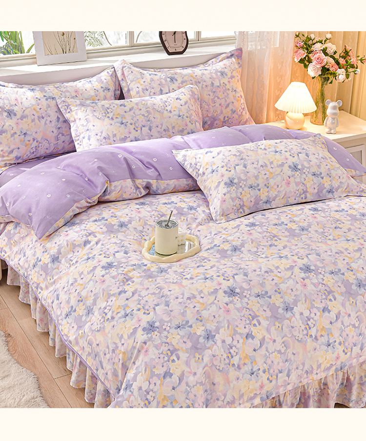 绘萱家居 2025新款100%全棉床裙款斜纹印花四件套 紫色浪漫