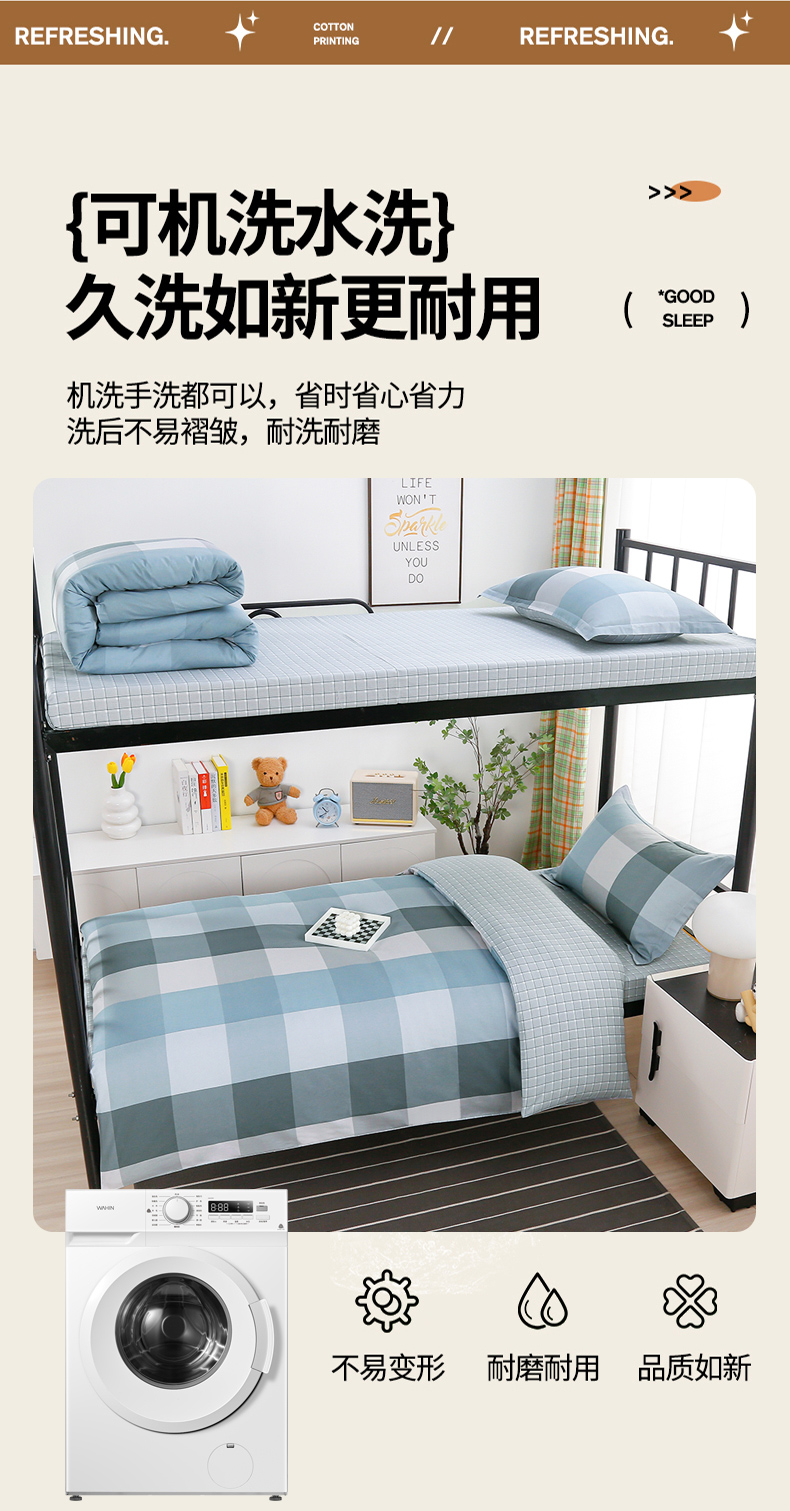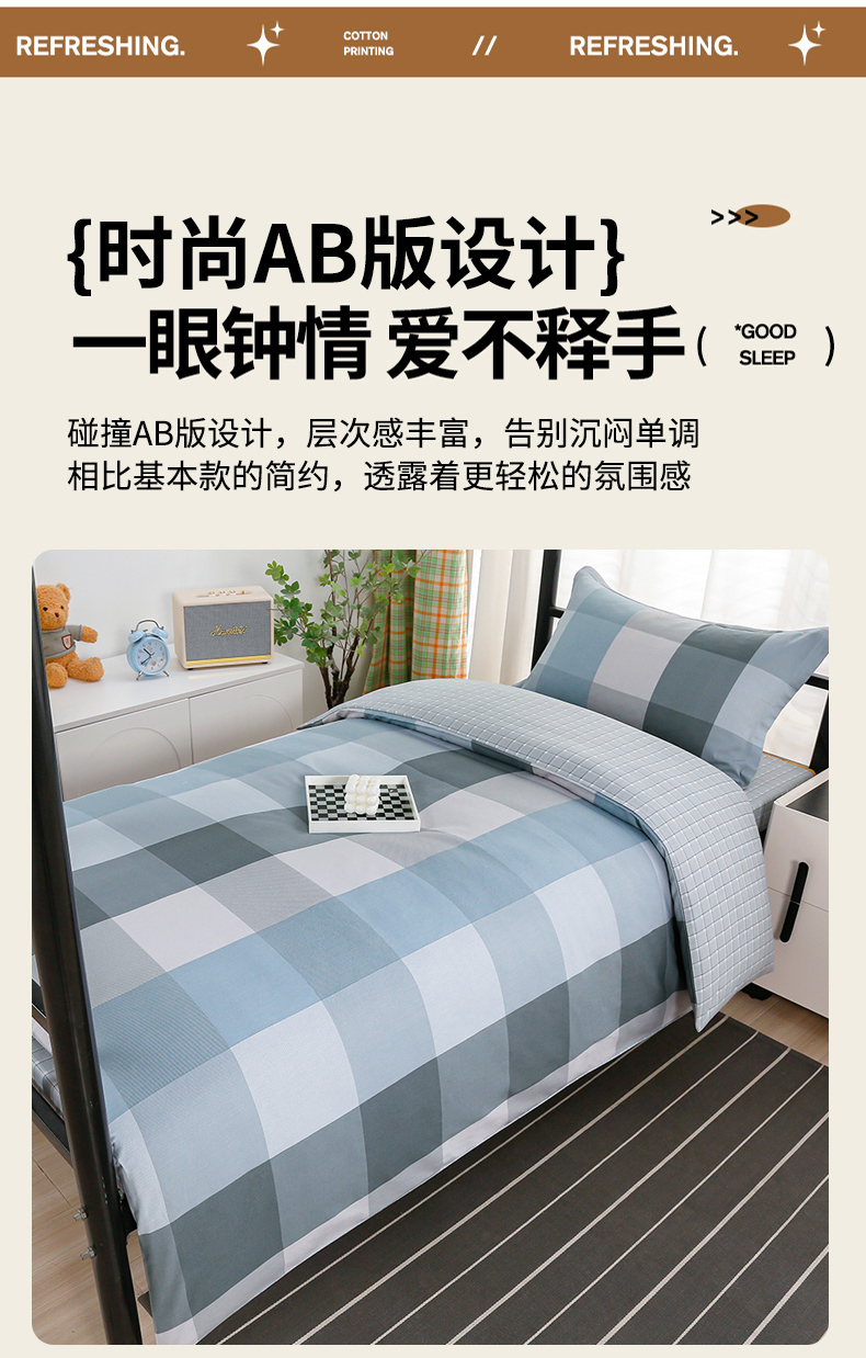 当前位置: 91家纺网 > 商品网购 > 床品套件 > 多件套 > 多件套 > 乐旗家纺 2025新款A类AB版全棉环保印花学生上下铺宿舍三件套六件套 摩卡格调