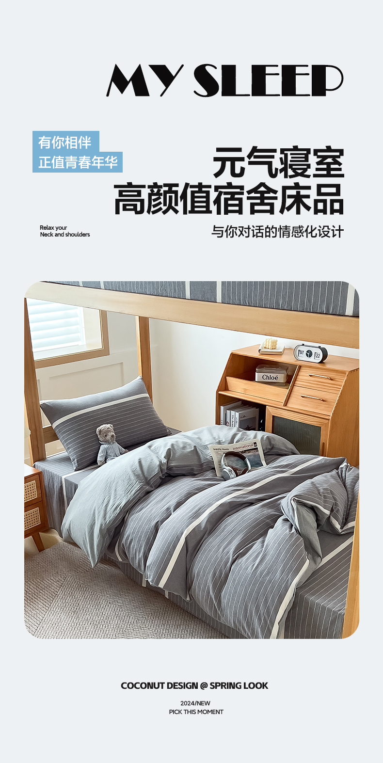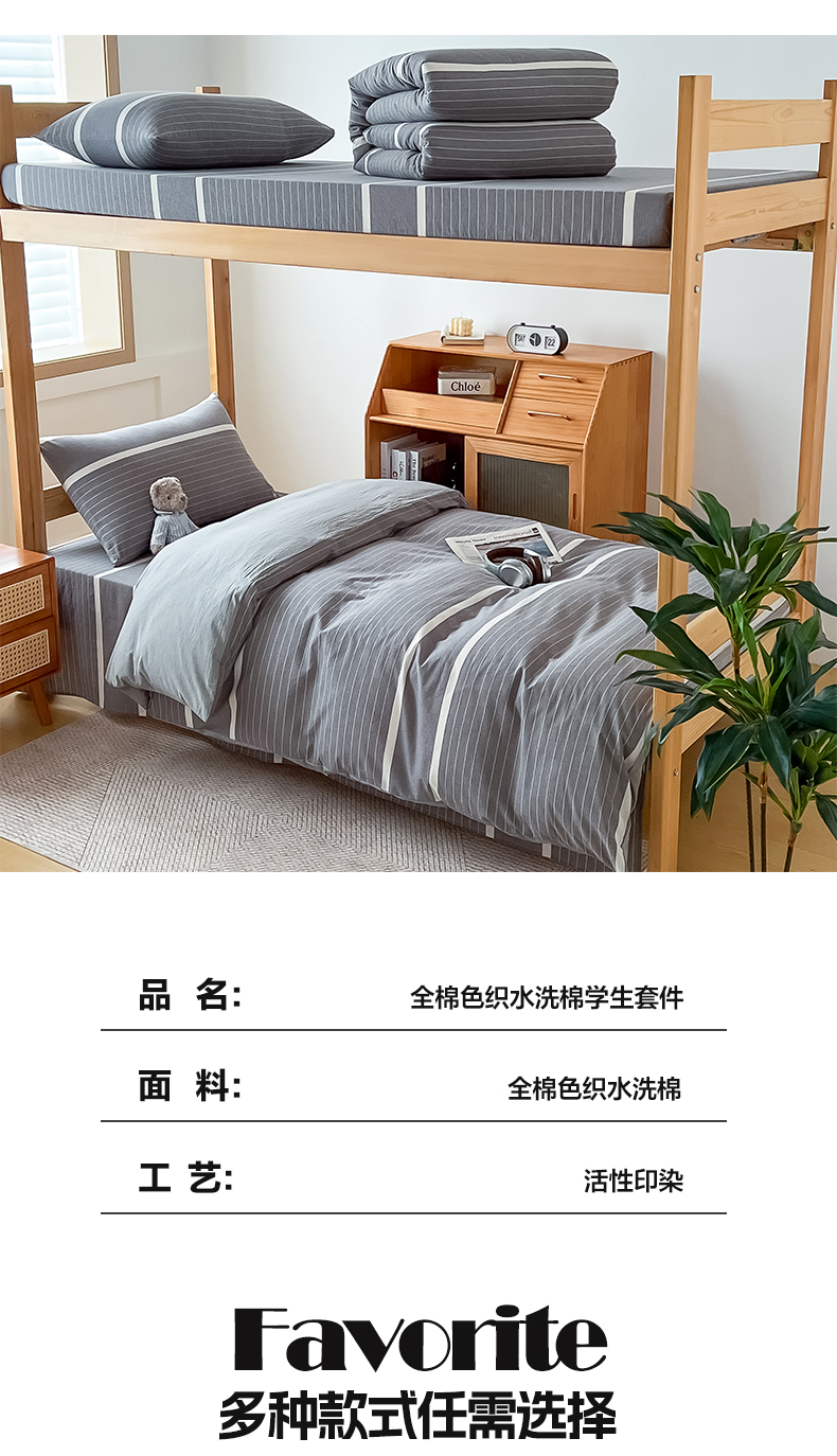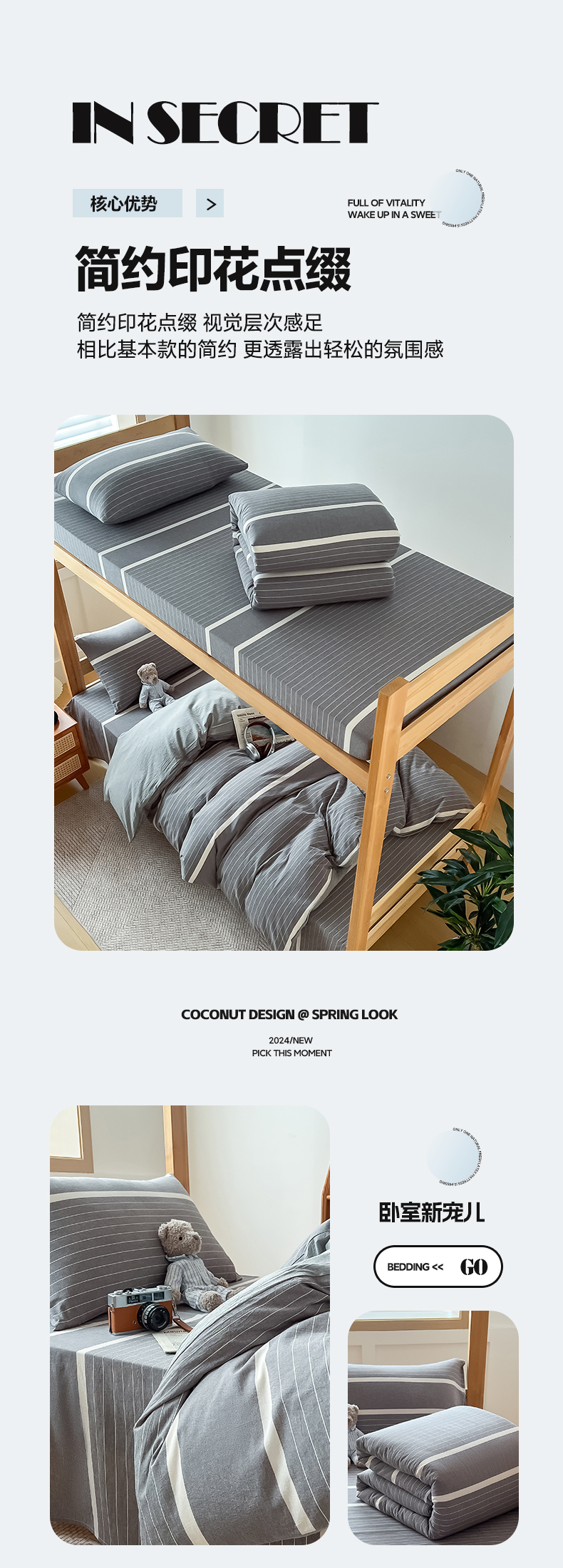 鸣升家纺 2025新款全棉纯棉色织水洗棉学生三件套 灰条