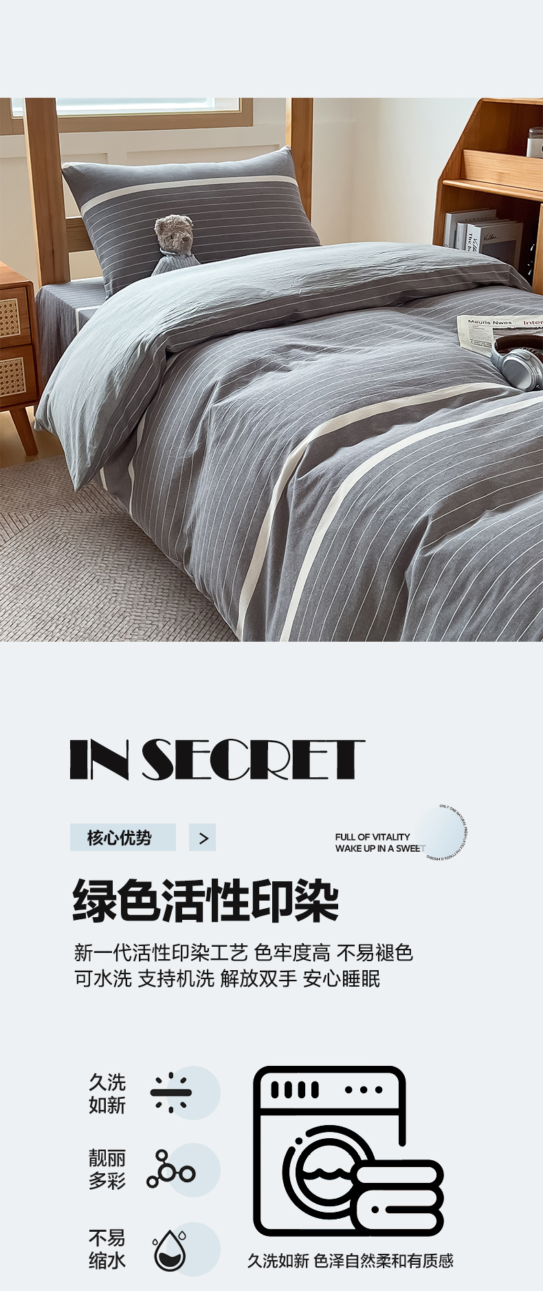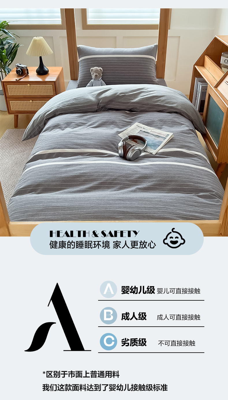 商品名称:鸣升家纺 2025新款全棉纯棉色织水洗棉学生三件套 灰条