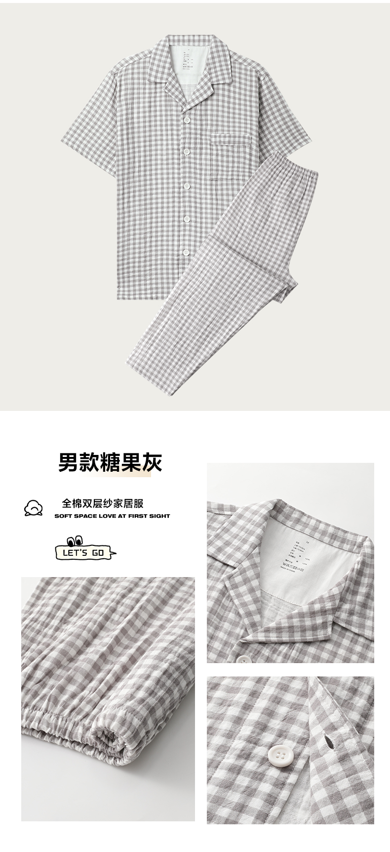 玖弘家居 2025新款全棉双层纱长袖家居服【控价 抖音69.9 视频号 69.9 小红书 89】 男款糖果灰短袖