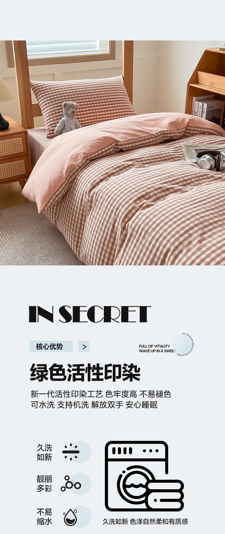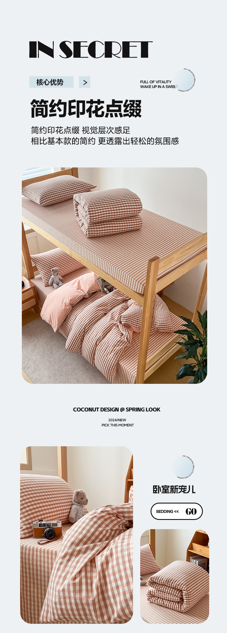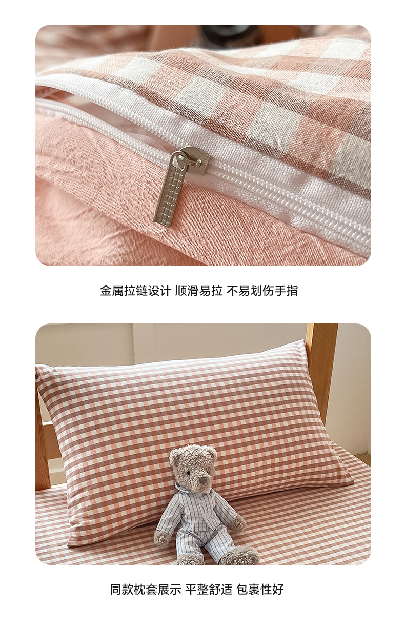 商品名称:九沐良品 2025新款全棉纯棉色织水洗棉学生三件套宿舍三件套上下铺三件套 粉小格