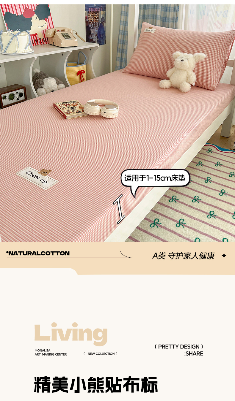 佳笠家居 2025新款kimi熊系列A类宿舍全棉纯棉色织水洗棉床笠单床笠床笠单件 粉红小格