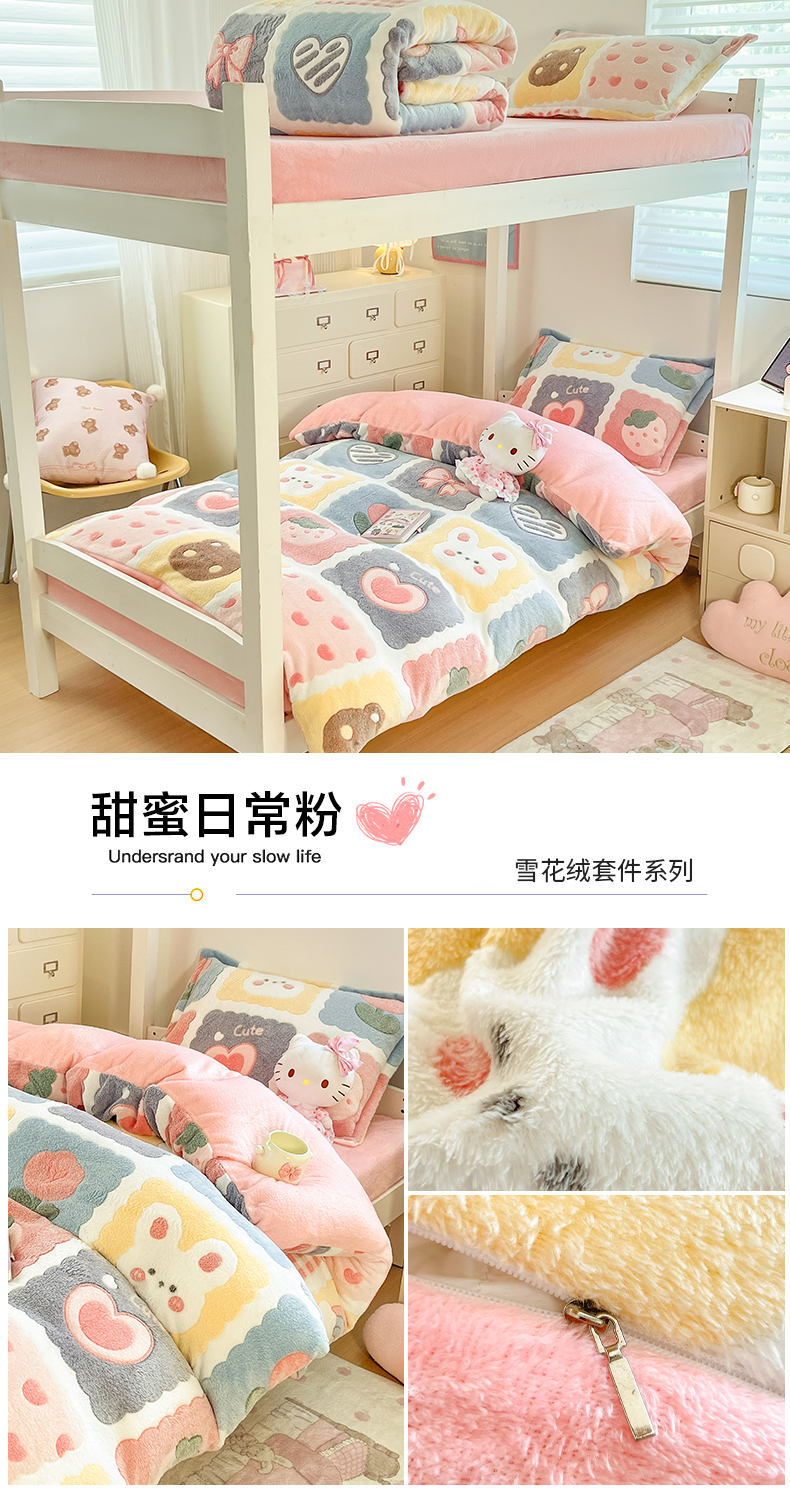 (总)川悦生活 2025新款立体雪花绒印花四件套学生床系列一场景一,ins樱桃,爱米兔,冰激凌小熊,波波熊,啵啵草莓,彩虹爱心粉,彩虹爱心蓝,彩虹爱语粉,彩虹爱语蓝,哒哒鸭丫,嘎嘎小熊,橘兔,可爱熊,可可小狗,快乐鸭鸭,蜜语奶兔,奶芙小花,奶咖小熊,奶味云朵,妮娜兔,巧克力熊,桃心爱语,甜蜜日常粉,甜系粉熊,甜系龙龙,小熊花园,幸福甜兔,熊小巴,郁金奶兔
