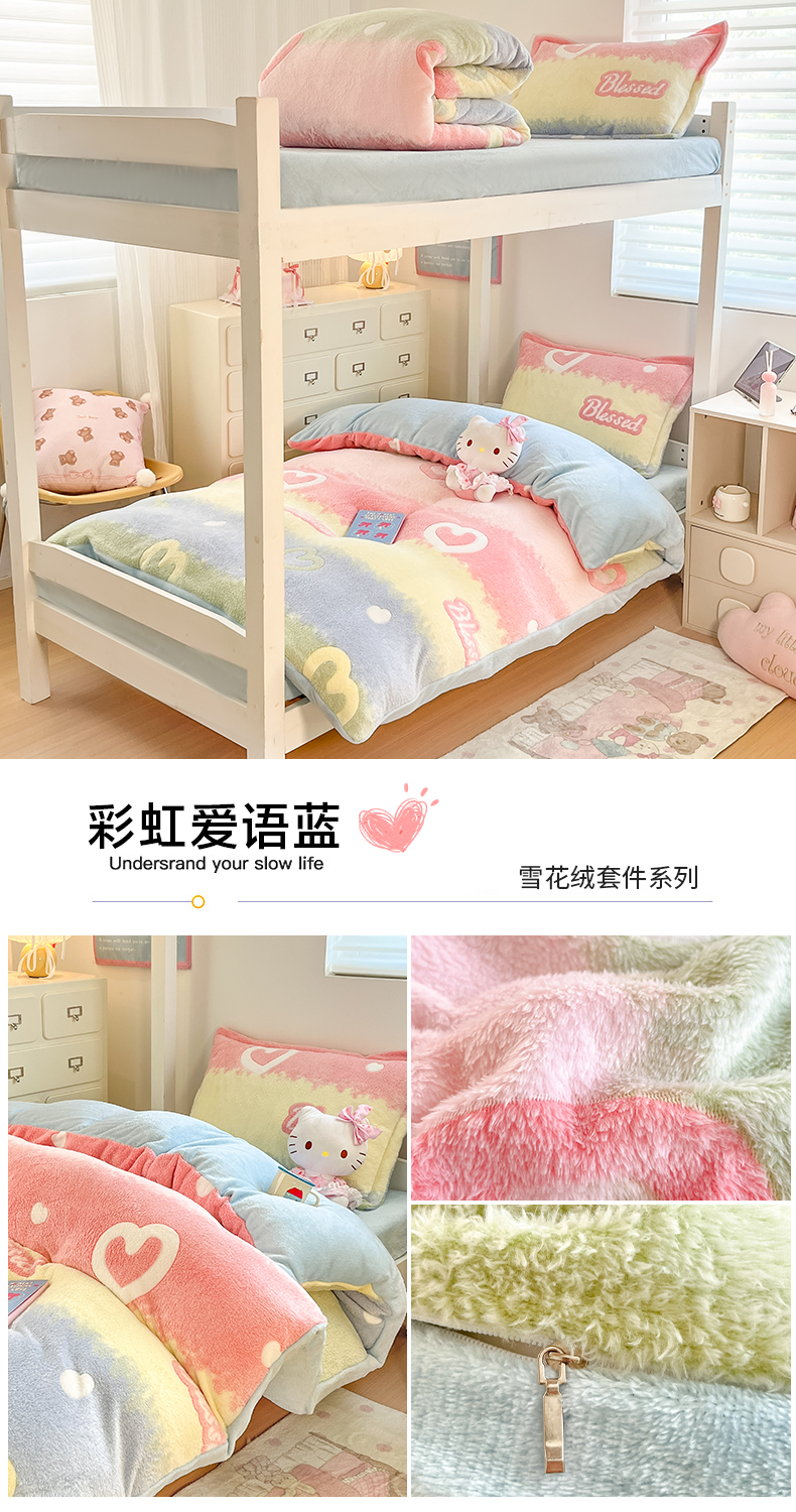 当前位置: 91家纺网 > 商品网购 > 床品套件 > 四件套 > 其它四件套 > 川悦生活 2025新款立体雪花绒印花四件套学生床系列一场景一 彩虹爱语蓝