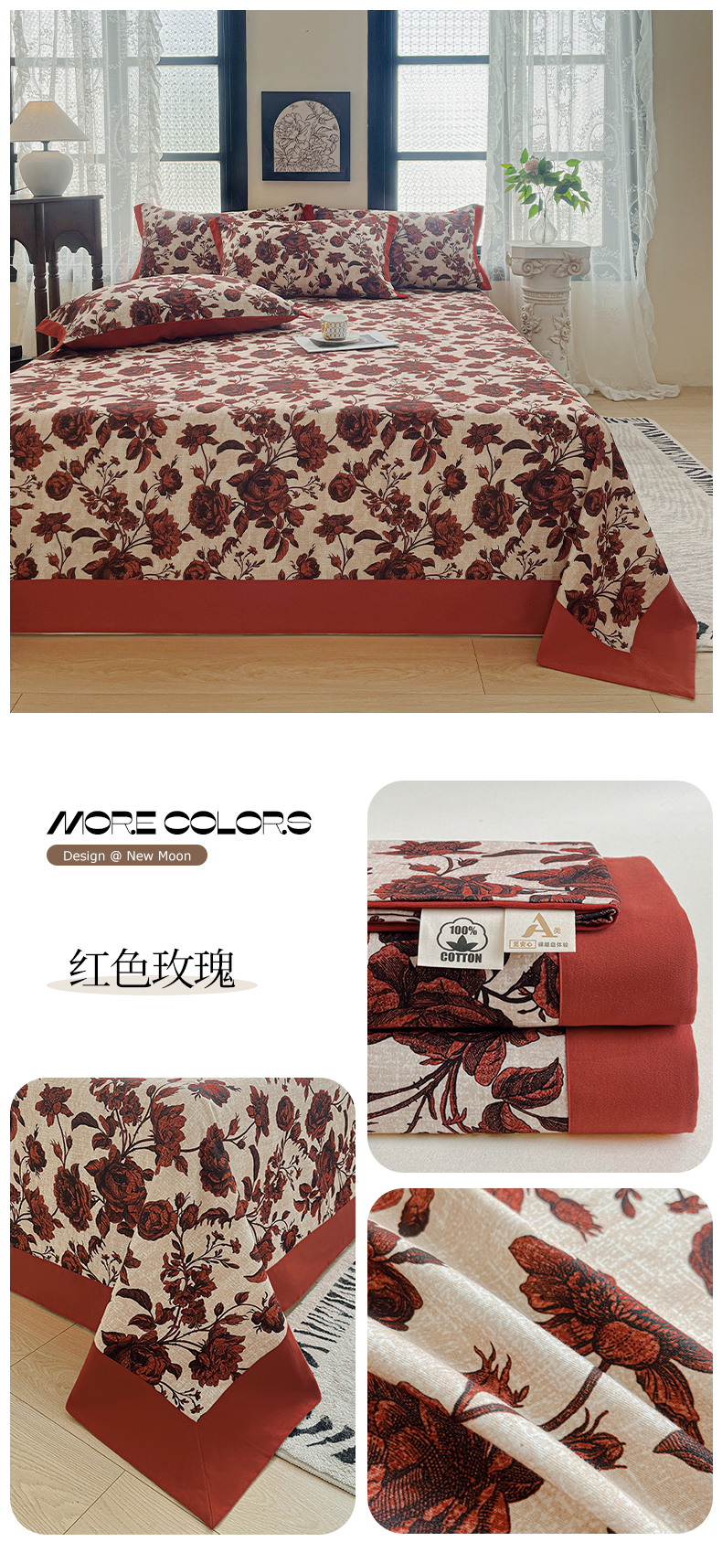 商品名称:慕梵家居2025新款100%全棉磨毛包边单床单 红色玫瑰