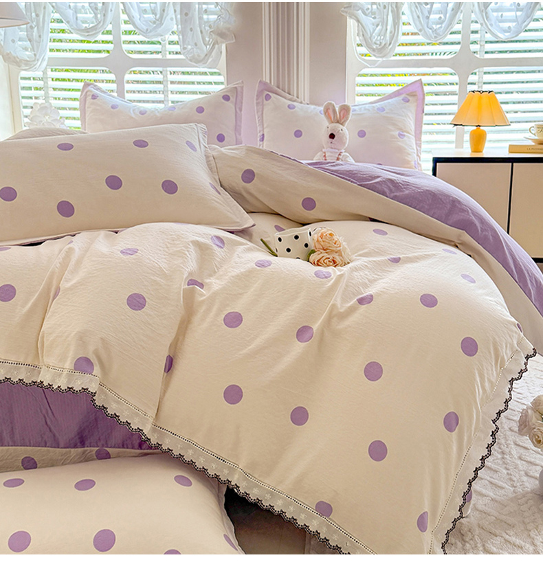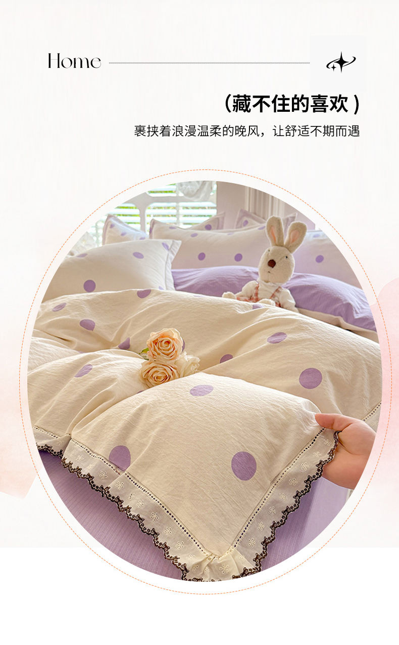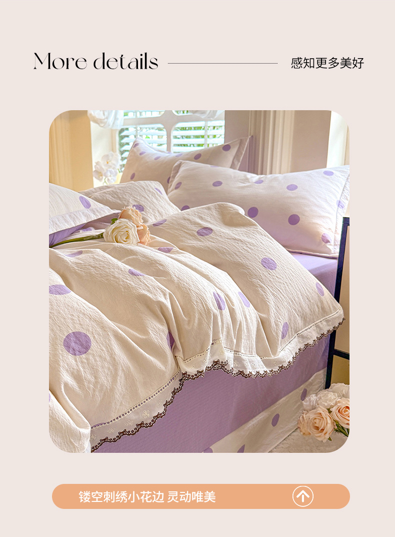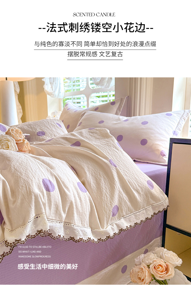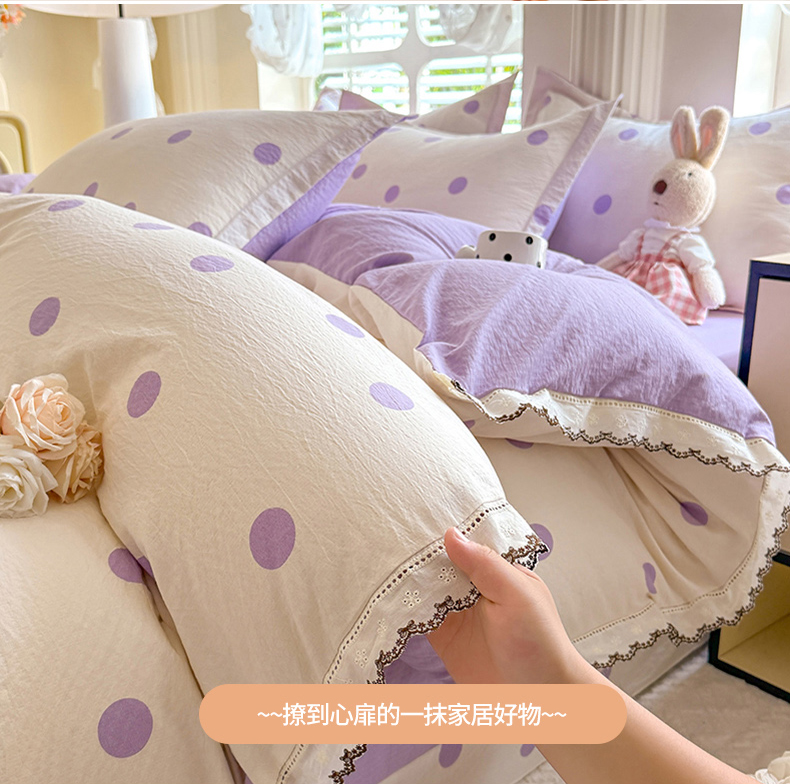 商品名称:韩约家纺 2025新款1全棉镂空双色刺绣花边床单款加厚棉麻四件套 波波紫