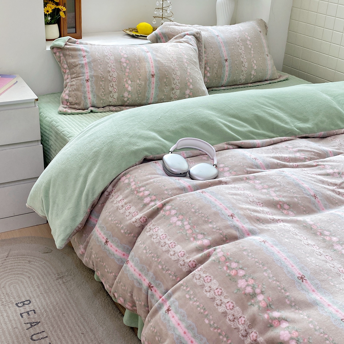 恋尚羽家纺 2025新款印花牛奶绒大床裙床盖四件套 浅朵粉