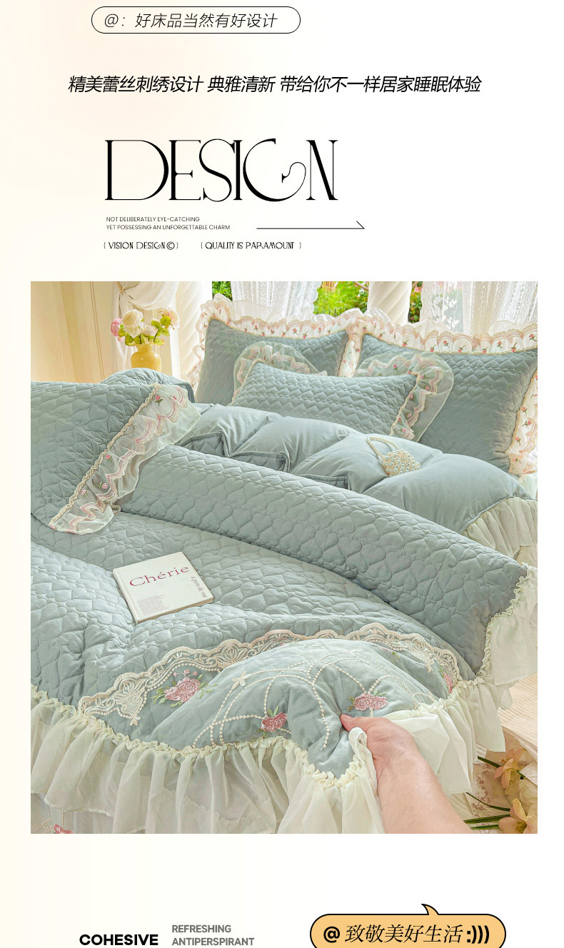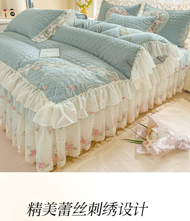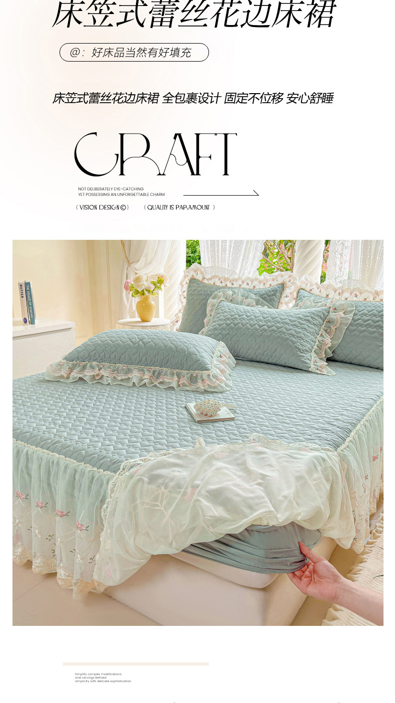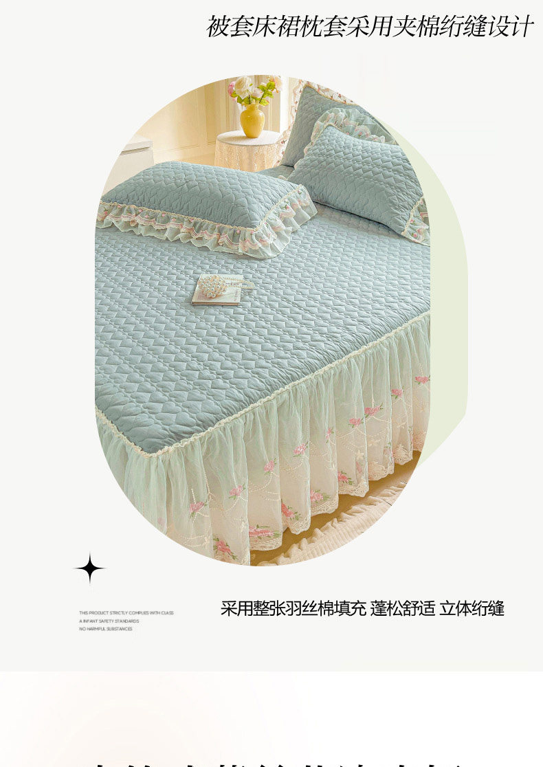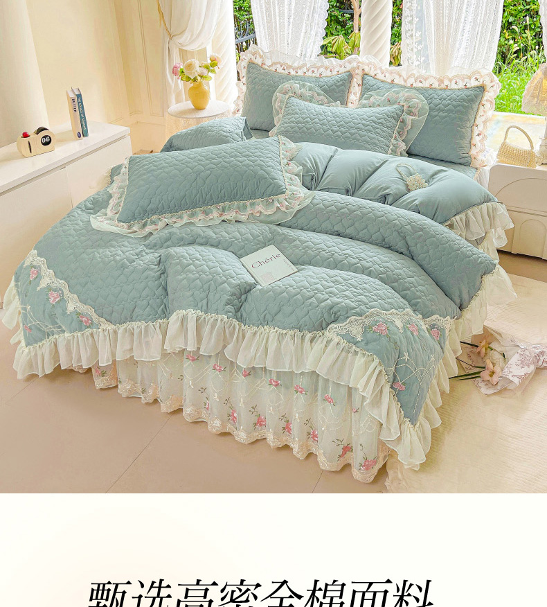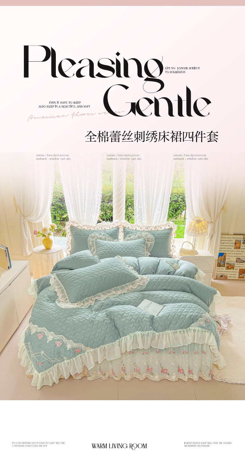 当前位置: 91家纺网 > 商品网购 > 床品套件 > 四件套 > 全棉普通四件套 > 罗艺轩 2025新款全棉蕾丝刺绣床裙四件套-小香玫瑰 小香玫瑰-豆绿
