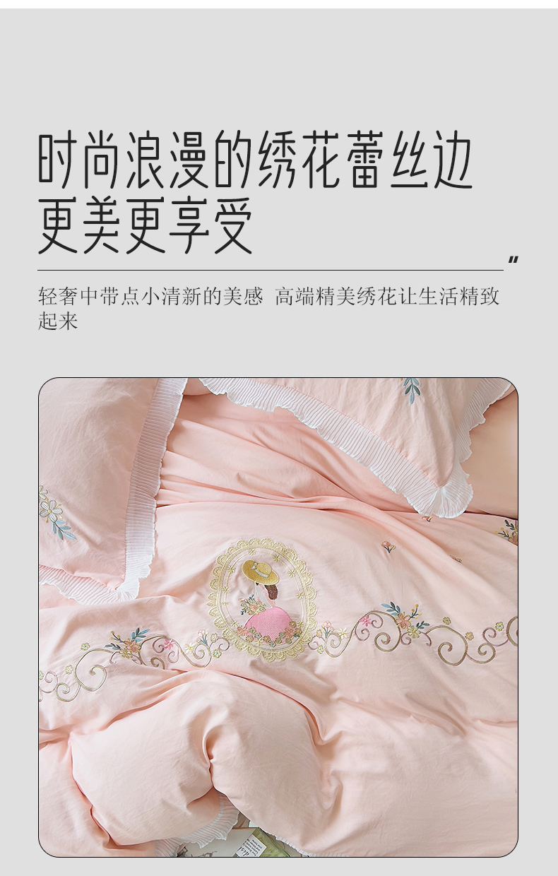 商品名称:青泽家纺 2025新款母婴级ins风韩版绣花荷叶边水洗棉磨毛四件套 缤纷花园玉色