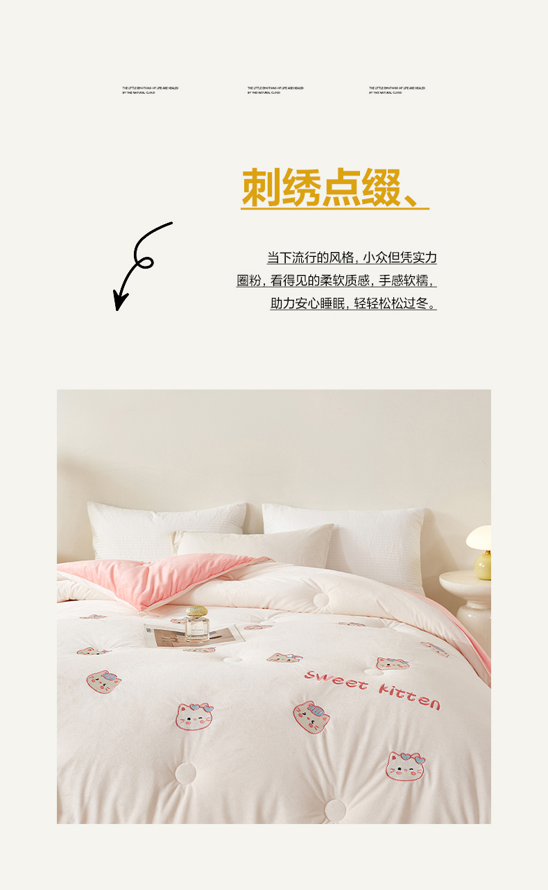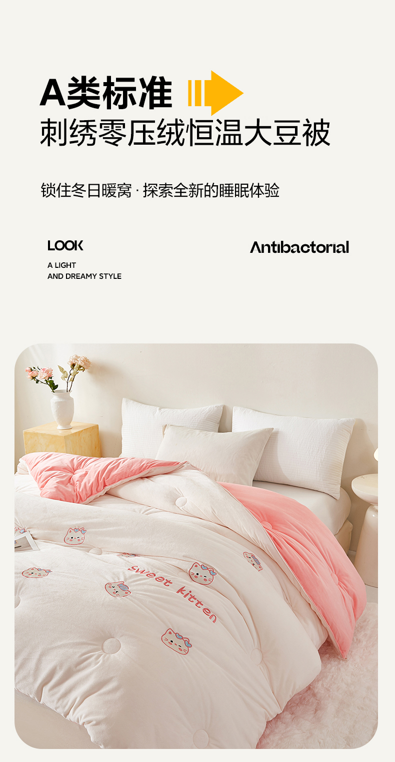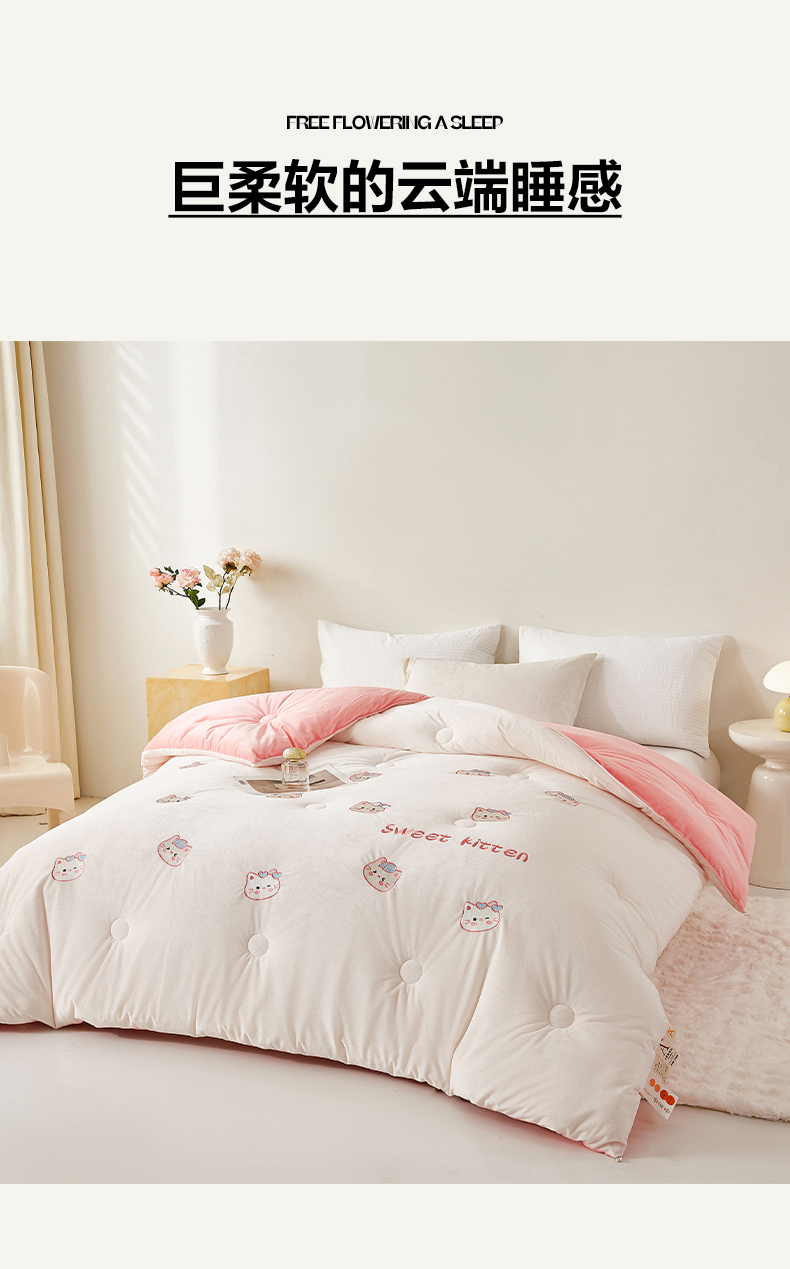 • 91家纺网 家纺一手货源 找家纺 欢乐季2025新款刺绣零压绒恒温大豆被四季被+被芯(可以开发票—专票8个点) 猫咪