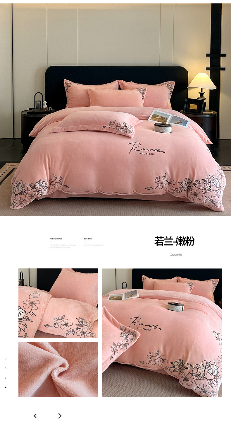 商品名称:金牛座家纺 2025新款加厚牛奶绒轻奢刺绣四件套-若兰 若兰-嫩粉