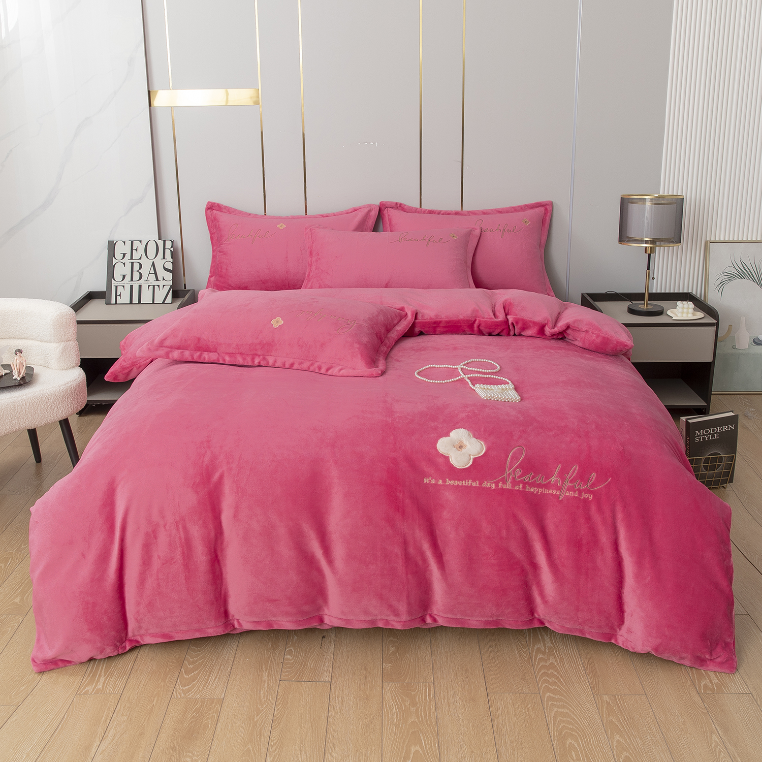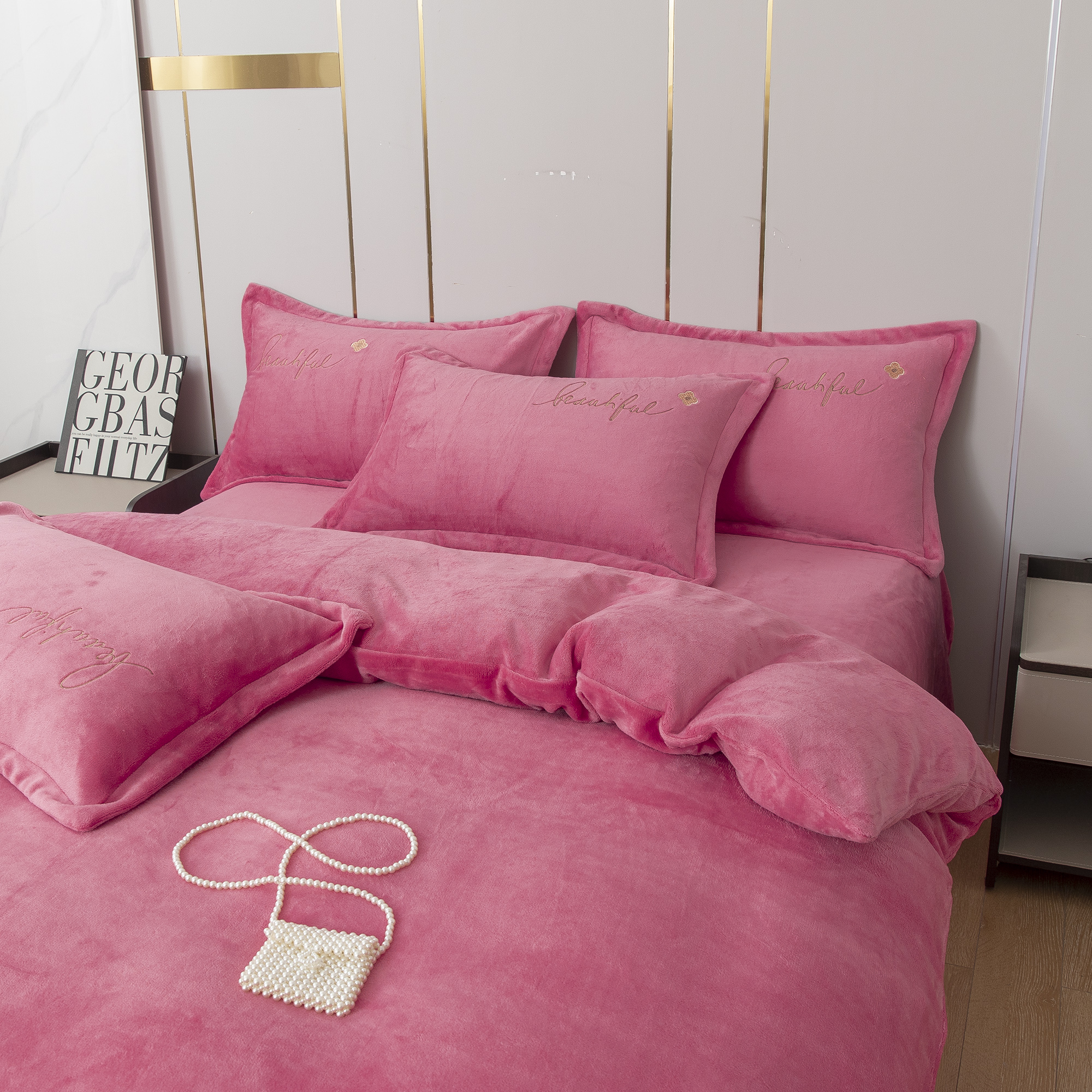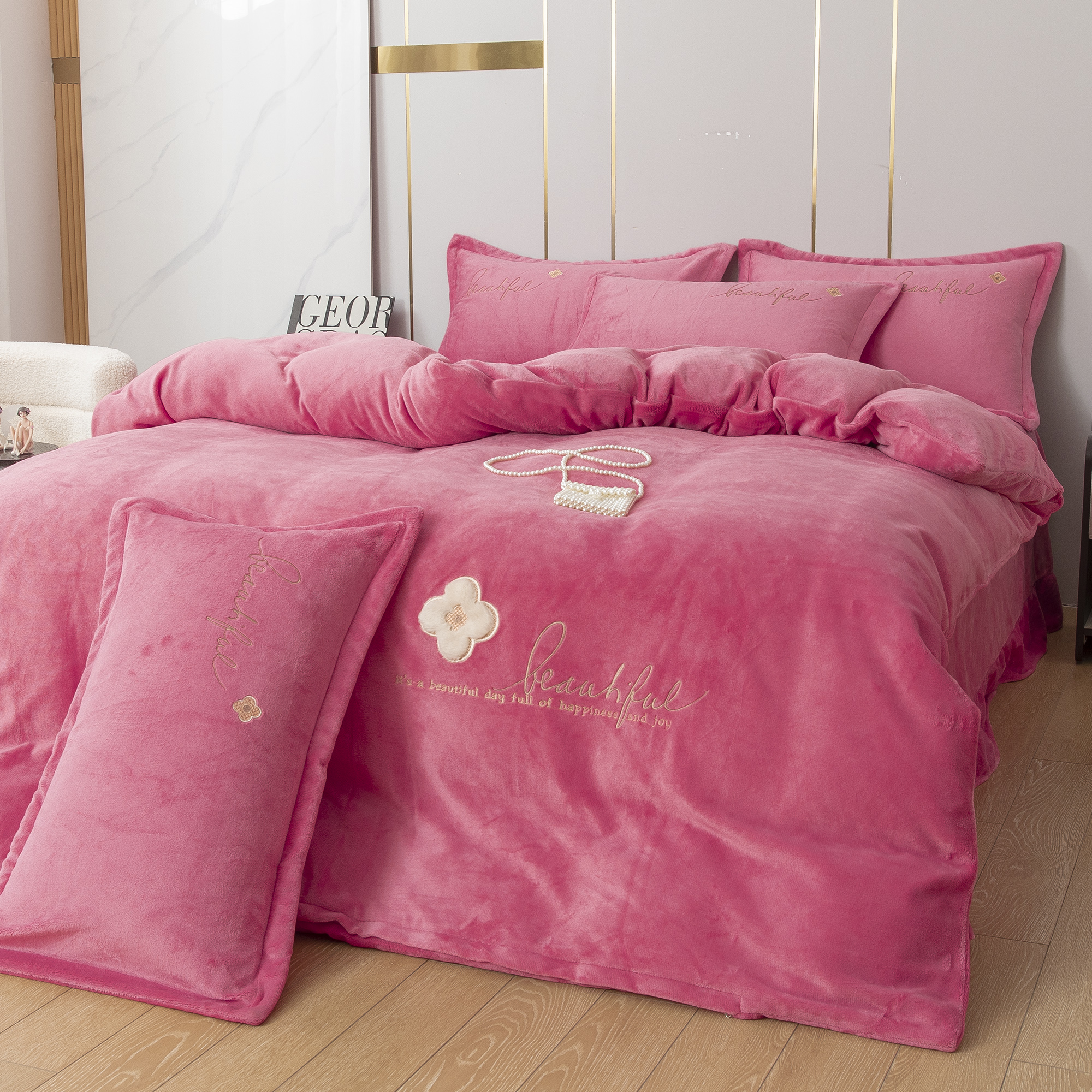 • 91家纺网 家纺一手货源 找家纺 贝尔 2025新款纯色高克重牛奶绒刺绣四件套-羽魅 羽魅-粉色,羽魅-粉色