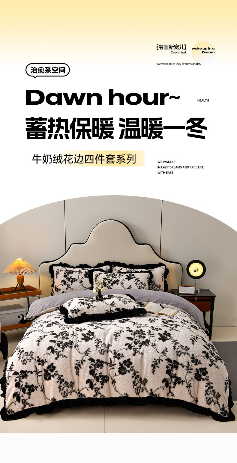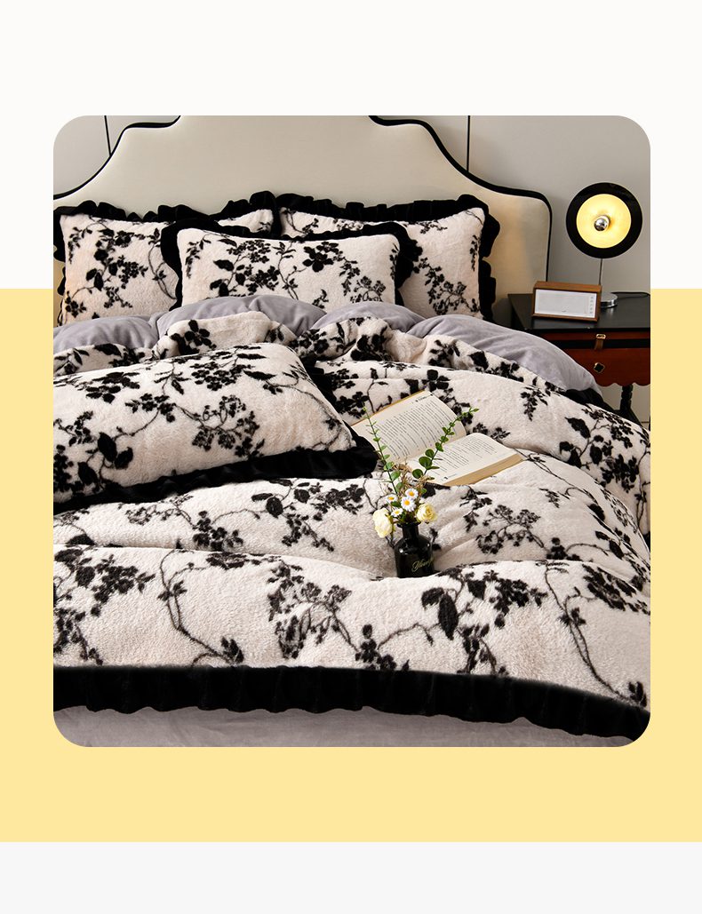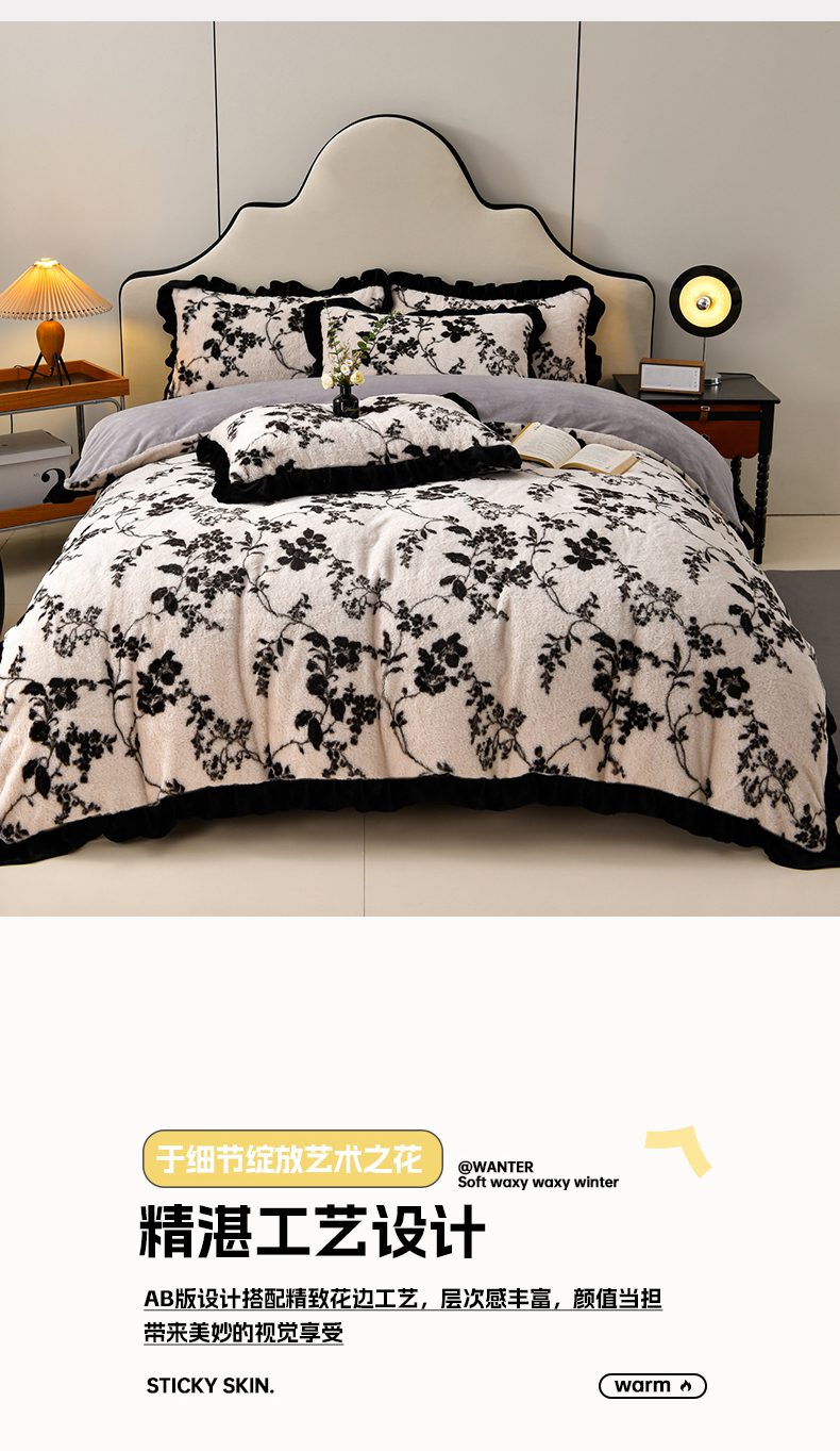 畅畅家纺 2025新款冬季9斤重加厚皮草绒兔毛绒轻奢赫本风牛奶绒花边四件套 轻奢-树影