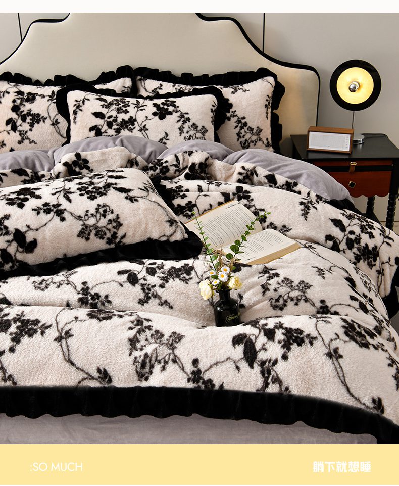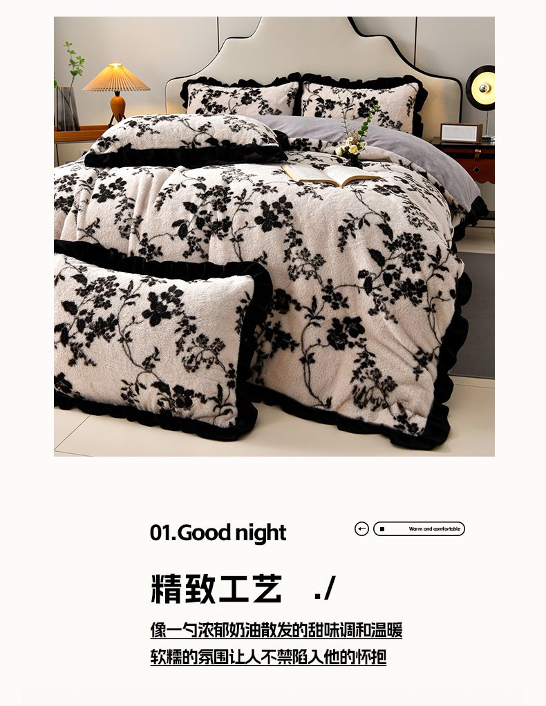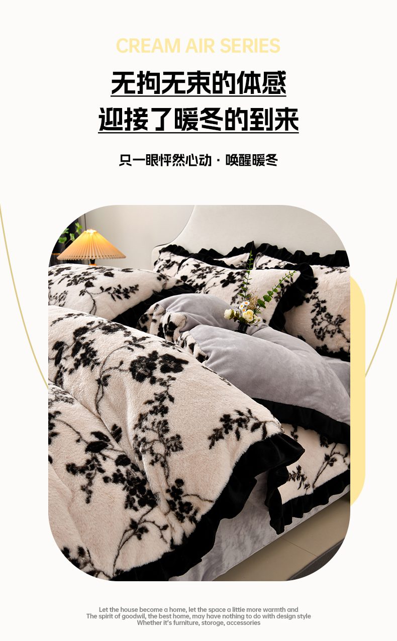 商品名称:畅畅家纺 2025新款冬季9斤重加厚皮草绒兔毛绒轻奢赫本风牛奶绒花边四件套 轻奢-树影