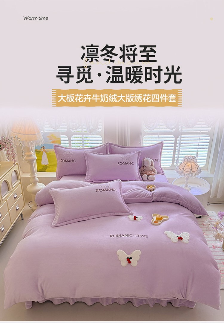 漫布云2025秋冬新款11斤230g全消光牛奶绒夹棉床盖款四件套纯色蕾丝花边刺绣床裙款床盖,蝶恋花-梦幻紫, 蝶恋花-嫩黄, 蝶恋花-新芽绿 ,蝶恋花-婴儿蓝 ,蝶恋花-樱花粉