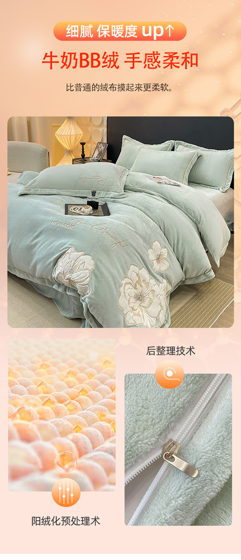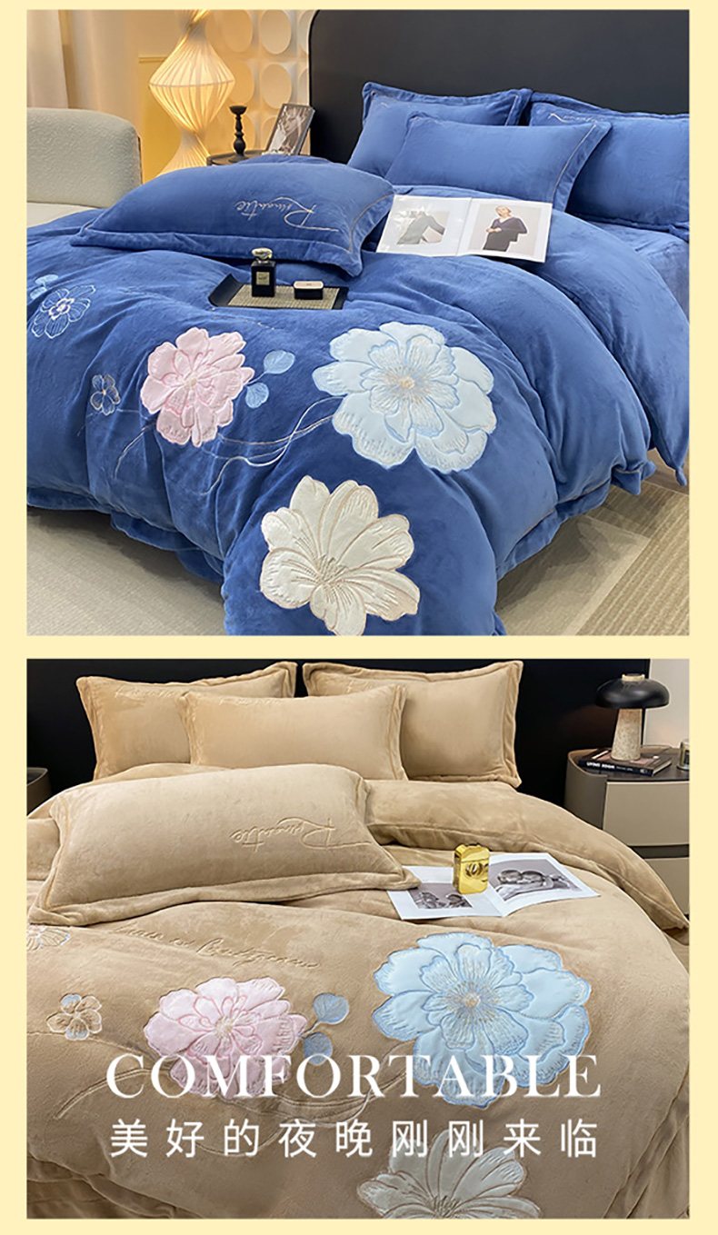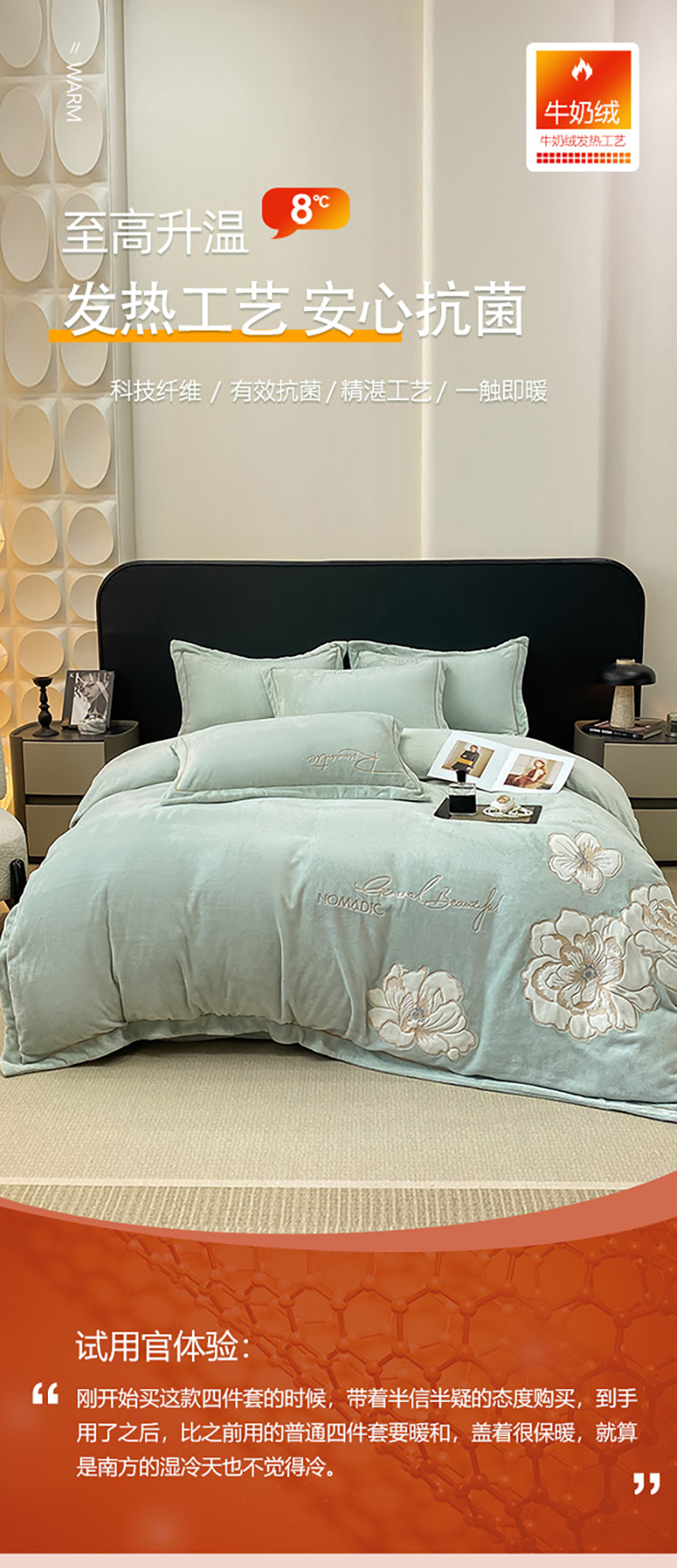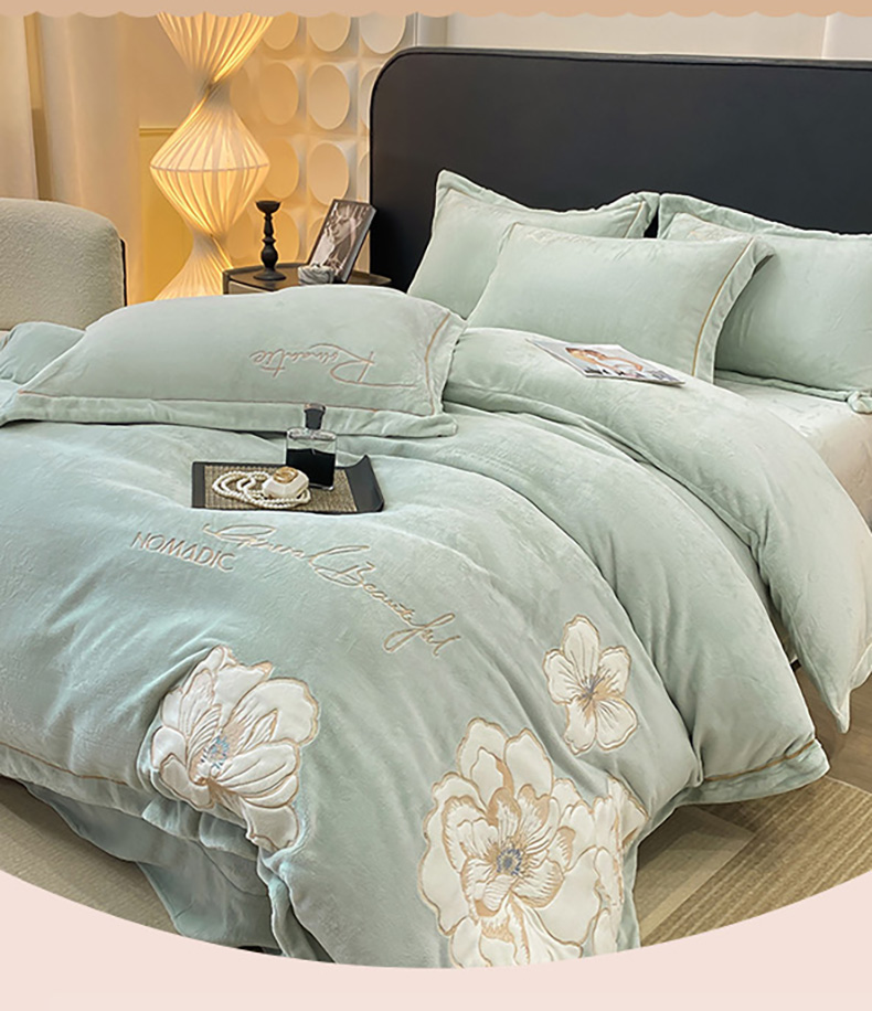 当前位置: 91家纺网 > 商品网购 > 床品套件 > 四件套 > 牛奶绒四件套 > 悦织湾家纺 2025新款9斤重牛奶绒四件套纯色贴布绣人件富贵系列240克重高密保暖轻奢时尚床上用品4件套 人间富贵-草蓝
