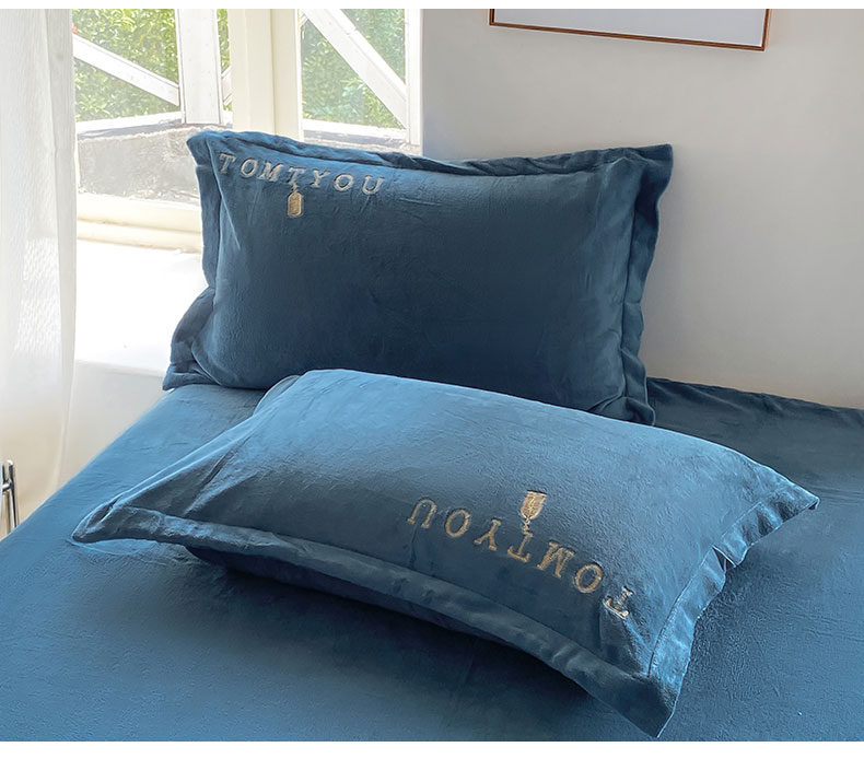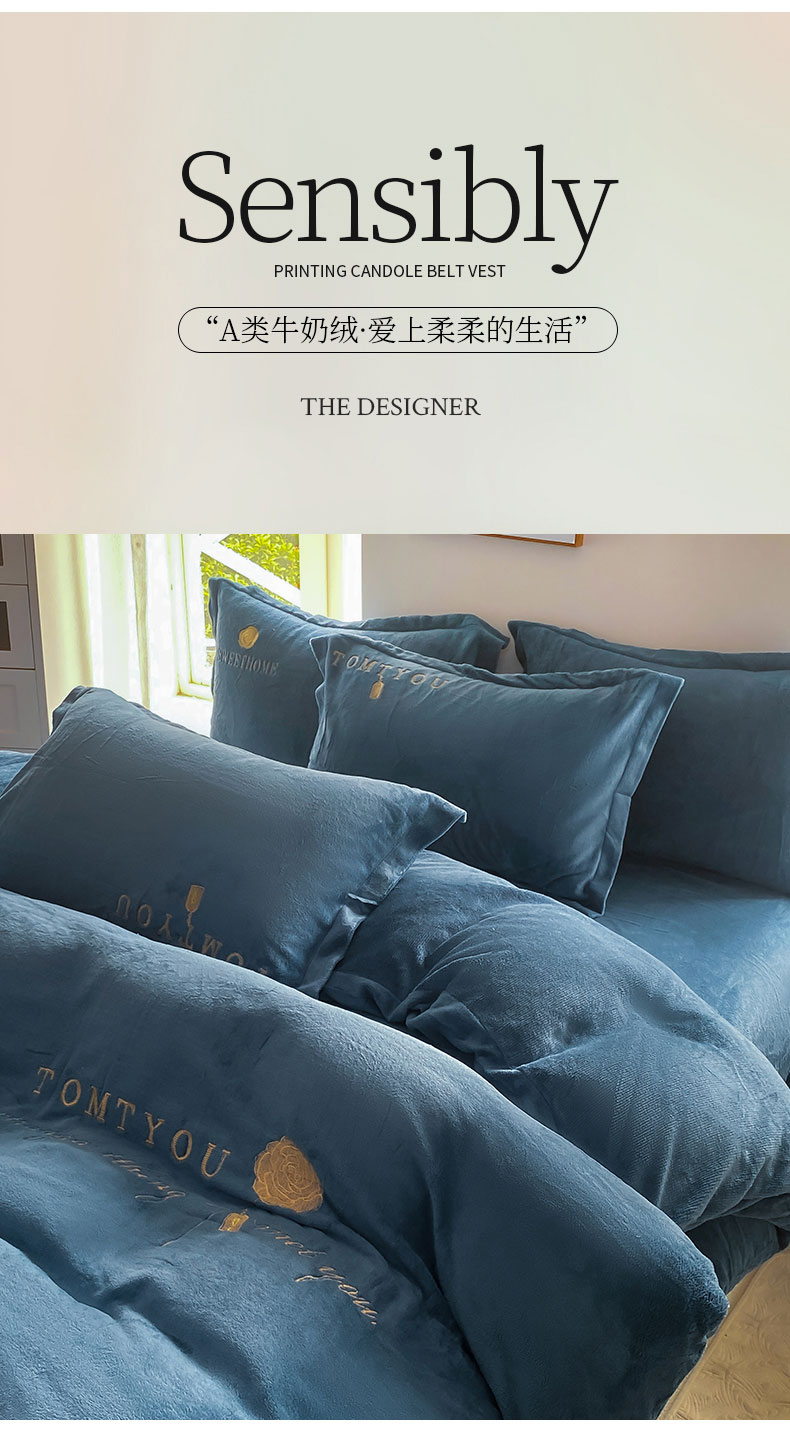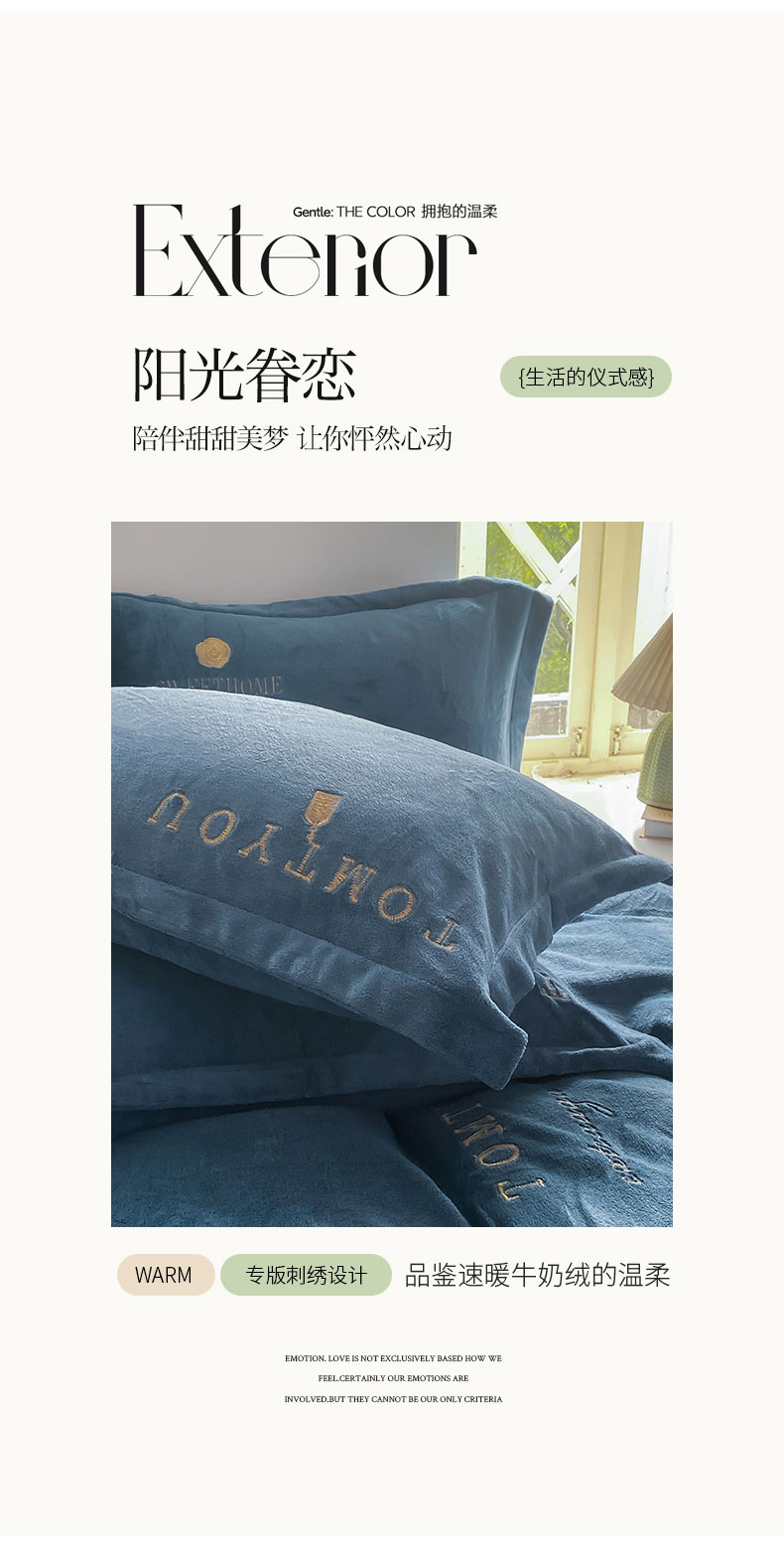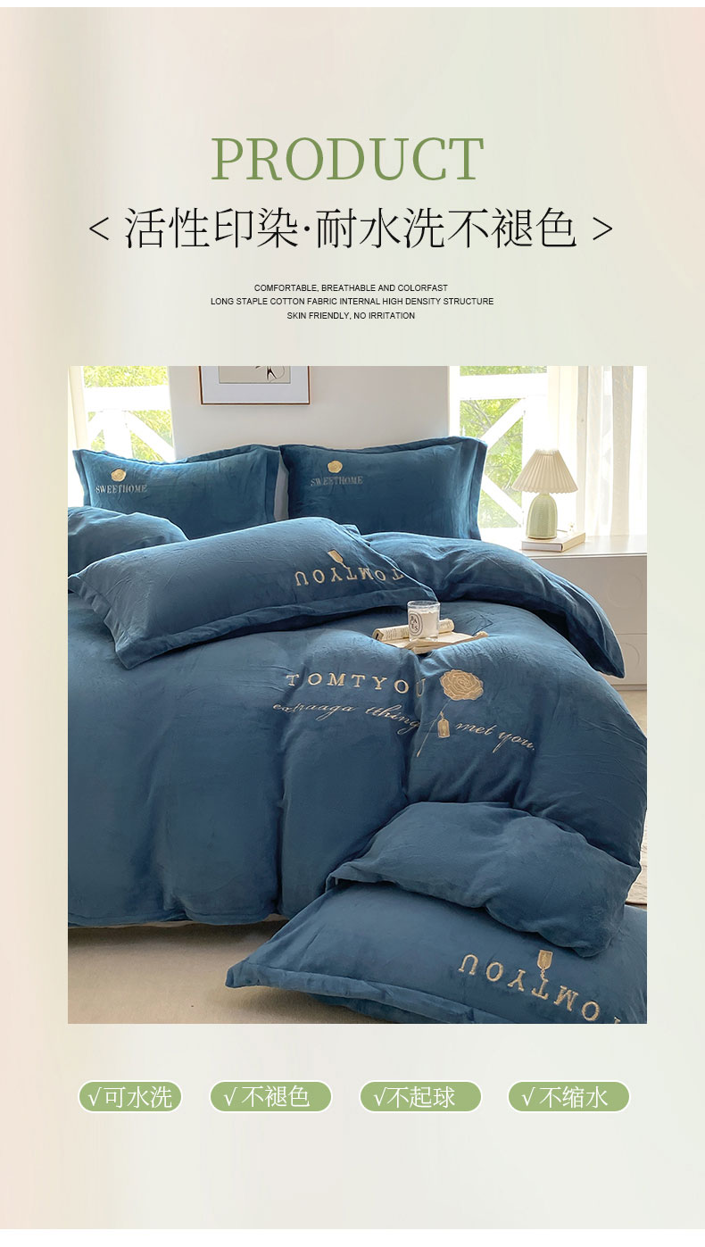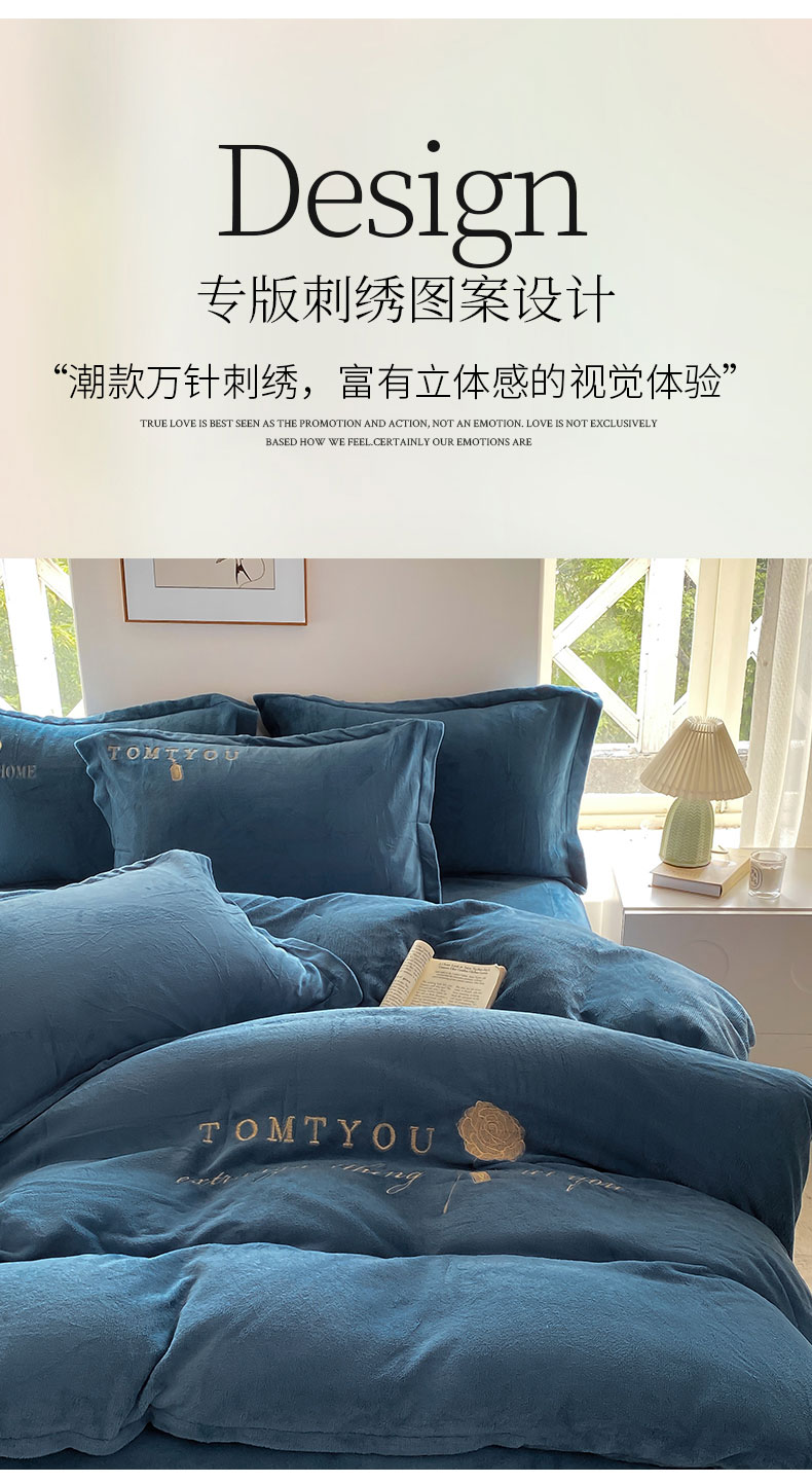 悦织湾家纺 2025新款绣花200克重牛奶绒四件套刺绣3.5万针7斤重高密加厚保暖跨境专供外贸出口电商热销款 玫瑰-宾利蓝