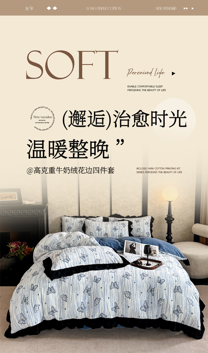 (总)大米家居 2025新款牛奶绒织带轻奢工艺款四件套-卡夫系列,卡夫-暖白,卡夫-柔粉,卡夫-湛蓝