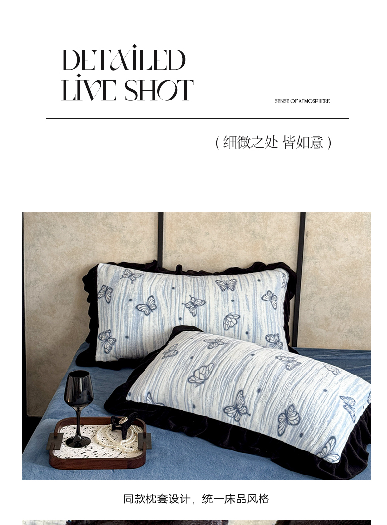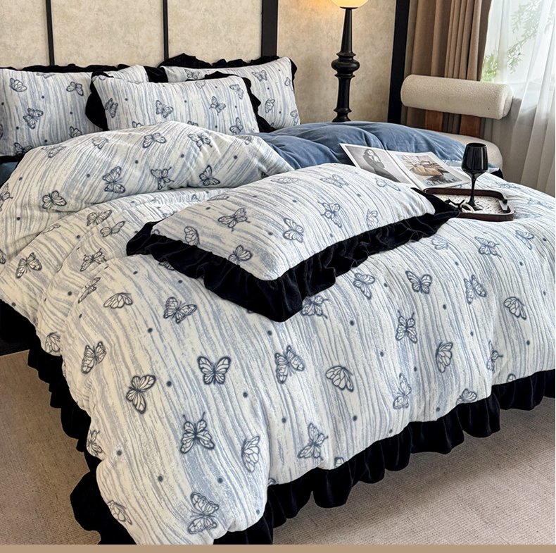 商品名称:大米家居 2025新款韩版美拉德风高克重雕花牛奶绒四件套-梦蝶系列 梦蝶-蓝