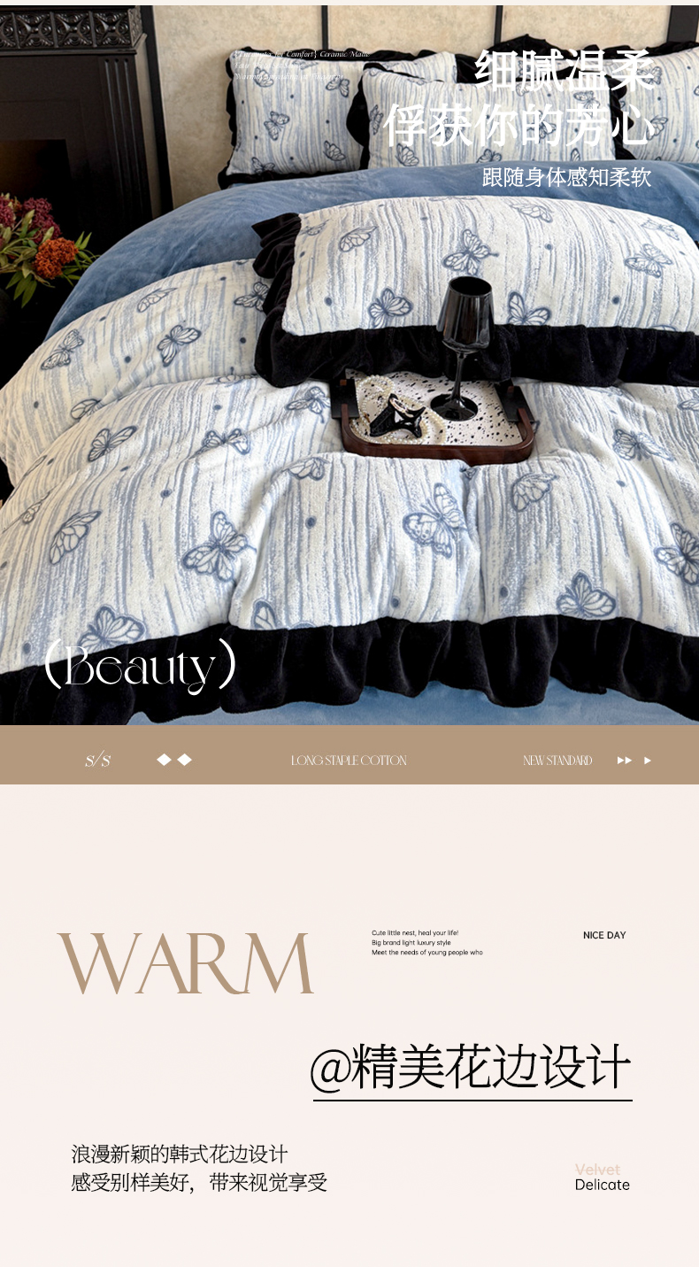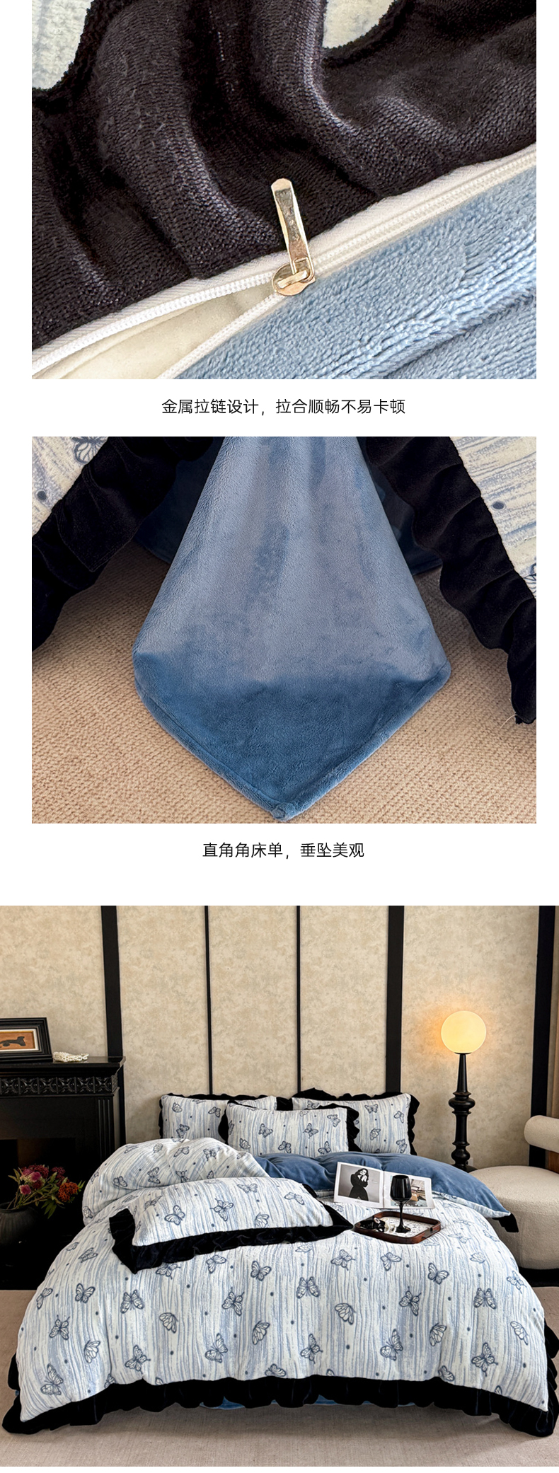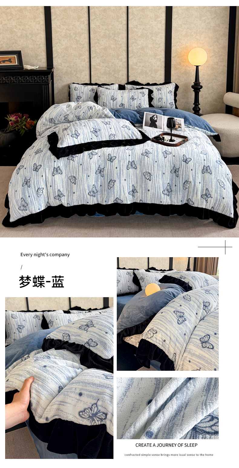 大米家居 2025新款韩版美拉德风高克重雕花牛奶绒四件套-梦蝶系列 梦蝶-蓝