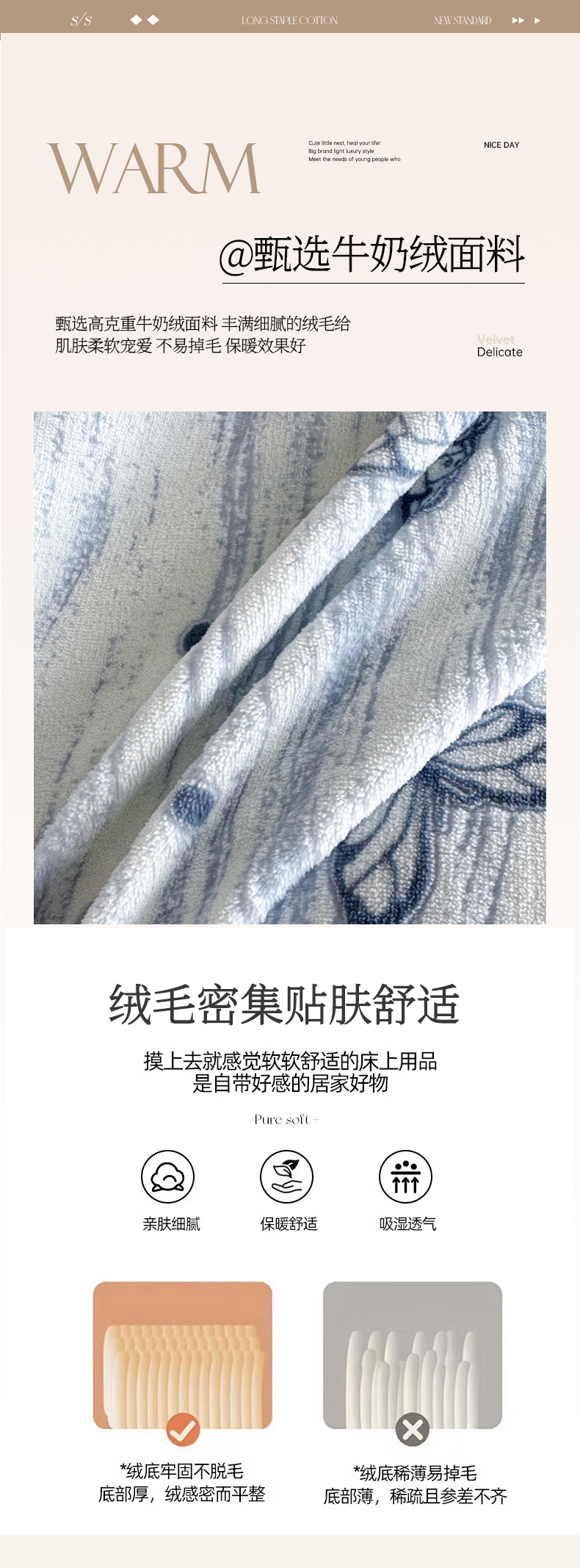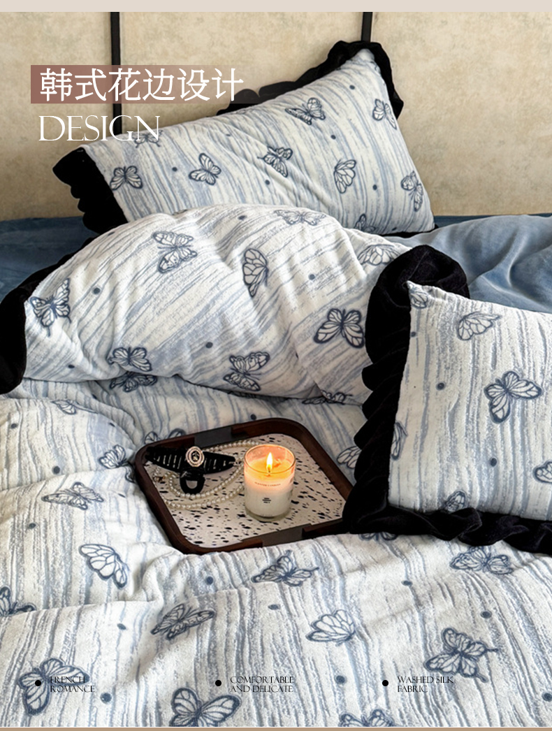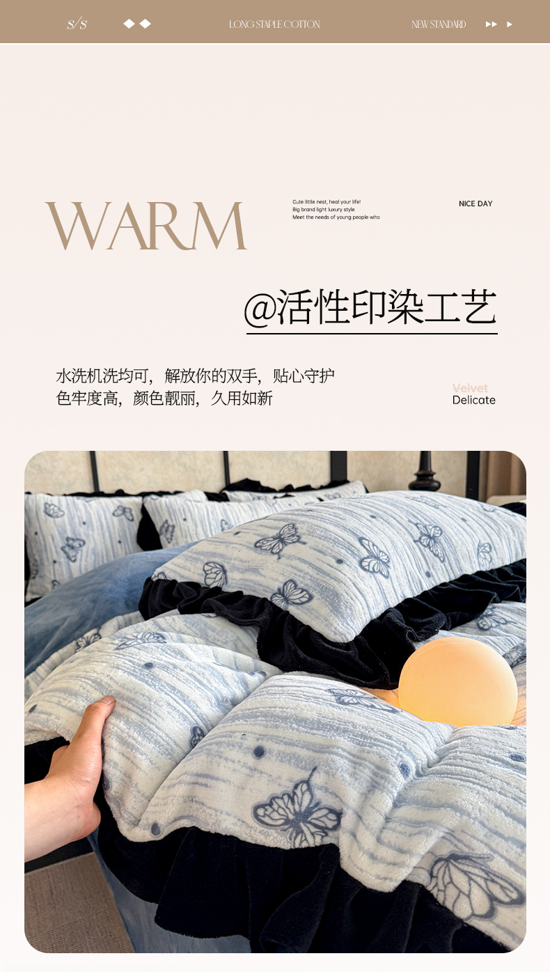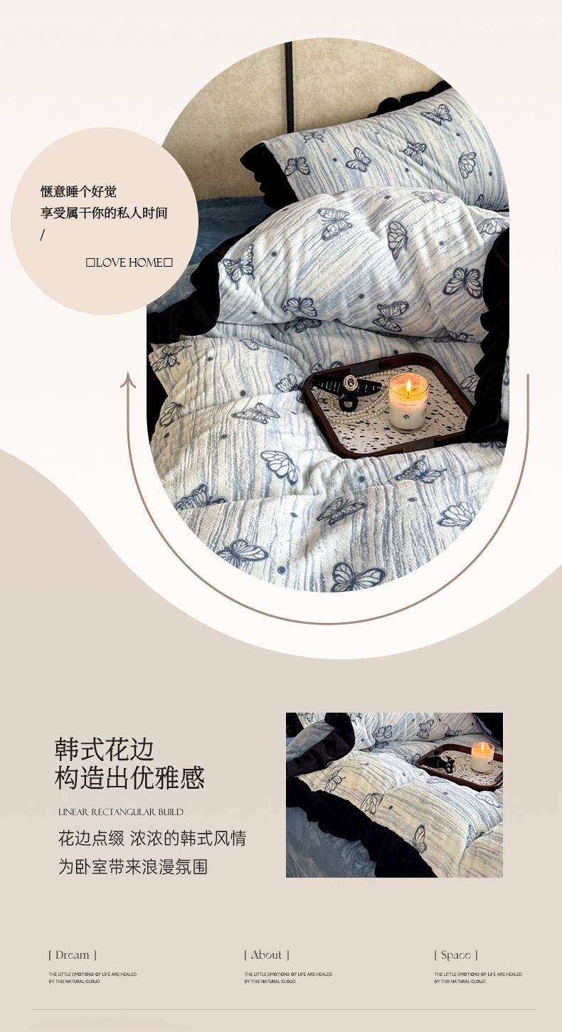 大米家居 2025新款韩版美拉德风高克重雕花牛奶绒四件套-梦蝶系列 梦蝶-蓝