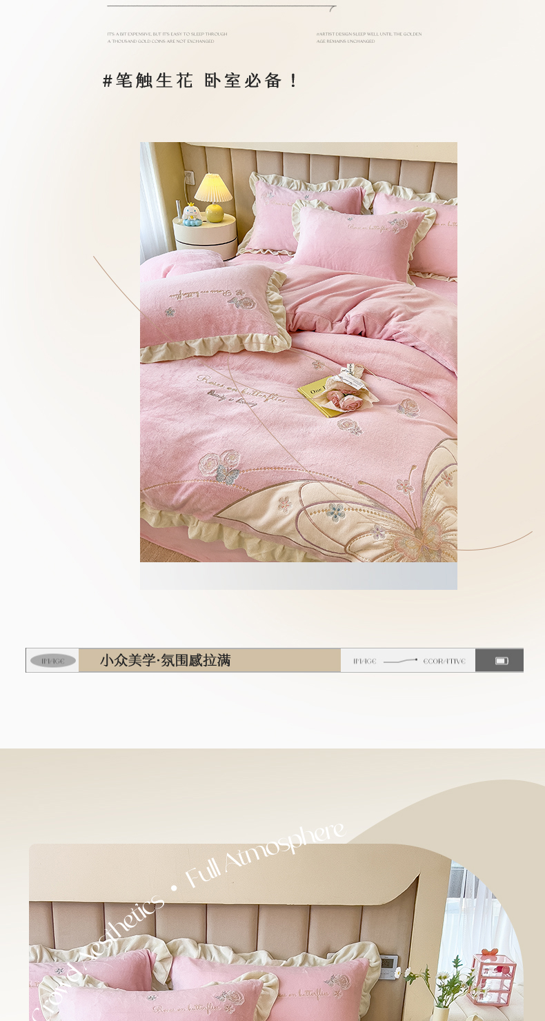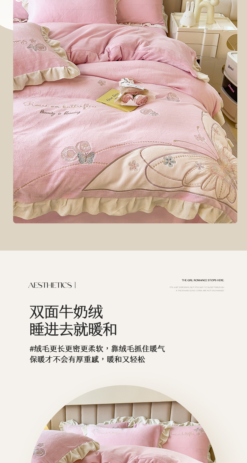 商品名称:曲之慕 2025新款韩版牛奶绒花朵贴布绣四件套 花韵-少女粉