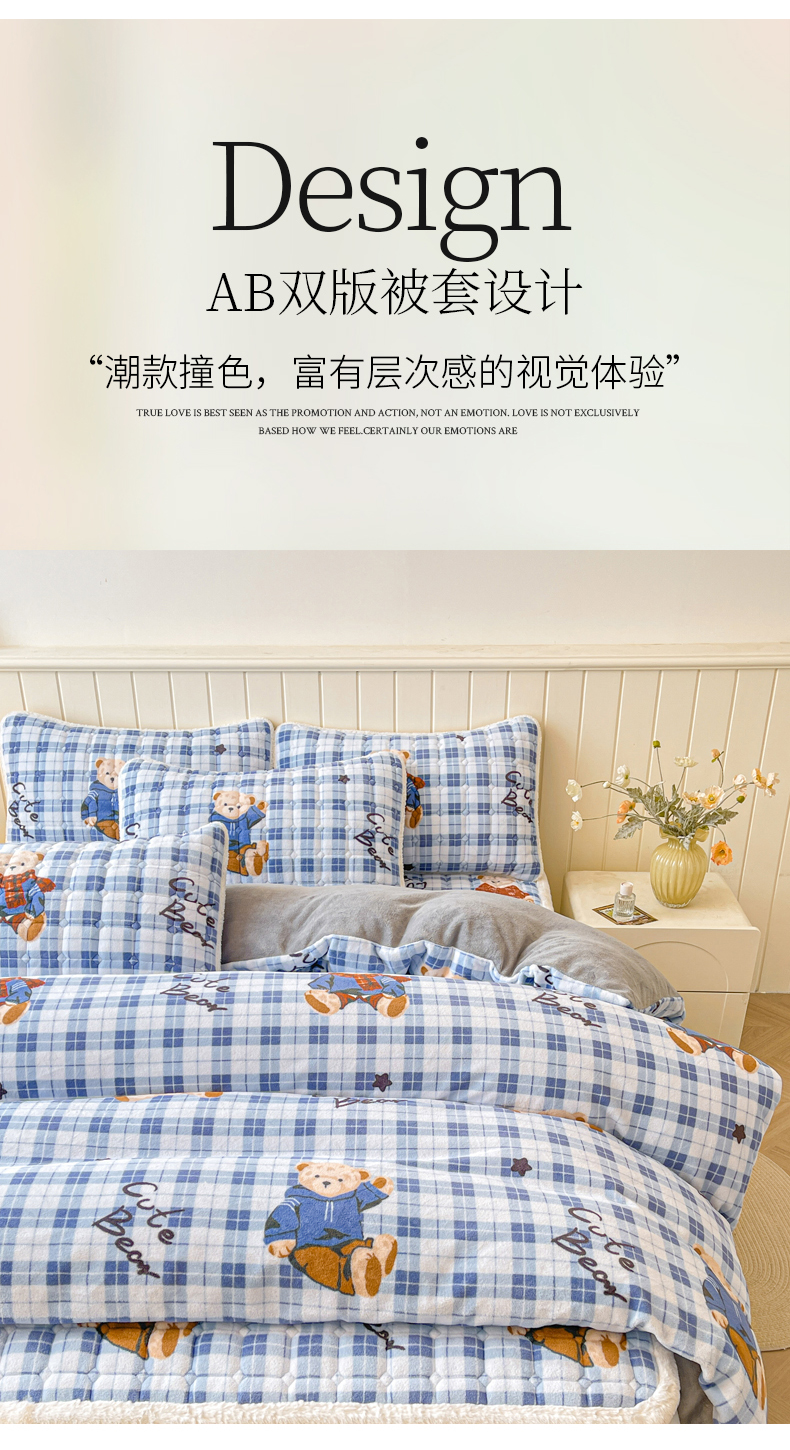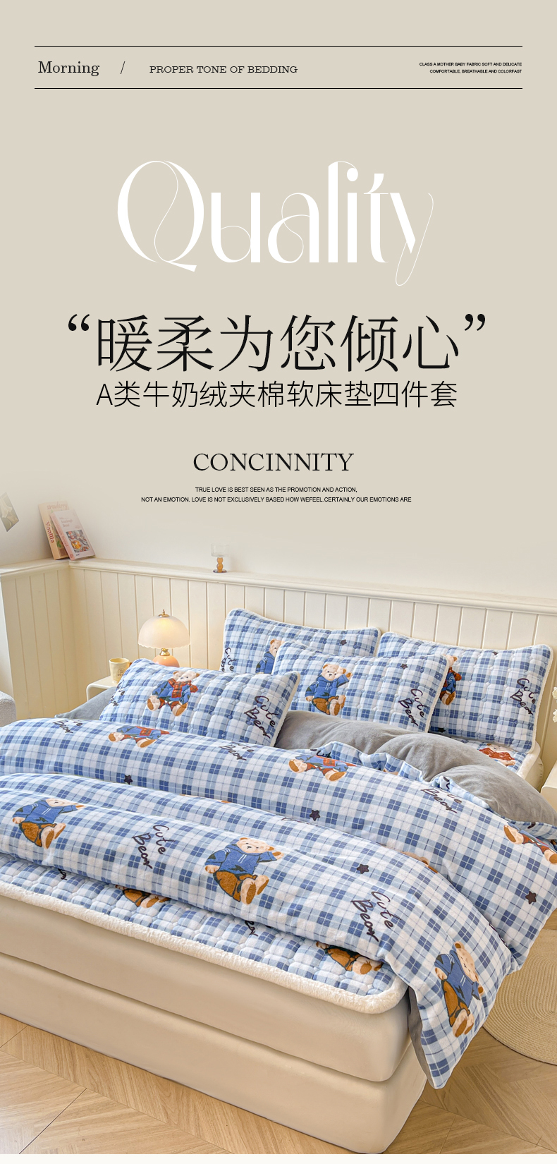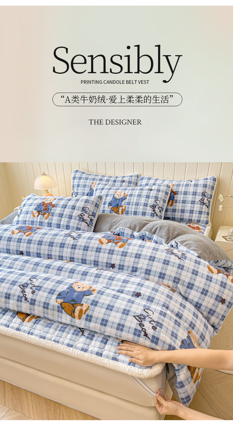 商品名称:LIFE.丽芙 2025秋冬新款A类牛奶绒加厚夹棉床褥垫+被套组合四件套 冬日小熊
