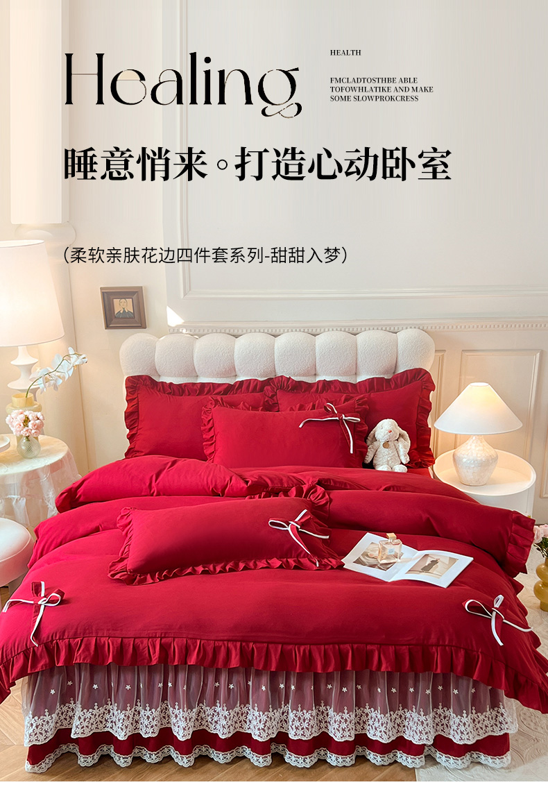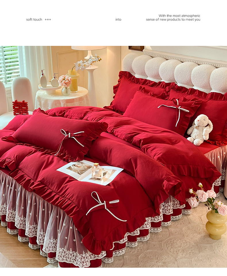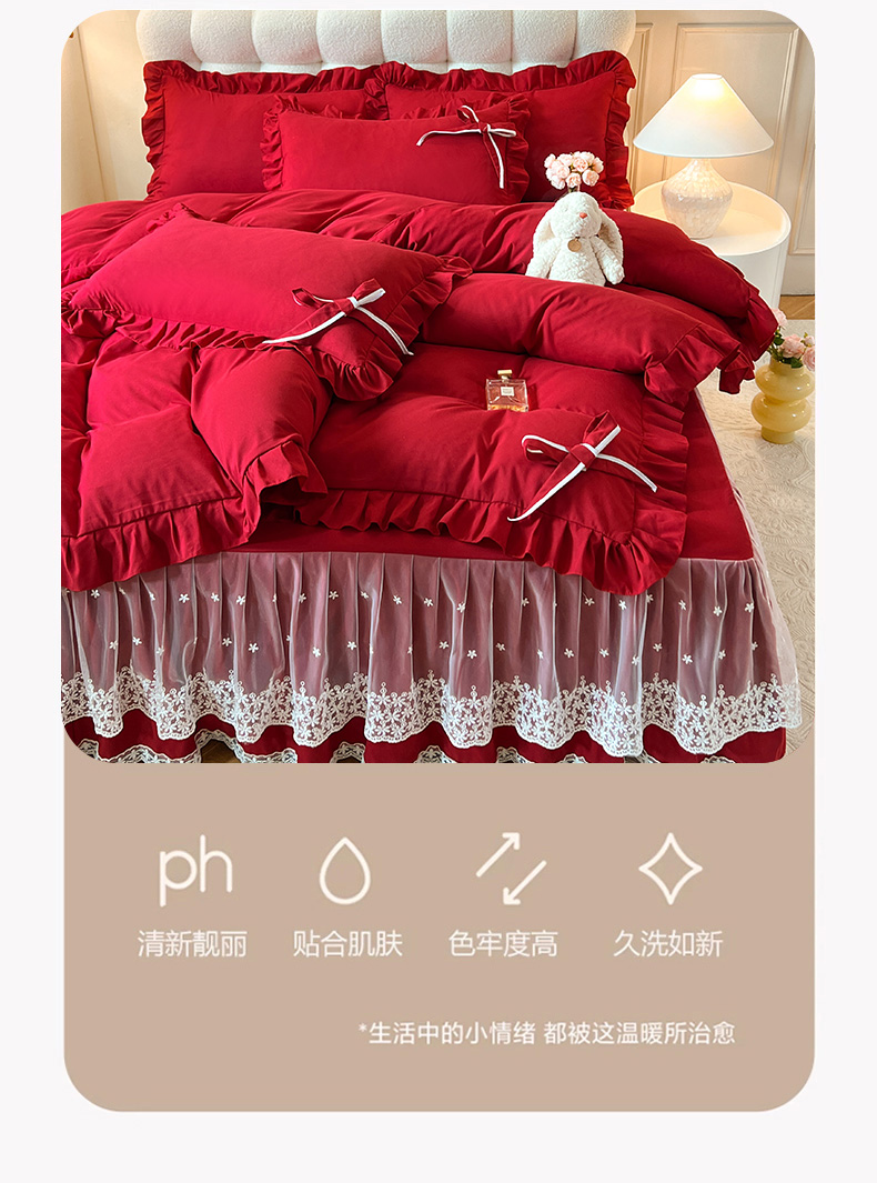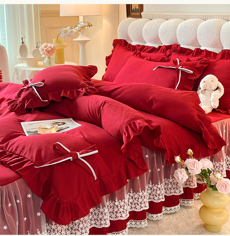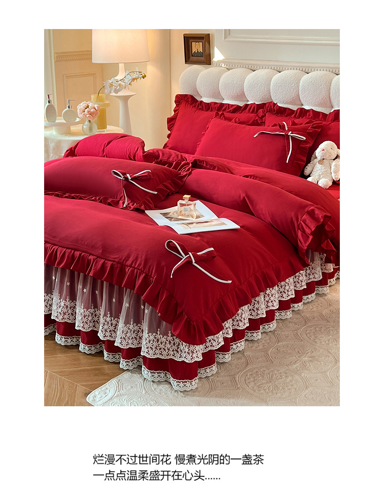 后庭寝室 2025新款亲肤舒适柔软亲肤花边蝴蝶结四件套-如愿 如愿-酒红