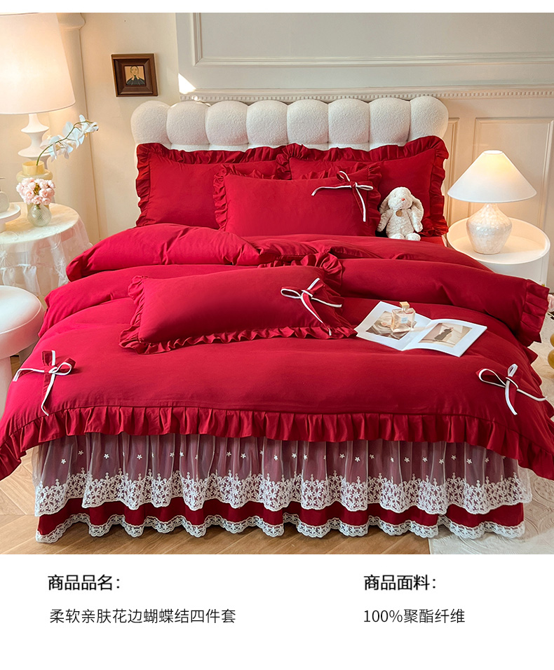 商品名称:后庭寝室 2025新款亲肤舒适柔软亲肤花边蝴蝶结四件套-如愿 如愿-酒红