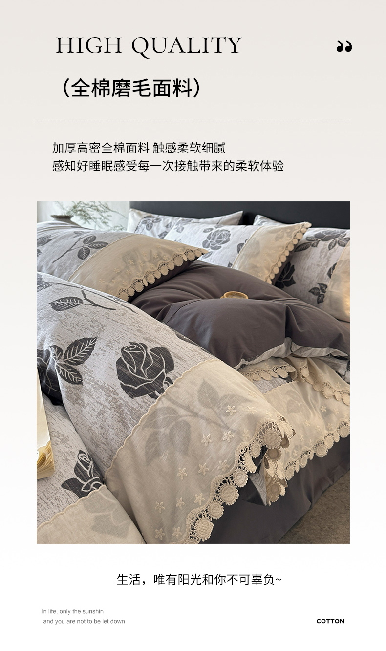 商品名称:宜代光年 2025新款全棉磨毛花边四件套 岁月留声~灰