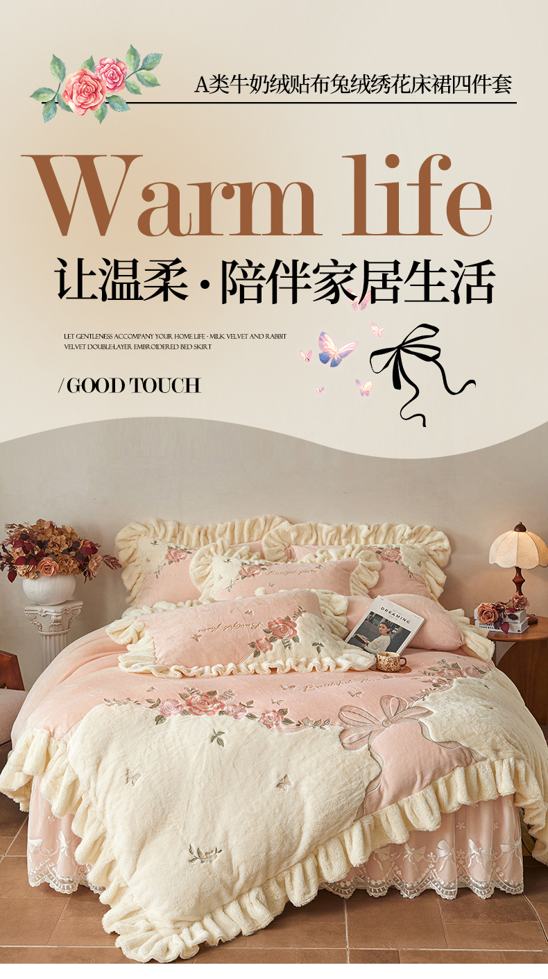 (总)宜凡家纺 2025新款兔绒提花牛奶绒夹棉床裙四件套,爱心 少女粉,爱心 粉紫,爱心 驼色,蝶舞 大红,蝶舞 米色,蝶舞 浅紫,蝶舞 玉色,简爱 苍青,简爱 豆沙紫,简爱 玉色,樱桃 苍青,樱桃 豆沙紫,樱桃 奶油白