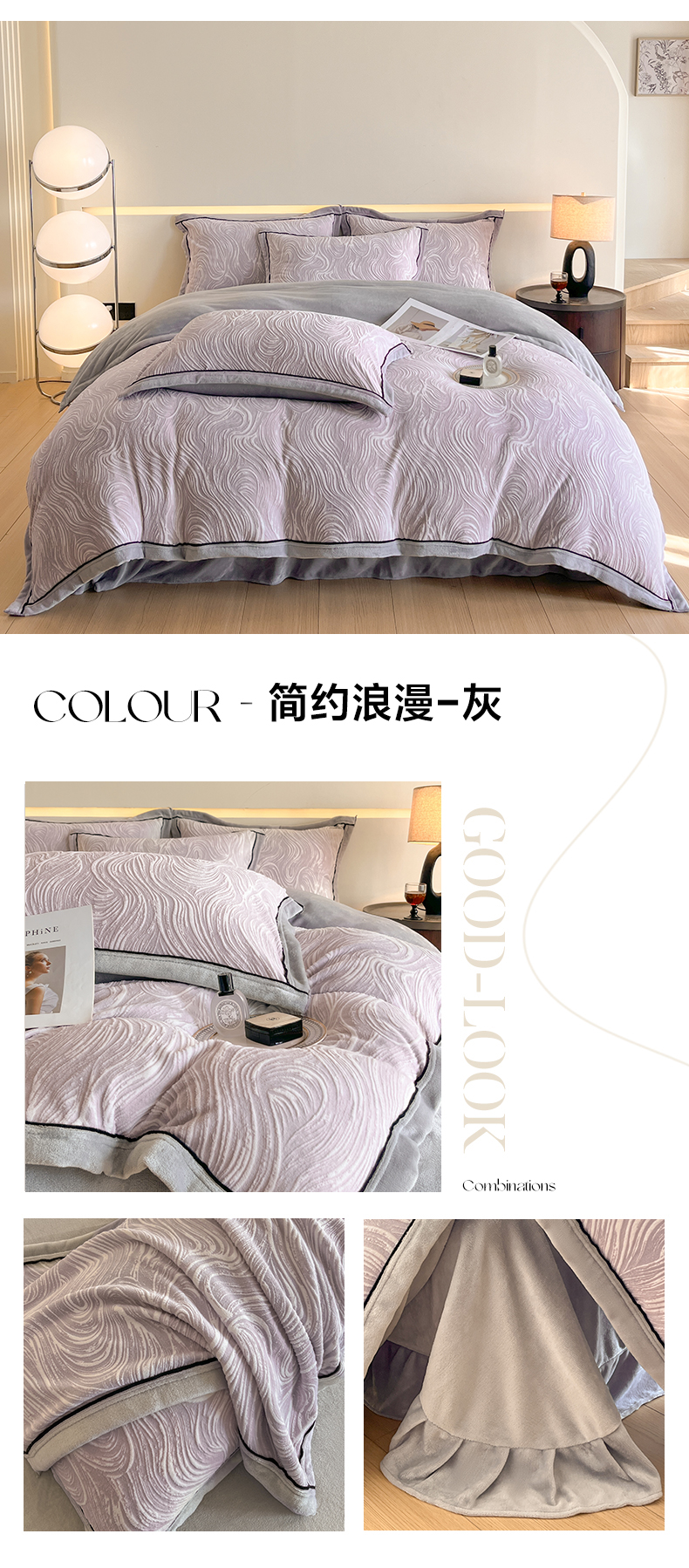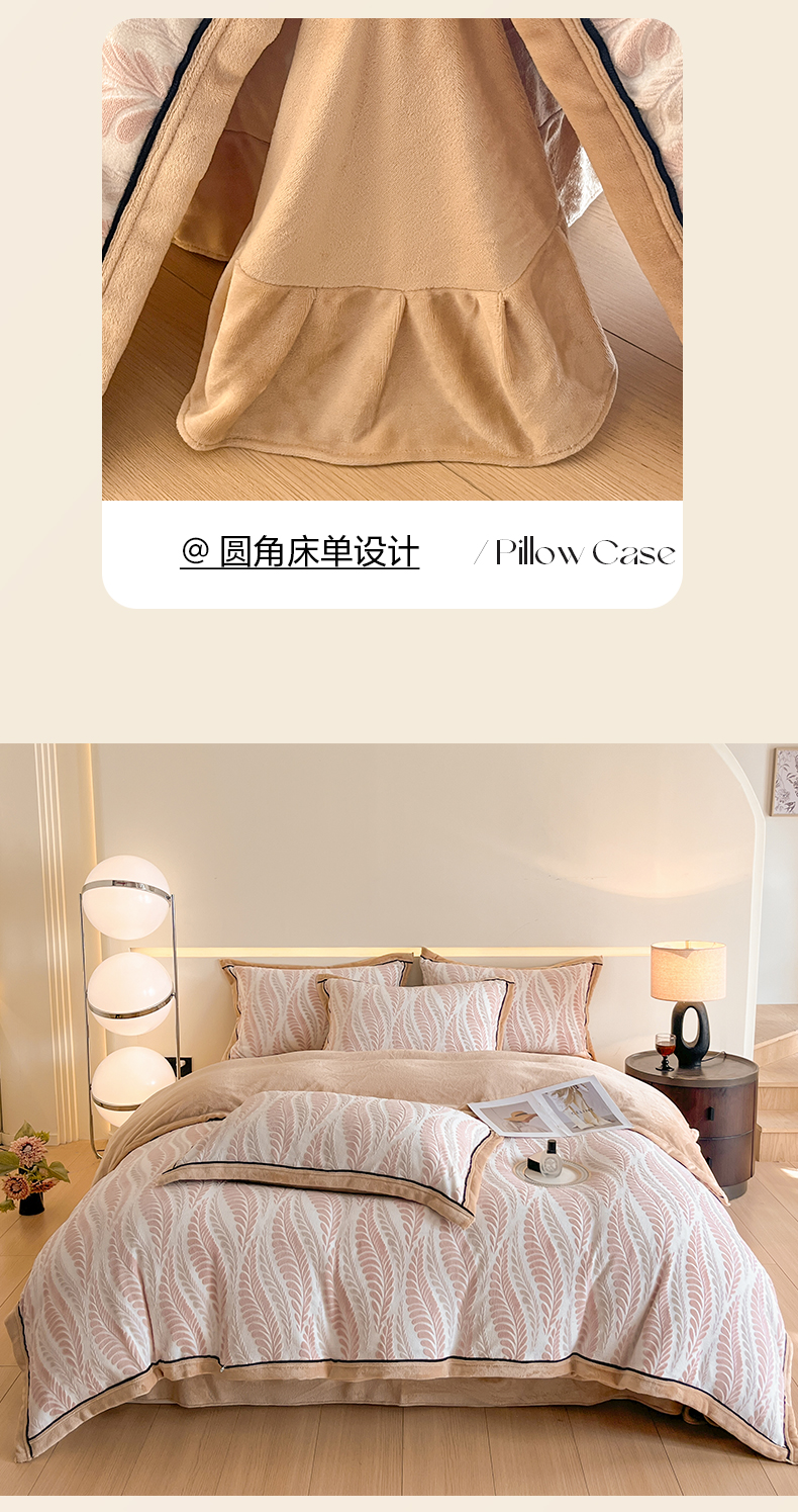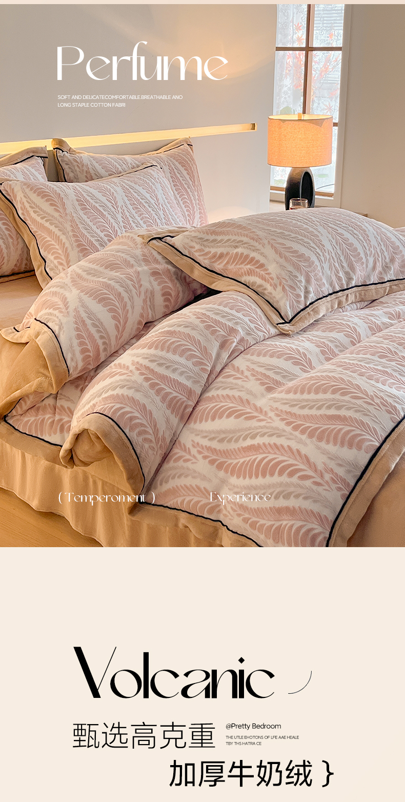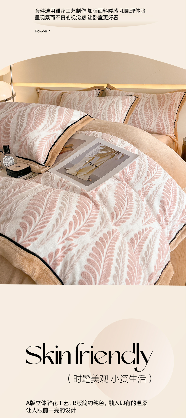 畅畅家纺 2025新款冬季压线款雕花牛奶绒四件套 叶恋-浅粉