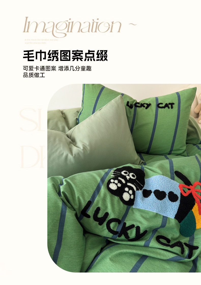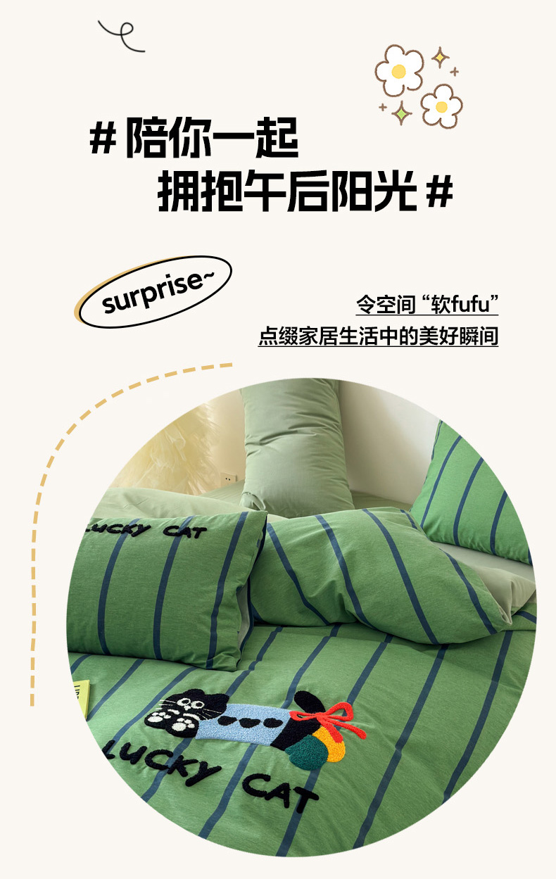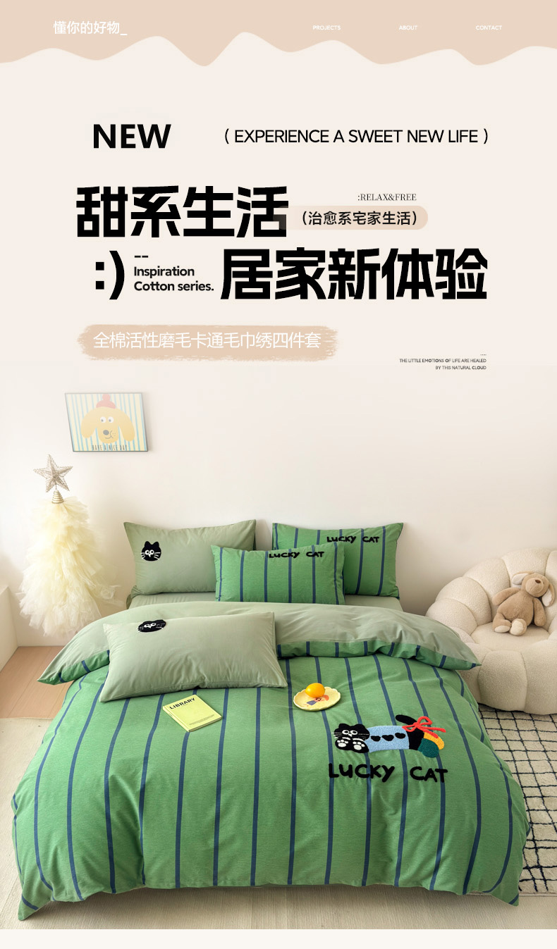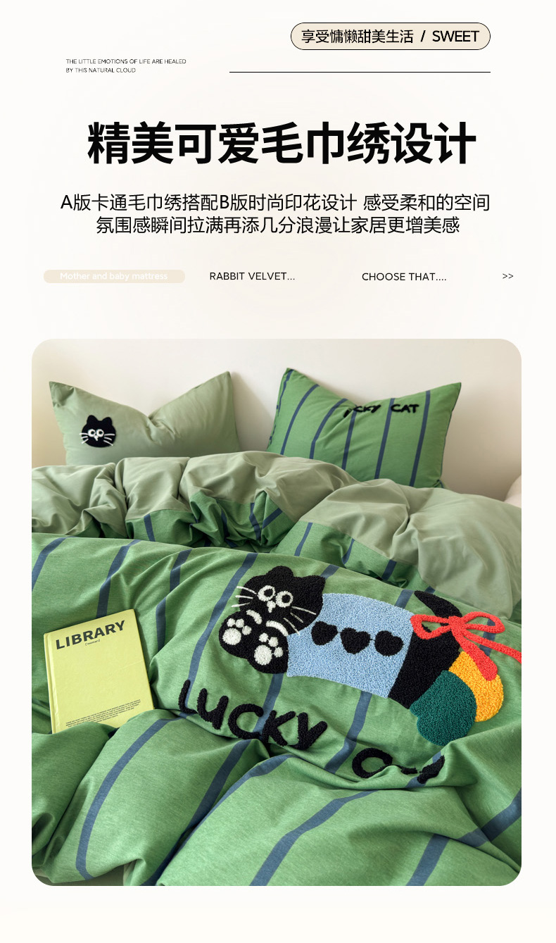 商品名称:如意朵 2025新款全棉加厚磨毛毛巾绣四件套(专版花型) 幸运猫咪